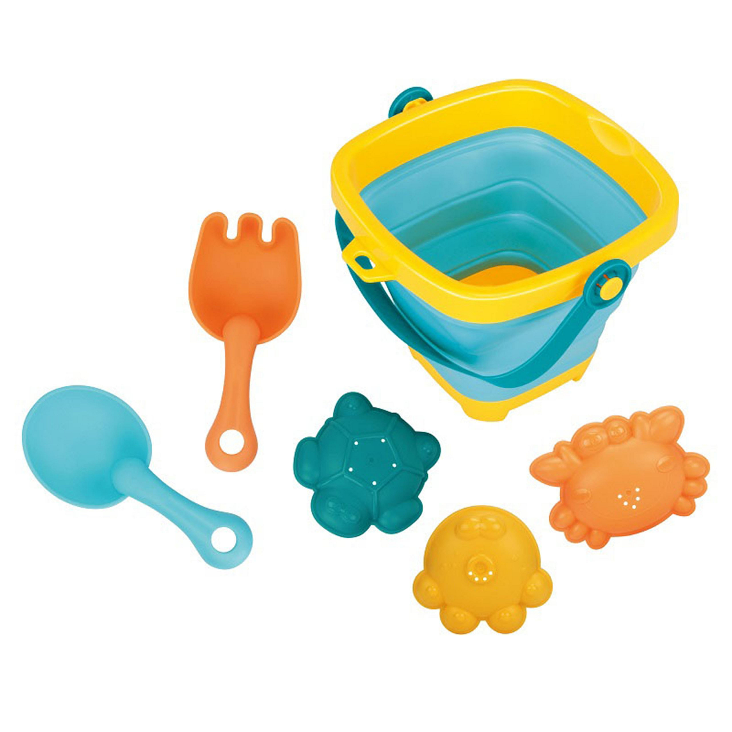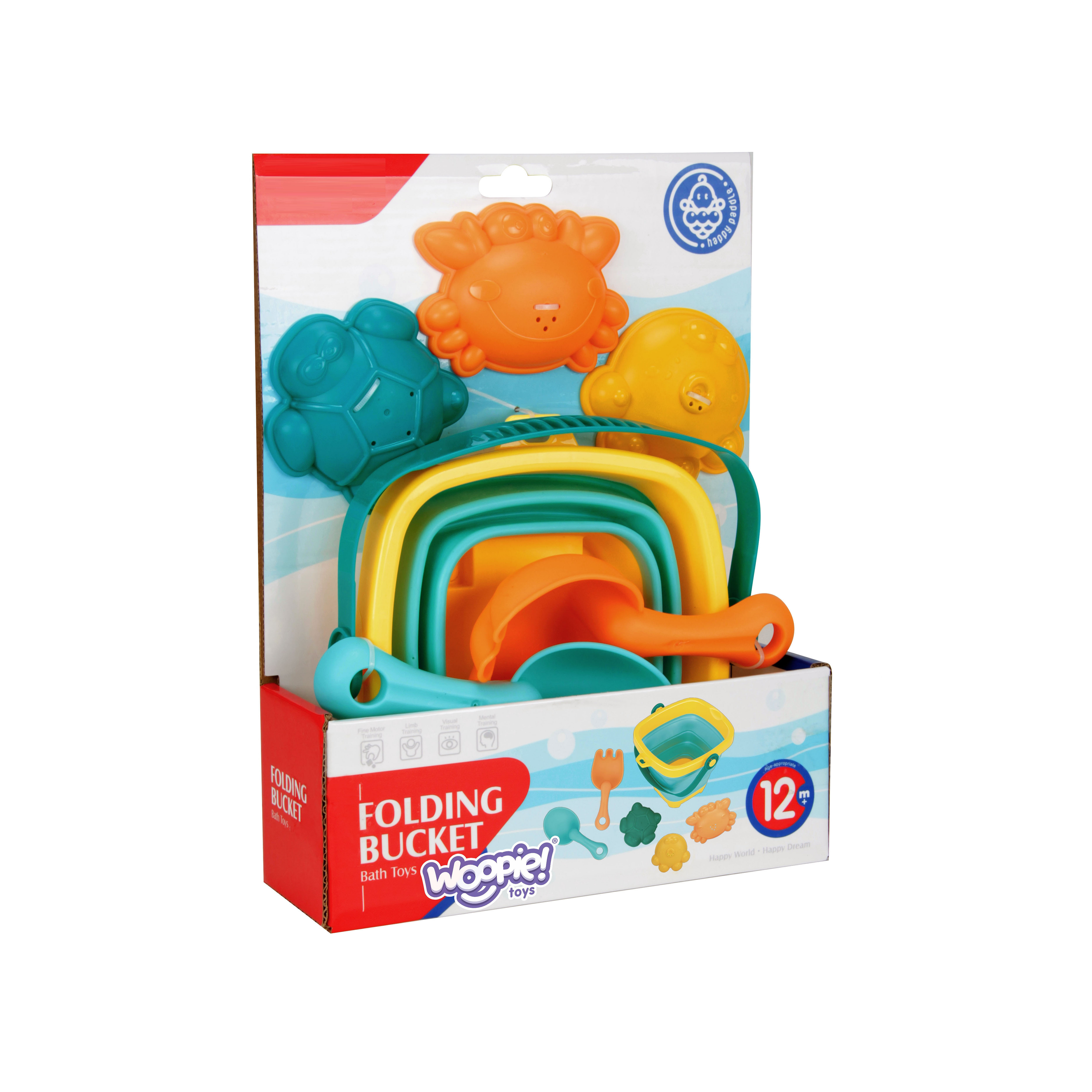 Silikonowe wiaderko z grabkami, łopatką i foremkami od marki WOOPIE. Fantastyczne wiaderko do piaskownicy, na plażę lub do ogrodu, dzięki któremu dzieci miło spędzą czas na świeżym powietrzu. Wiaderko, dzięki składanej konstrukcji, zajmuje niewiele miejsca, jest łatwe w transporcie i wygodne do przechowywania. W zestawie dołączone są trzy foremki do piasku. Zestaw zmieści się do dziecięcego plecaczka, do wózka czy plażowej torby. Góra, spód i rączka wiaderka są plastikowe, a ścianki wykonane są z grubego silikonu składanego harmonijkowo. Plastikowe są również grabki i łopatka.