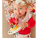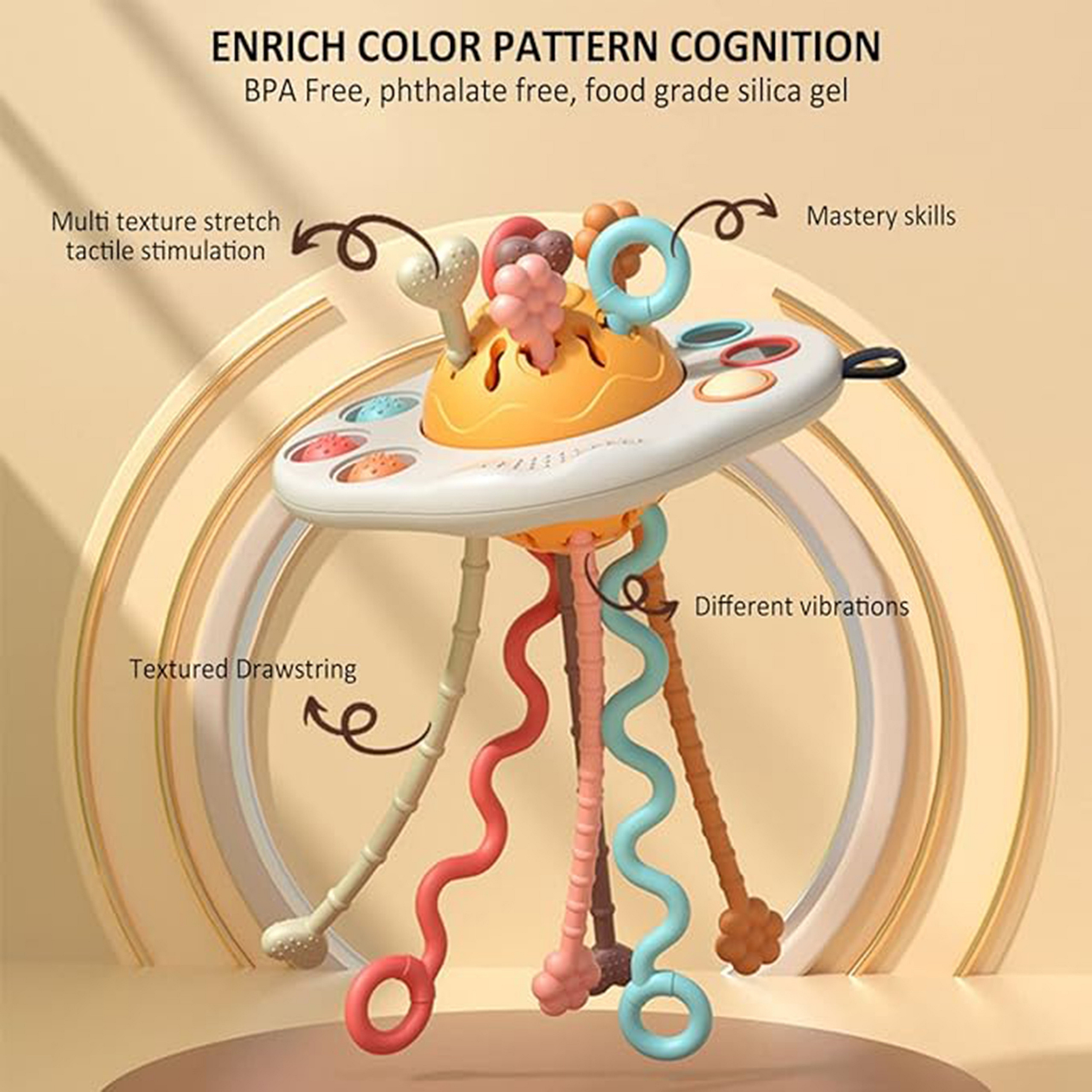 Zabawka Sensoryczna Montessori Gryzak UFO od marki WOOPIE to innowacyjny i wielofunkcyjny produkt stworzony z myślą o najmłodszych. Zaprojektowana w intrygującym kształcie statku kosmicznego, skutecznie przyciąga uwagę malucha, a jej bogata kolorystyka wspomaga naukę rozpoznawania barw. Głównym zadaniem tej wyjątkowej zabawki jest wszechstronna stymulacja zmysłów dziecka oraz zapewnienie mu ulgi w trudnym okresie ząbkowania. Zabawka została wyposażona w różnorodne elementy manipulacyjne. Posiada miękkie, kolorowe guziki oraz sznurki o odmiennych fakturach, które zachęcają do chwytania, przeciągania i dotykania. Podczas pociągania za sznurki zabawka generuje delikatne dźwięki i wibracje, dostarczając dodatkowych bodźców słuchowych i czuciowych. Specjalny, twardszy guzik można przesuwać w lewo i prawo, co doskonale trenuje precyzję małych paluszków. Wykonanie z bezpiecznego, nietoksycznego silikonu wolnego od BPA gwarantuje pełne bezpieczeństwo podczas żucia i łagodzi ból dziąseł niemowlęcia.