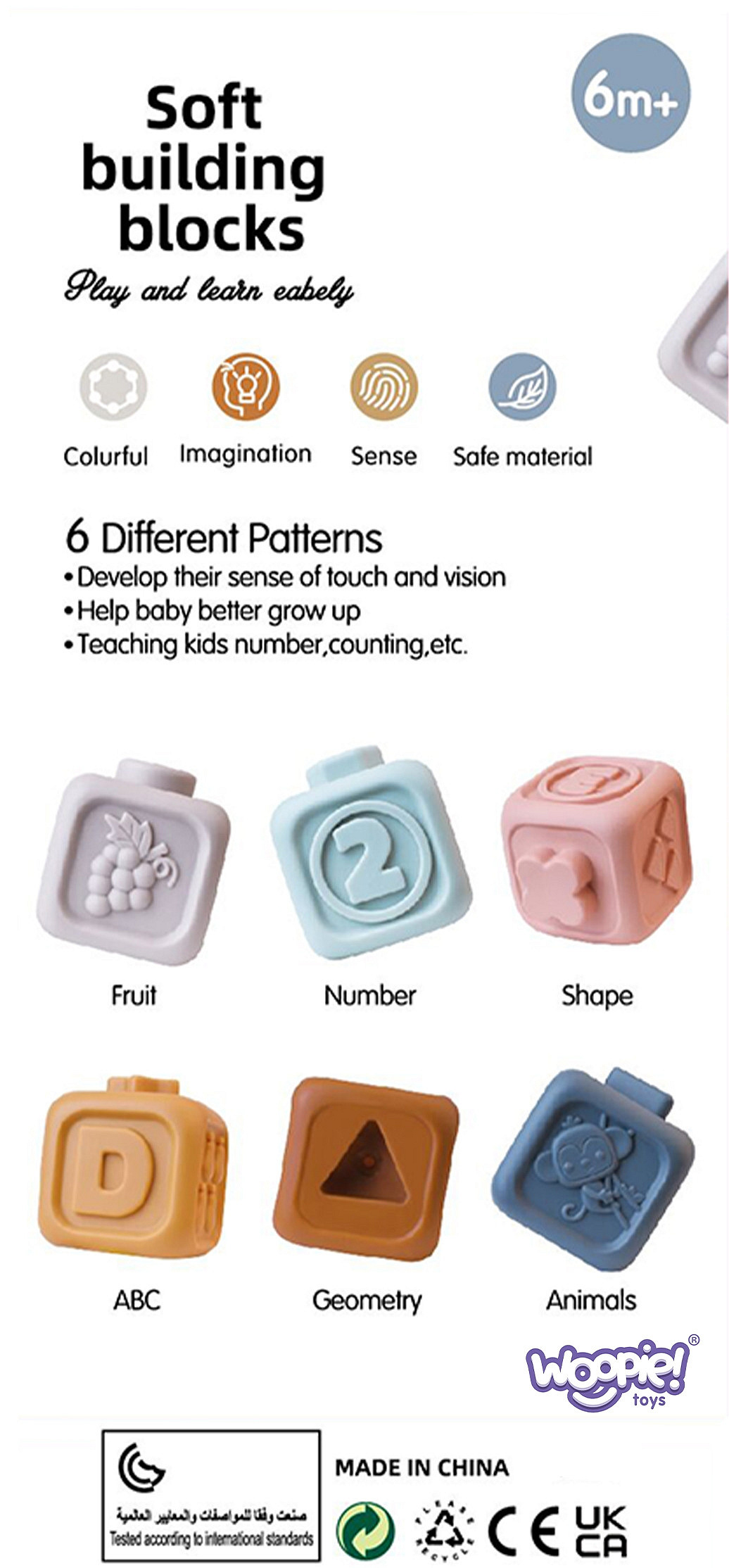 Ten kreatywny zestaw pastelowych klocków z cyferkami od marki WOOPIE jest idealnym wyborem dla najmłodszych dzieci, oferując wiele możliwości edukacyjnych i sensorycznych. Każdy z sześciu klocków wprowadza malucha w świat liczb, jednocześnie rozwijając różne zmysły i umiejętności. Klocki sensoryczne wykonane są z miękkiego, przyjaznego dla dziecka materiału, dzięki czemu mogą pełnić funkcję gryzaka, co przynosi ulgę podczas ząbkowania. Dodatkowo, te wszechstronne klocki mogą towarzyszyć dziecku również podczas kąpieli, dostarczając wiele radości w wodzie. Dzięki wypukłym, dużym liczbą zabawka ułatwia dzieciom pierwsze poznawanie liczb. Zabawka jest wszechstronna, można układać z niej wysoką wieżę, uczyć się liczb a także użyć jako bezpieczny dla dzieci gryzak.