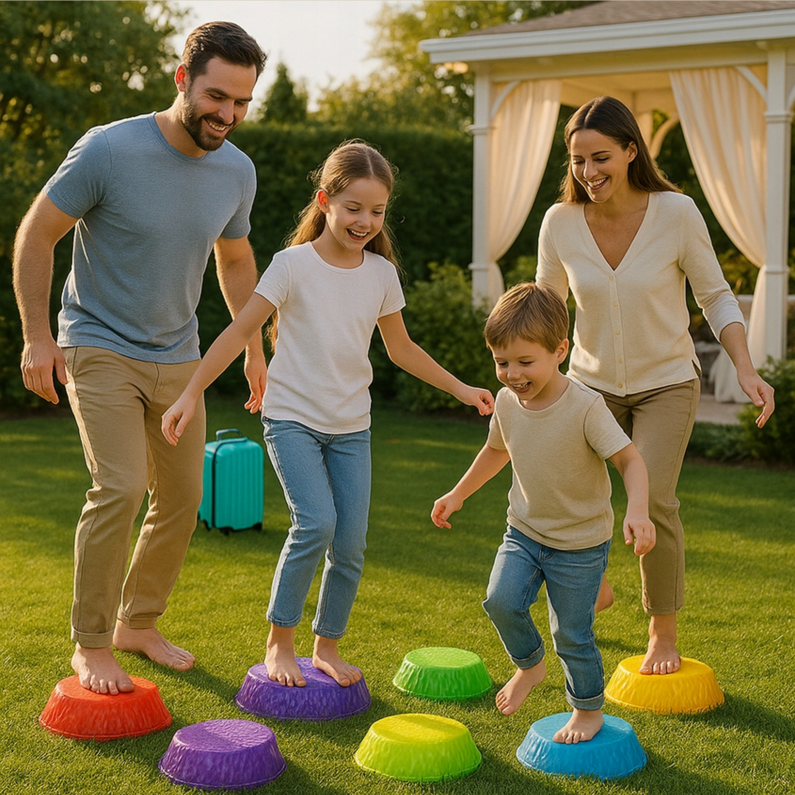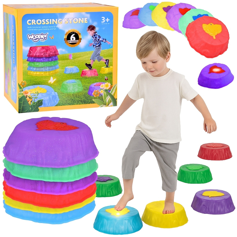 Zestaw Świecących kamieni od marki Woopie to fantastyczna propozycja dla małych poszukiwaczy przygód! 6 kolorowych, świecących kamieni równoważnych pozwala stworzyć tor przeszkód niczym z bajki – zarówno w domu, jak i na świeżym powietrzu. Wchodzenie, przeskakiwanie i balansowanie rozwija u dziecka motorykę, równowagę oraz koncentrację – a przy tym dostarcza mnóstwo frajdy!