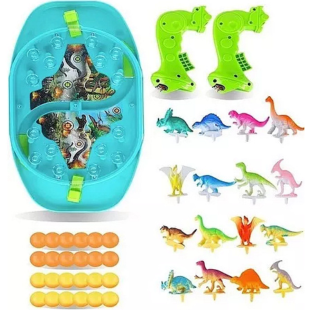 Bitwa Dinozaurów to gra zręcznościowa od marki Woopie. Ta dwuosobowa strzelanka w dinozaury znacznie poprawi zdolności koordynacyjne. Rozłóż dinozaury na planszy w odpowiednich miejscach. Wrzuć kulki do uchwytu i pociągnij za spust aby zbić dinozaury. Wygrywa gracz, który szybciej zbije kulkami dinozaury z planszy przeciwnika. Zestaw zawiera planszę do gry w plastikowa osłoną, która uniemożliwia wypadanie kulek za zewnątrz, 16 szt. kolorowych dinozaurów oraz 24 szt. kulek w dwóch kolorach.