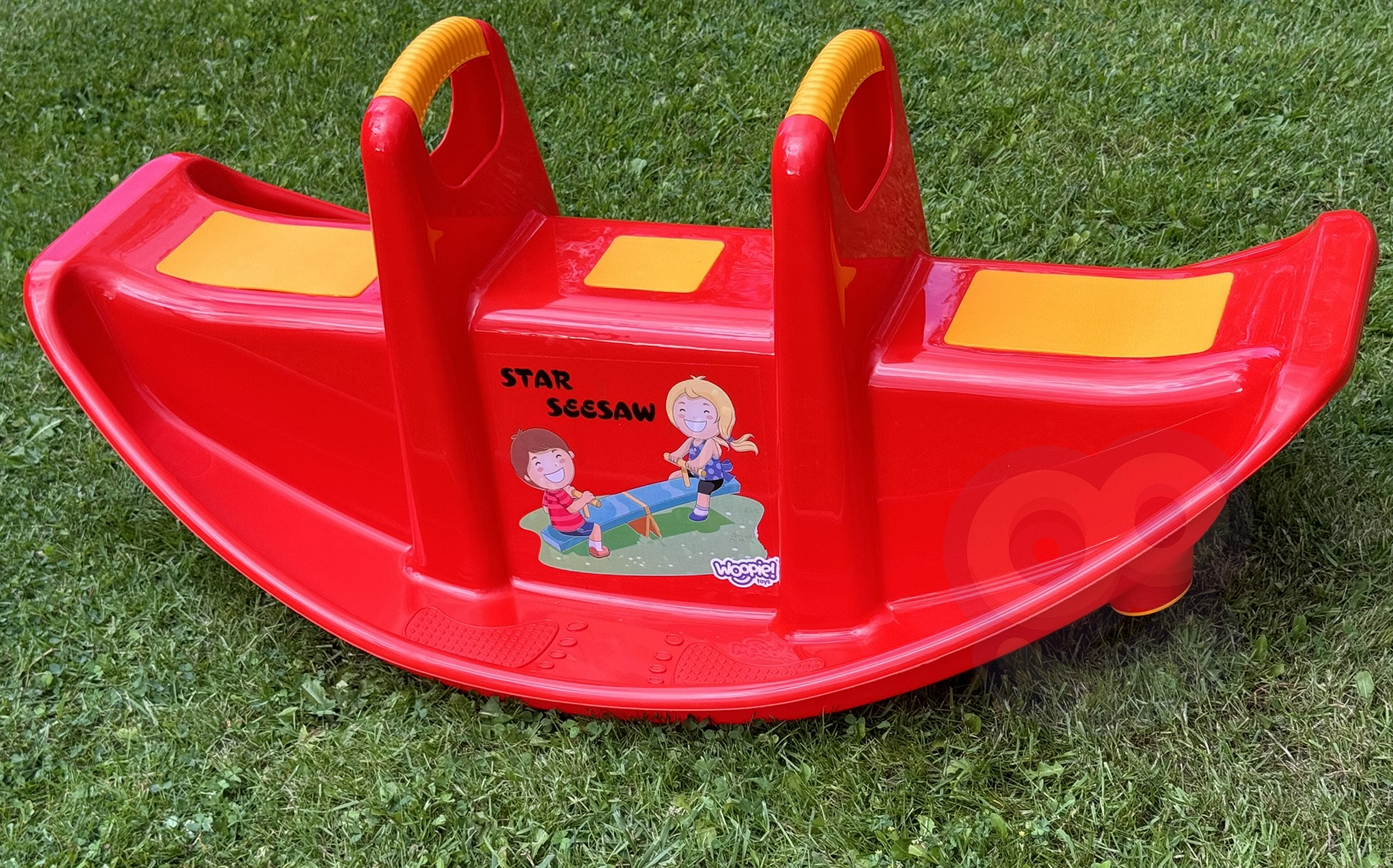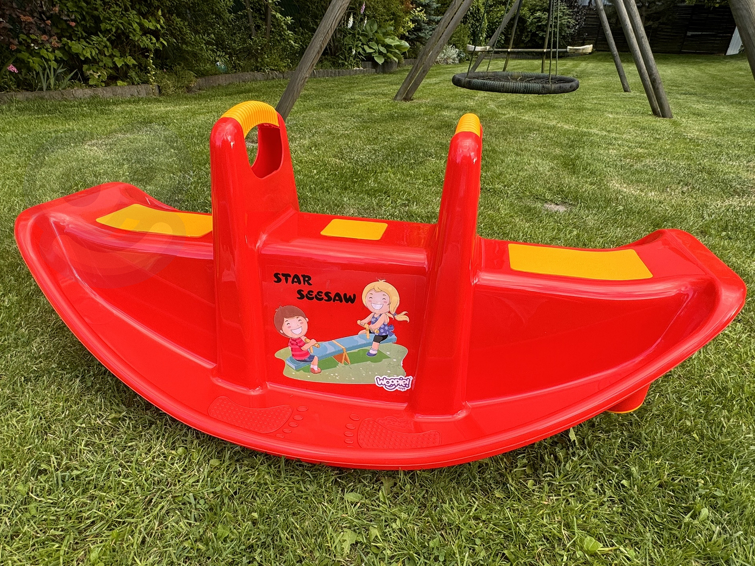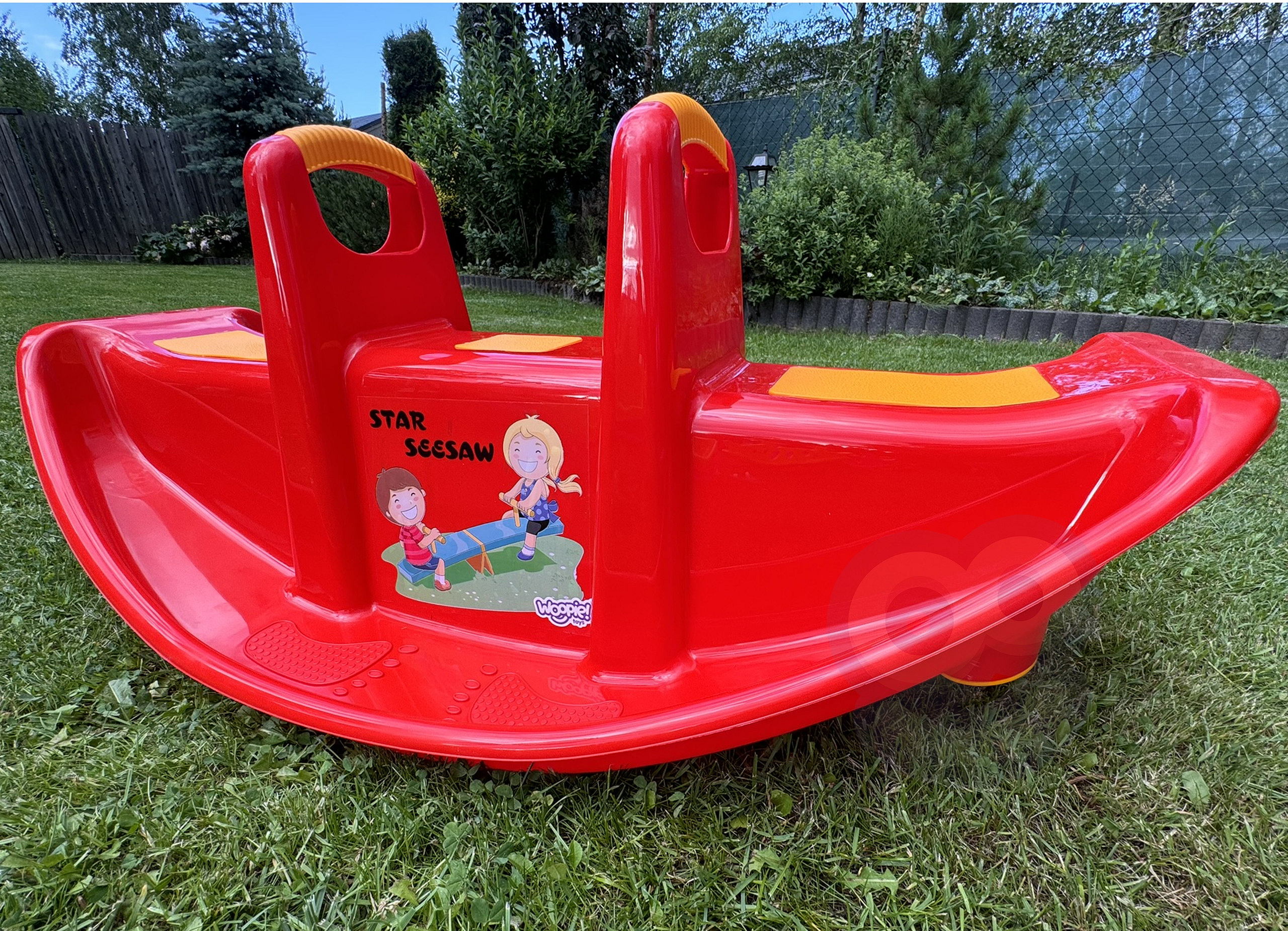Bujak Wieloosobowy STAR Czerwony marki Woopie jest prawdziwą gwiazdą wśród dzieci! Z bujaka może korzystać maksymalnie troje dzieci jednocześnie, a nawet jedno będzie się świetnie bawić. Gdy dzieci bujają się we dwójkę to dodatkowo rozwija u nich zdolności do współpracy. Bujaczek posiada specjalne nakładki antypoślizgowe na siedzisko oraz chroniące rączki. Bujak sam w sobie dostarcza wiele korzyści dla dzieci. Bujanie samo w sobie uspokaja dziecko oraz rozwija zdolności motoryczne ciała, co jest idealne dla prawidłowego rozwoju. Z huśtawki można korzystać zarówno w domu jak, i na zewnątrz!
