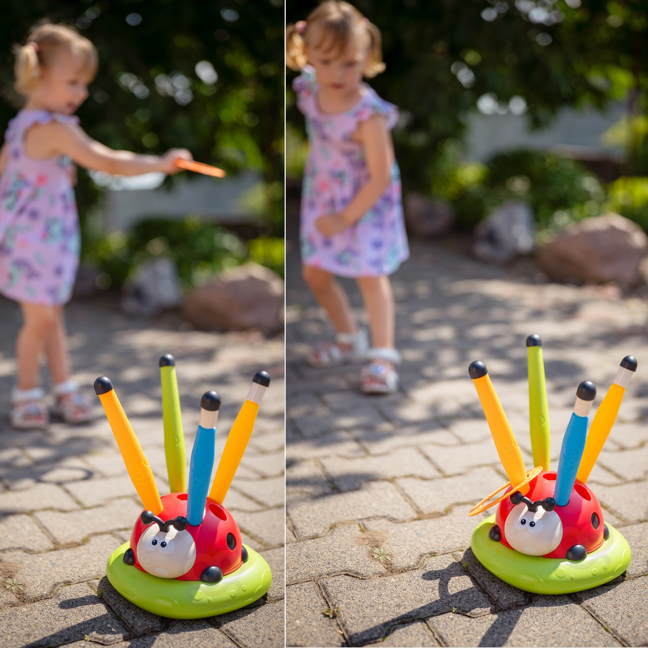 - - Gra w ringo zawiera 12 kolorowych obręczy, które dzieci muszą rzucać do celu – obracającego się biedronki. To doskonała forma aktywności rozwijająca refleks, celność oraz koncentrację.