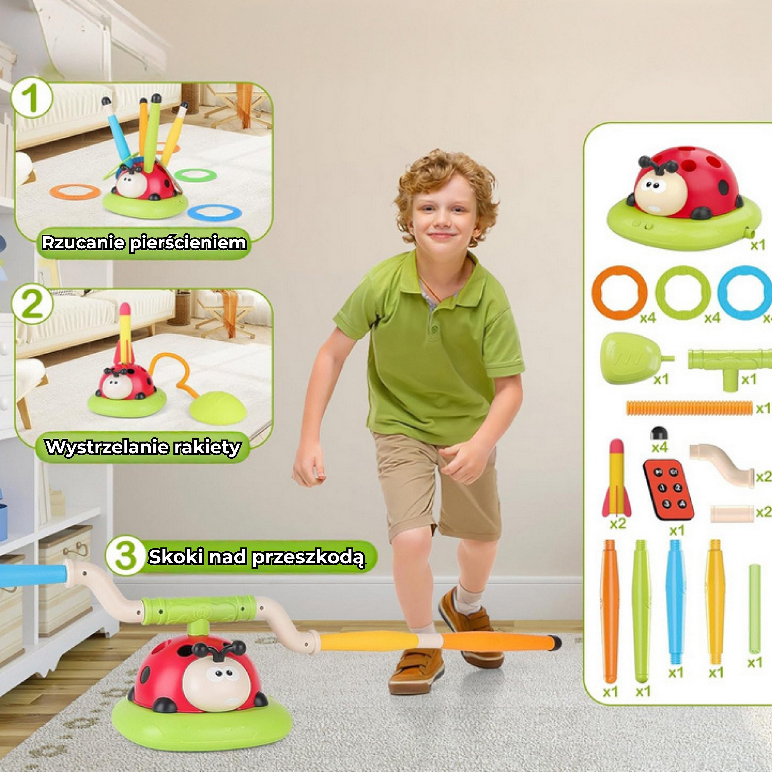 Zabawka Interaktywna biedronka 3w1 od Marki WOOPIE to prawdziwy hit – łączy w sobie interaktywną skakankę, wystrzałową wyrzutnię rakiet oraz zręcznościową grę w ringo.