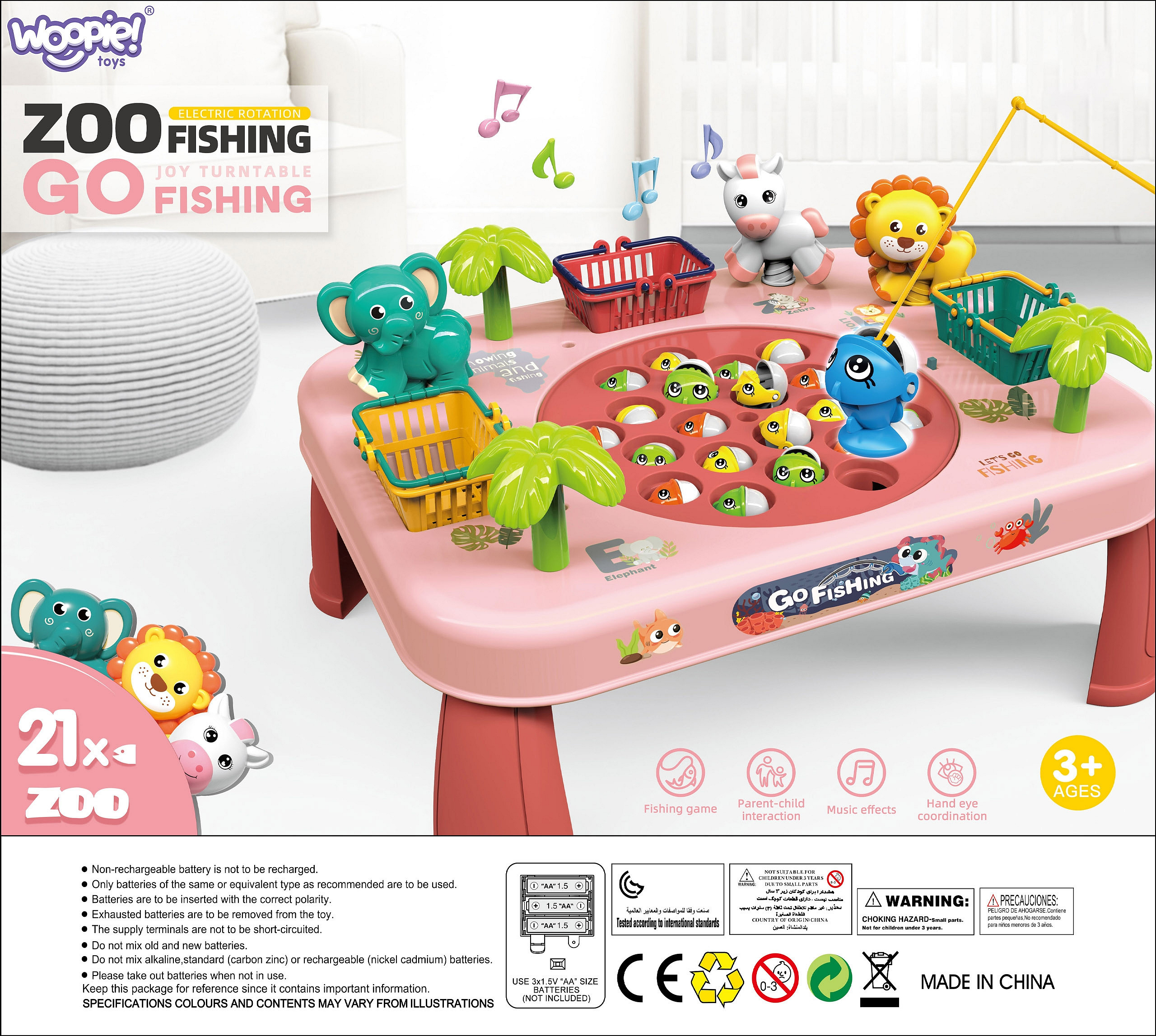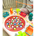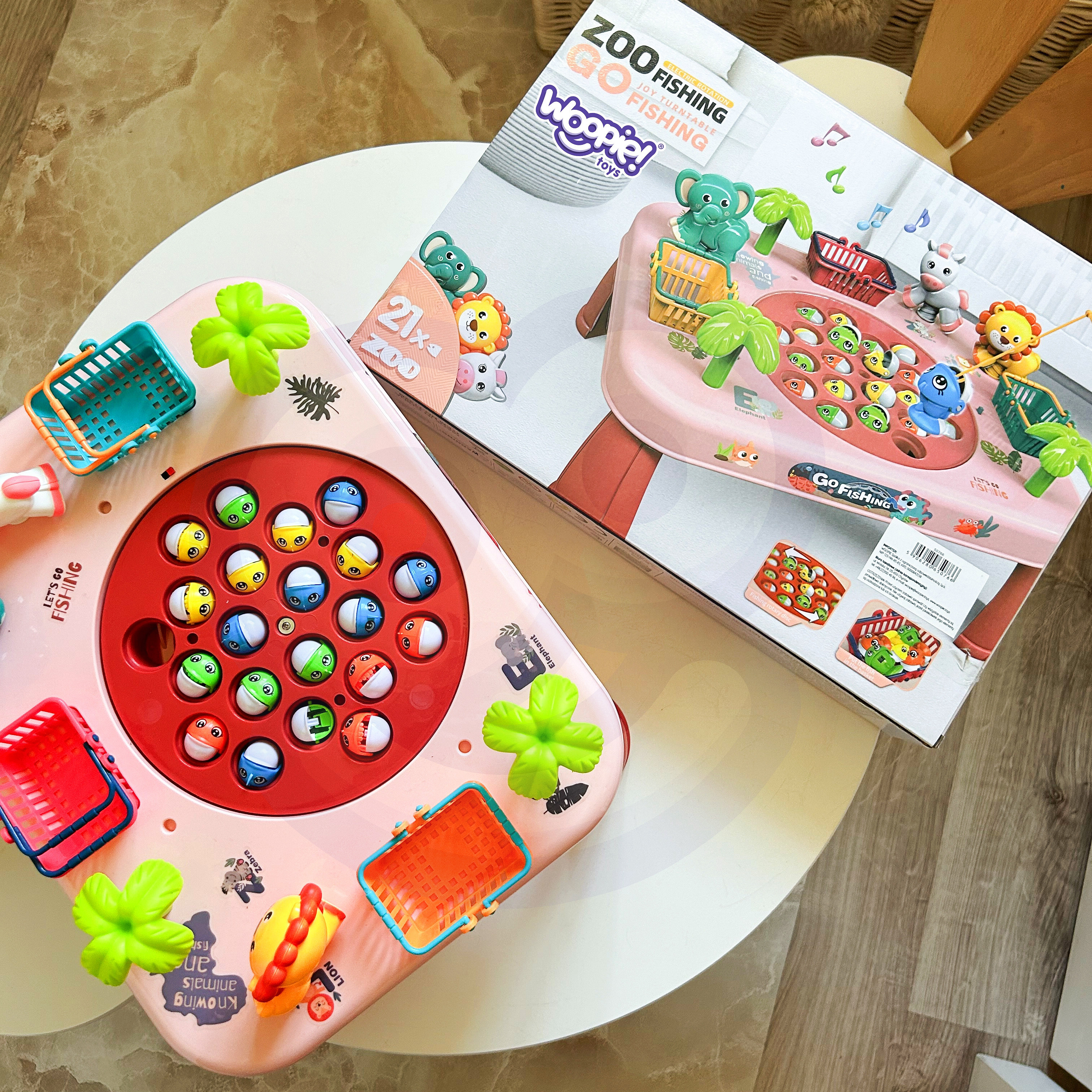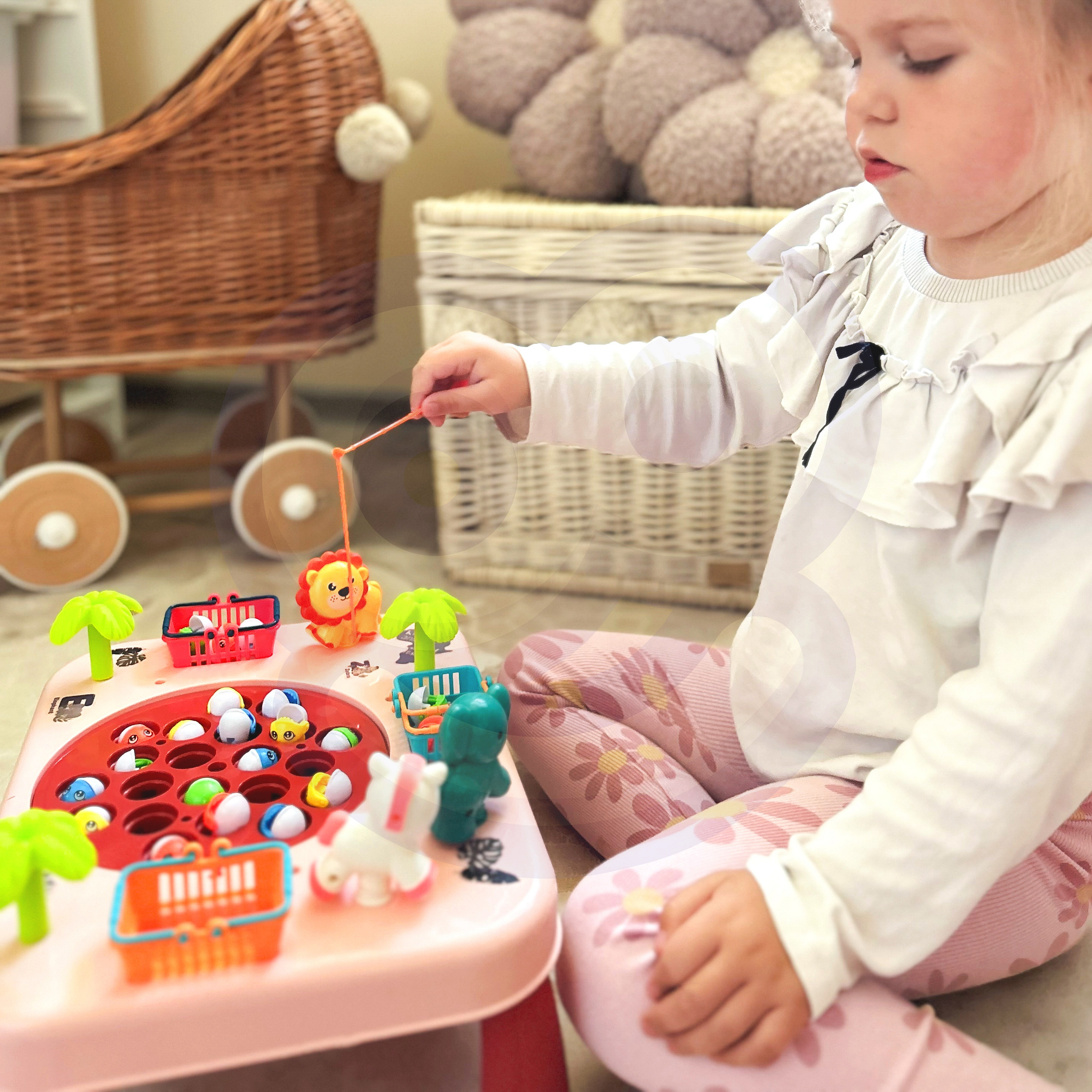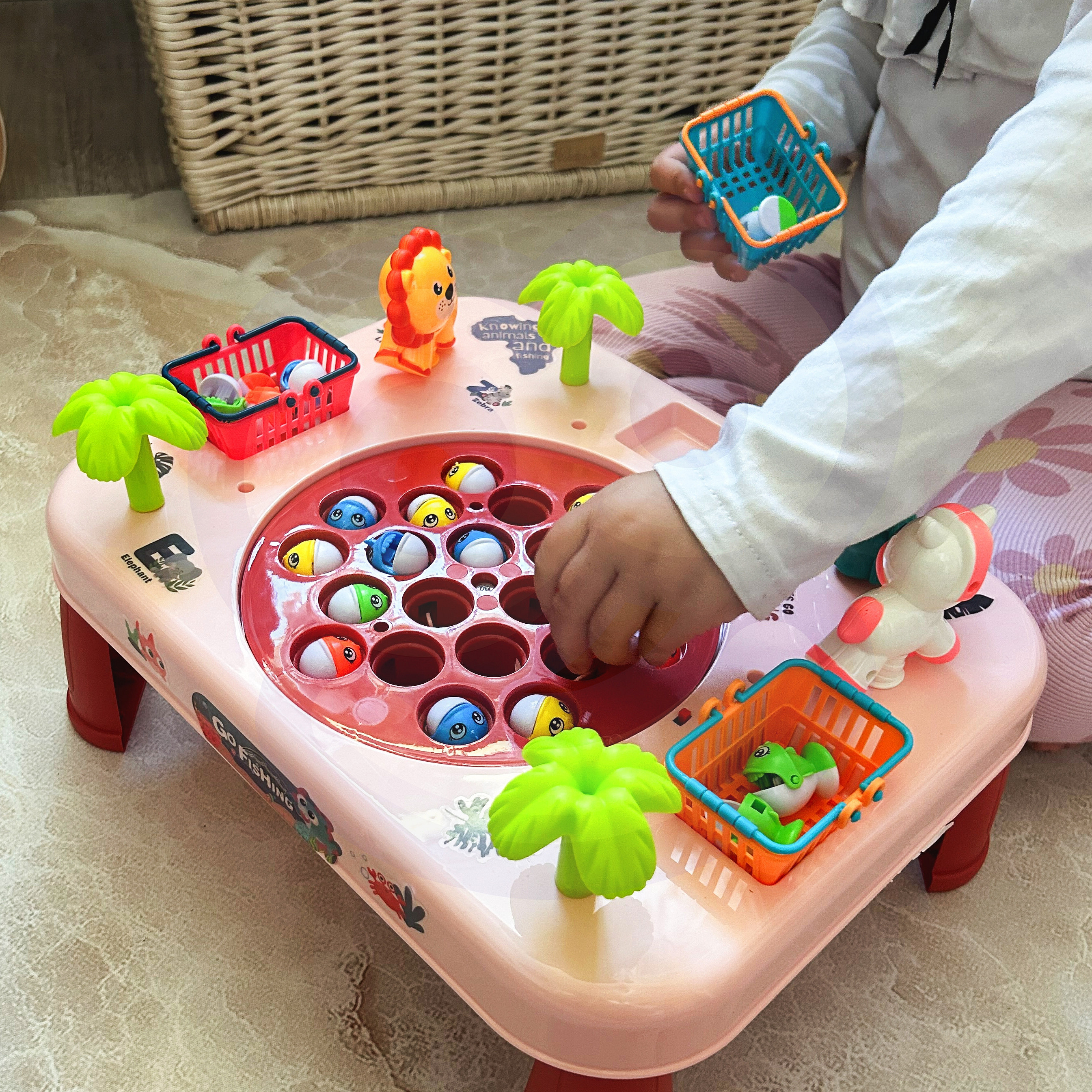 Ten niezwykły stoliczek to brama do nieskończonej rozrywki dla całej rodziny i przyjaciół. Zbudowany z solidnego materiału, jest nie tylko wytrzymały, ale także estetyczny. Jego kolorowy design przyciąga uwagę i zachęca do wspólnej zabawy. Koszyczki umieszczone po bokach stoliczka, są nie tylko praktycznym dodatkiem, ale także elementem rywalizacji. Zbierz jak najwięcej rybek, wrzuć je do koszyków i przygotuj się na zliczanie punktów na koniec gry. Po bokach stoliczka znajdują się również urocze zwierzątka, które są przyjemne dla oka. Aby utrudnić łowienie, plansza na której znajdują się rybki- rusza się. Aby umilić zabawę, stolik wydaje z siebie melodię i efekty dźwiękowe!