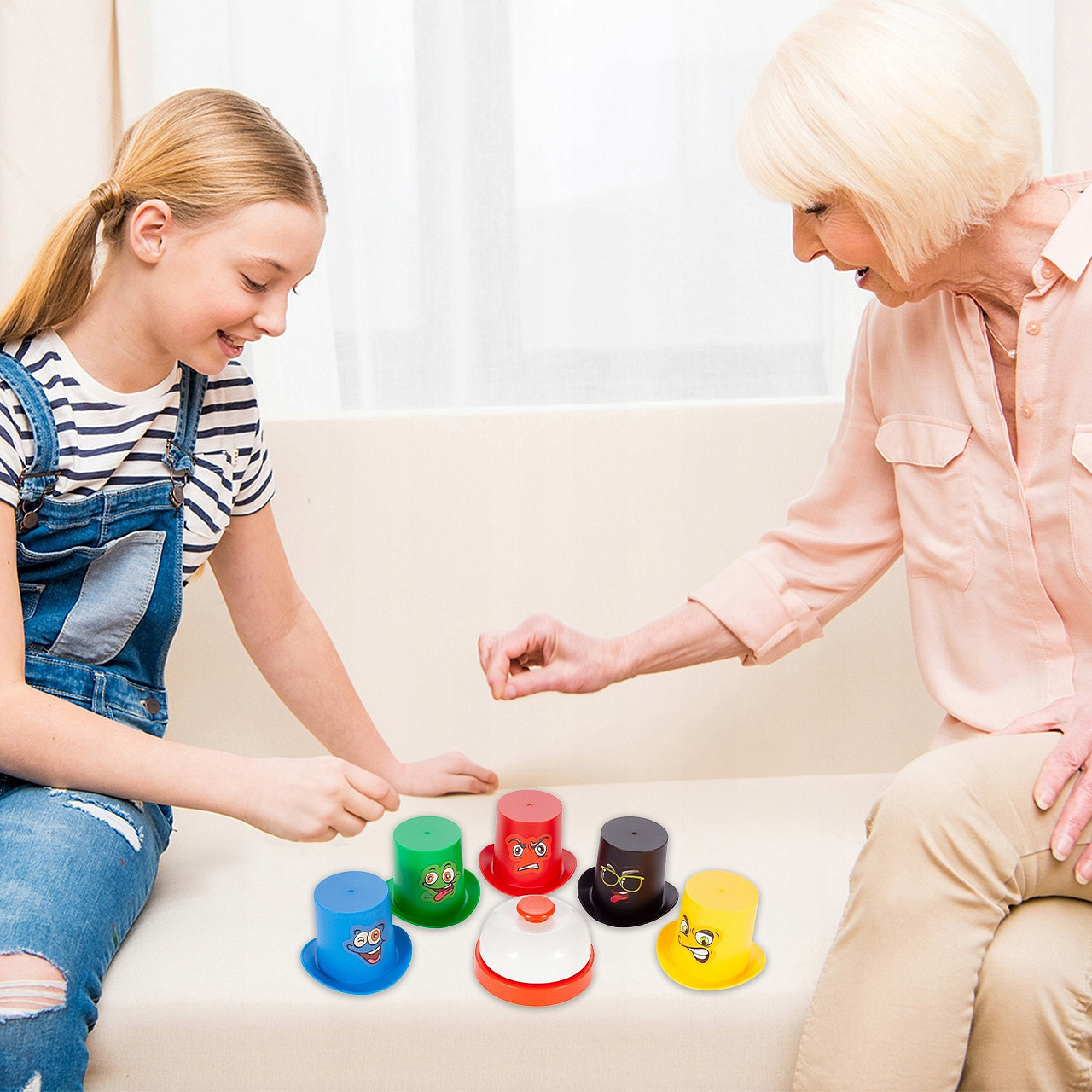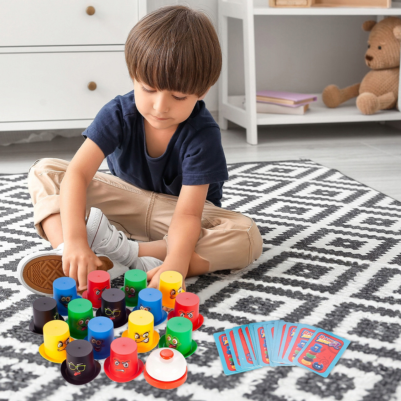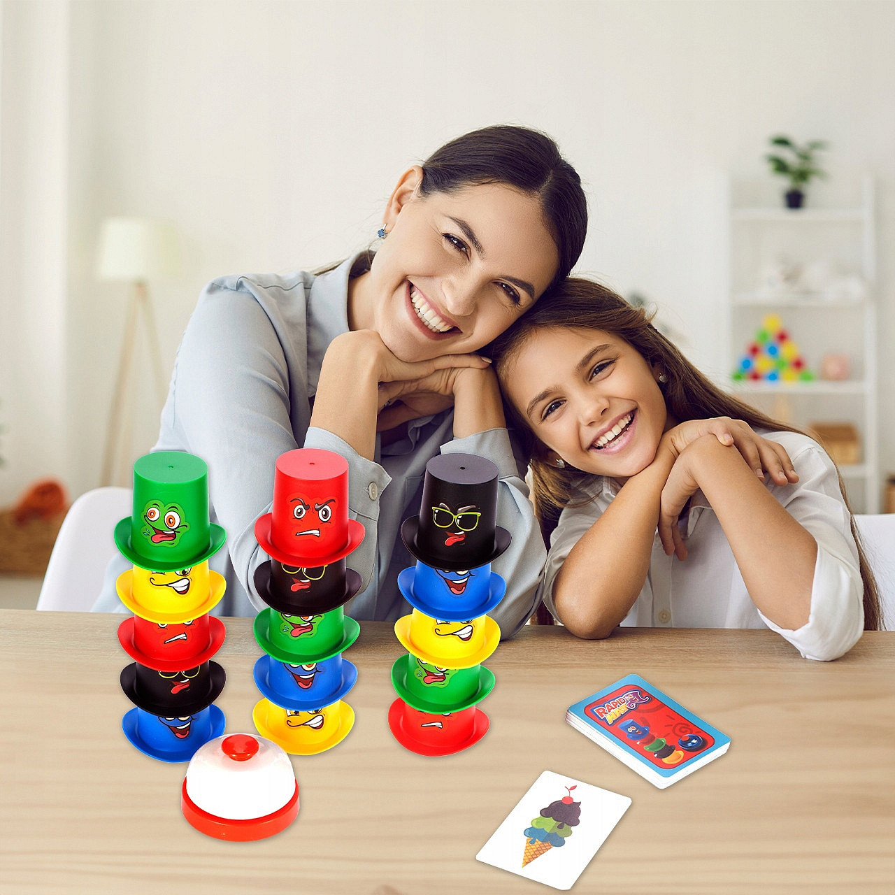 Każdy z graczy otrzymuje 5 różnokolorowych kubeczków i musi jak najszybciej ułożyć je w kolejności pokazanej na karcie z rysunkiem. Ta wskazuje, czy kubki mają być ułożone obok siebie, czy ustawione jeden na drugim. Zadanie wykonane? Czas jak najszybciej zadzwonić dzwonkiem! Najbardziej spostrzegawcza osoba zostanie zwycięzcą. W grę może grać od 2 do 4 osób.
