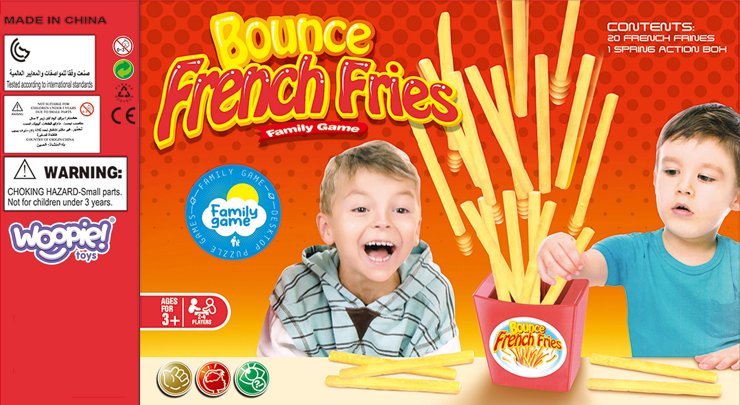 Gra zręcznościowa WOOPIE Wyskakujące Frytki, to gra dla dzieci od 4-ego roku życia. Gra jest bardzo prosta, polega na wyciągnięciu odpowiedniej frytki tak, aby pozostałe nie wyskoczyły z opakowania. Poza mnóstwem rozrywki, poprawia ona zdolności manualne i koordynacyjne dziecka. Zabawka jest lekka i poręczna. Wyskakujące frytki to doskonała rozrywka na wspólne wieczory z rodziną czy z przyjaciółmi.