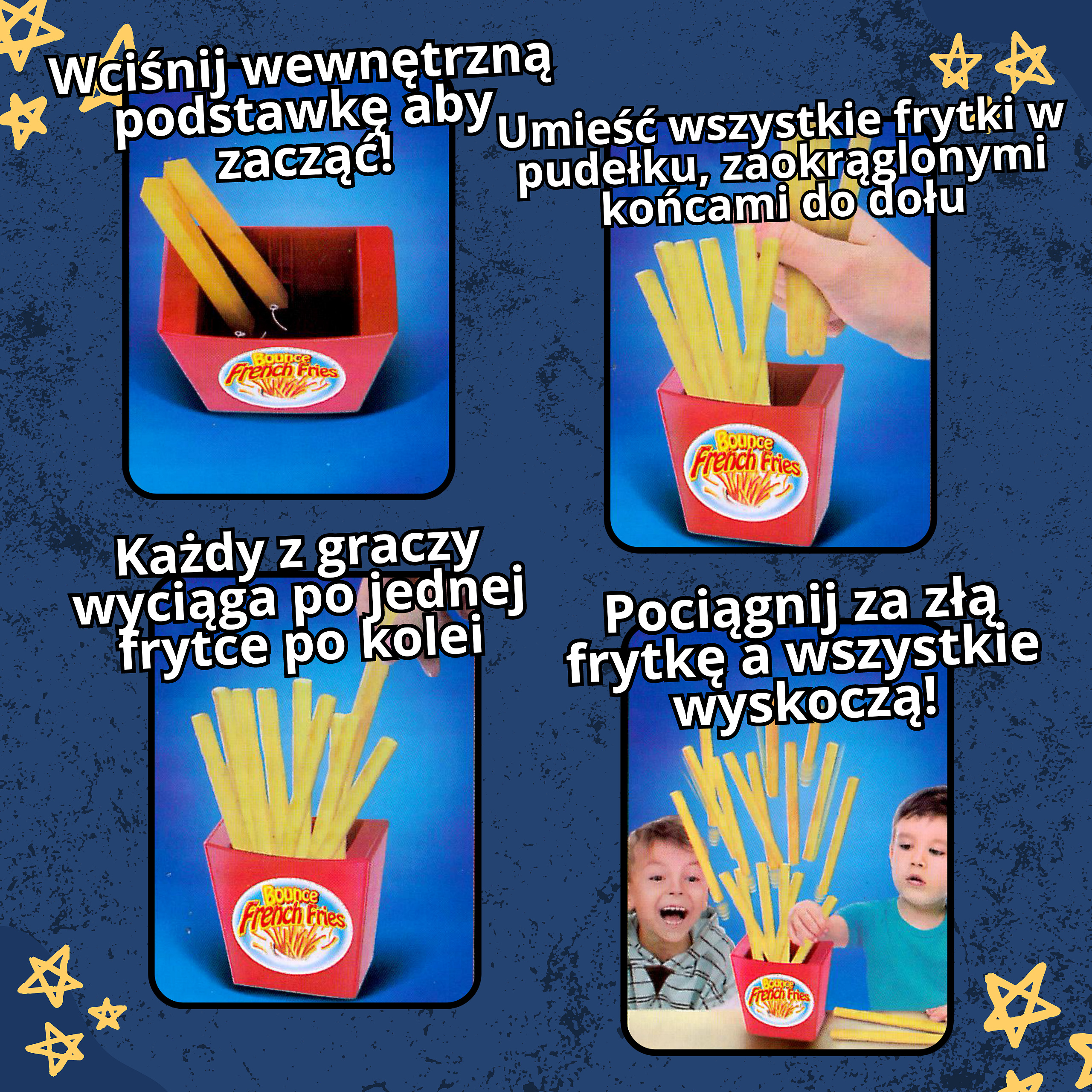 - Przegrywa osoba, która wyciągnie złą frytkę co spowoduje wypadnięcie wszystkich frytek.