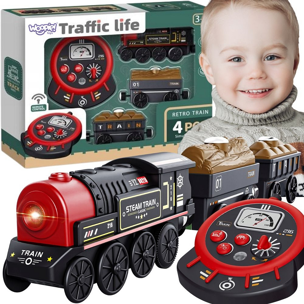 Przenieś swoje dziecko w fascynujący świat kolei z Kolejką Retro Zdalnie Sterowaną od marki Woopie! Ten 4-częściowy zestaw zapewnia mnóstwo kreatywnej zabawy, w której maluch może wcielić się w rolę prawdziwego maszynisty. Realistyczny wygląd lokomotywy parowej, efekty świetlne i dźwiękowe , specjalny pilot w kształcie panelu sterowania sprawiają, że zabawa jest niezwykle wciągająca. Kolejka składa się z lokomotywy i dwóch wagonów towarowych. Zabawka przeznaczona jest dla dzieci od 3 roku życia. Zdalne sterowanie rozwija zdolności manualne i koordynację wzrokowo-ruchową, a jednocześnie dostarcza wielogodzinnej, pasjonującej rozrywki!
