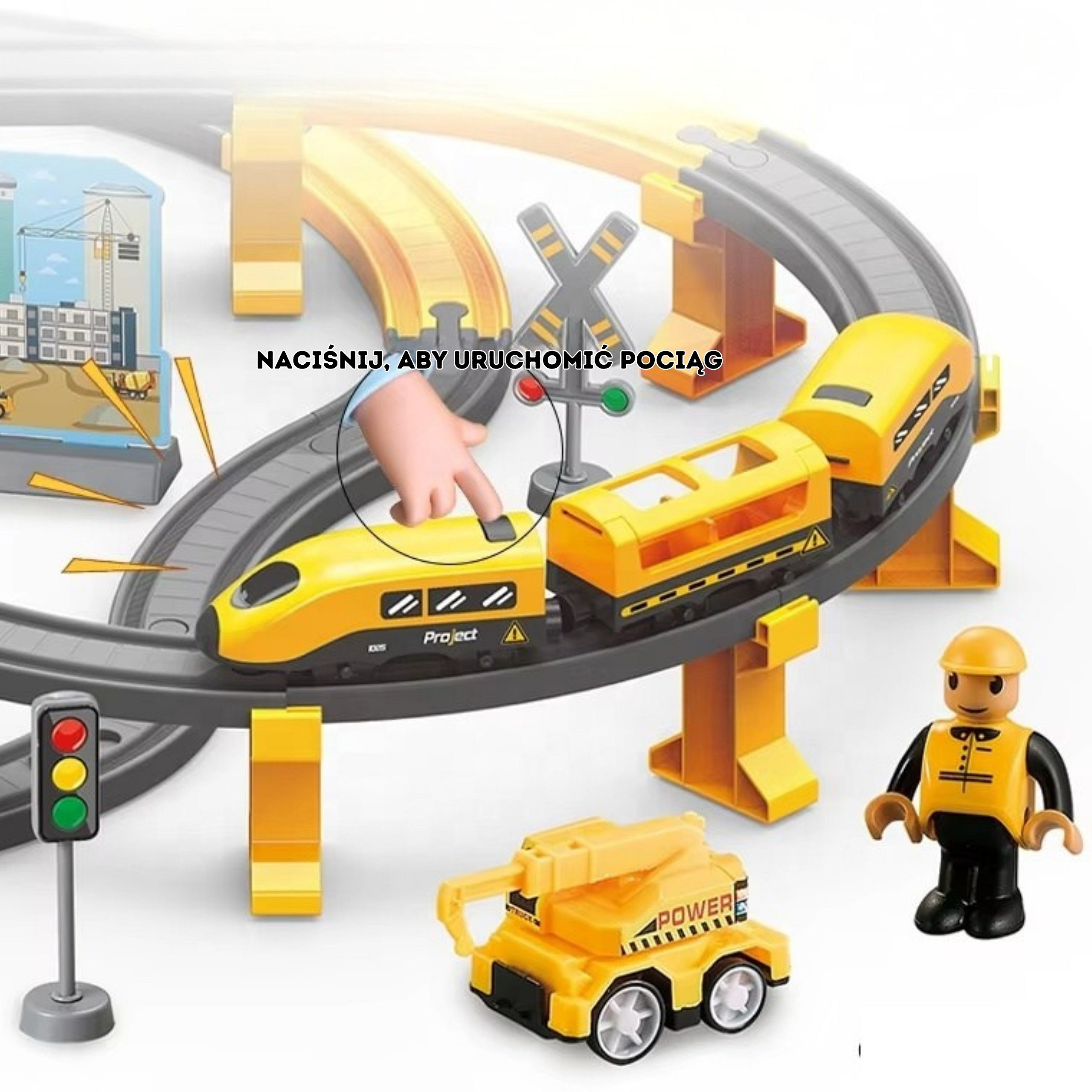 Fascynujący zestaw kolejki elektrycznej marki Woopie to prawdziwe centrum dowodzenia dla małych konstruktorów! Żółty pociąg ekspresowy z dźwiękami rzeczywistego pojazdu szynowego wprowadzi dziecko w świat budowy, planowania tras i tworzenia własnych scenariuszy zabawowych. Dzięki bogatemu wyposażeniu w mosty, tunele, sygnalizację świetlną i pojazdy budowlane, maluch może komponować nieograniczoną liczbę układów torowych, a następnie obserwować, jak pociąg mknie przez ich autorskie miasto. To zabawka, która łączy ekscytację prawdziwej kolei z kreatywnością dziecięcego świata