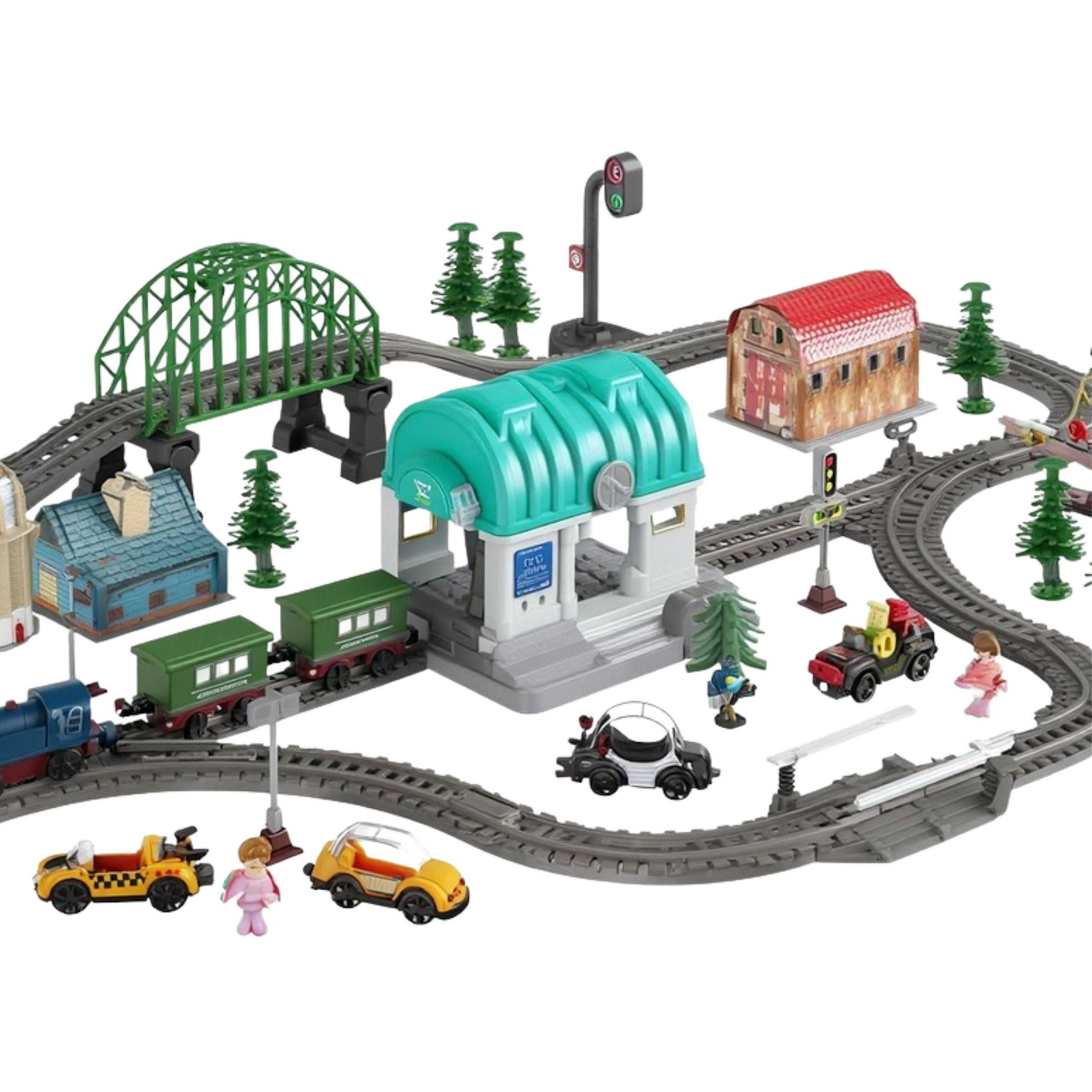 - - 108 elementów w zestawie – w tym tory, most, tunel, stacja, pojazdy i figurki