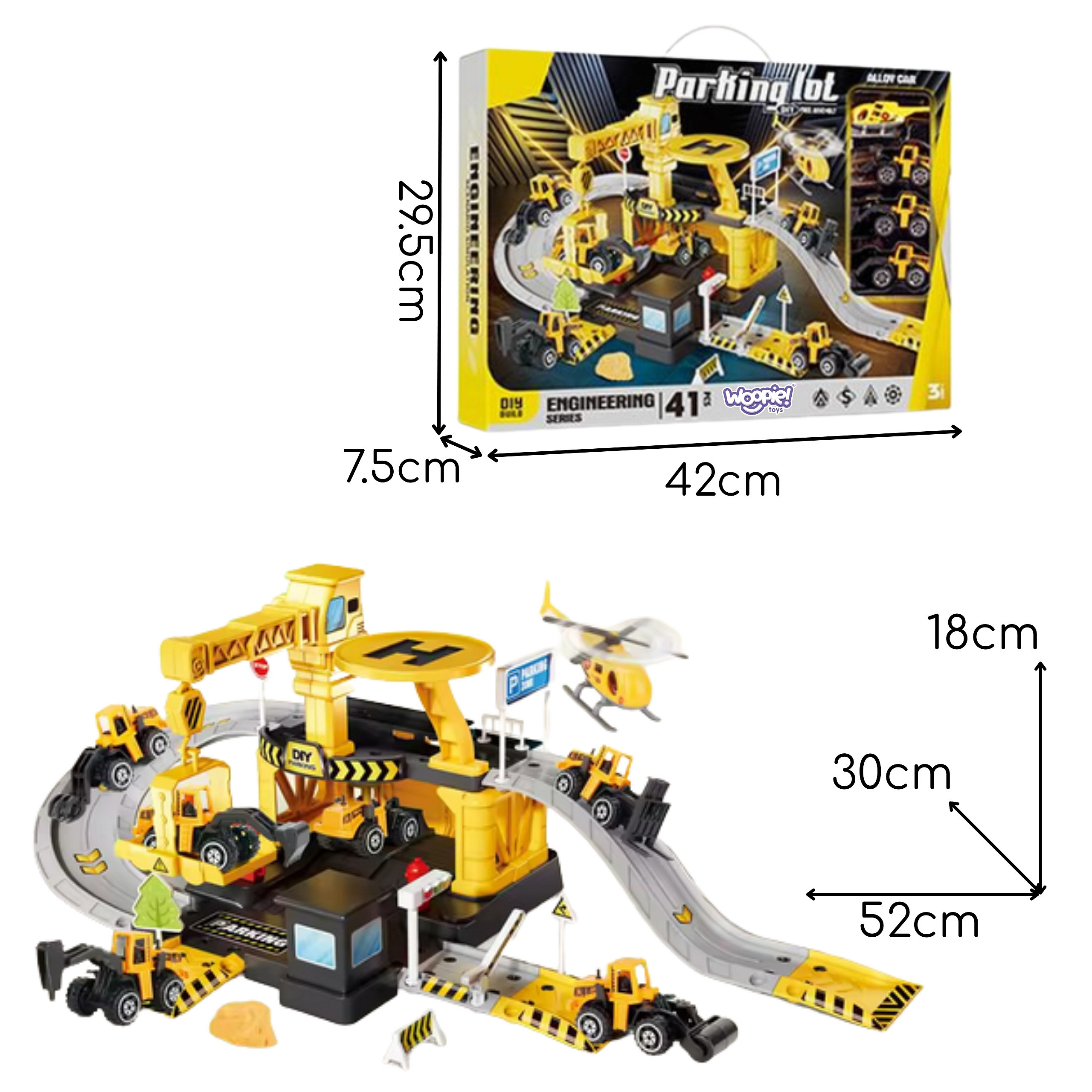 Parking firmy budowlanej od marki Woopie z akcesoriami i pojazdami to fantastyczny zestaw tematyczny dla każdego małego miłośnika motoryzacji i prac konstrukcyjnych, który zamieni pokój dziecka w prawdziwy plac budowy! Zabawka zachwyca bogactwem detali, ilością elementów, żywą kolorystyką i wieloma możliwościami zabawy. Dwupoziomowy parking z rampami, lądowiskiem dla helikoptera i licznymi akcesoriami pozwala dziecku na tworzenie własnych scenariuszy zabawy, ograniczonymi tylko wyobraźnią. Trzy metalowe samochodziki i helikopter pozwolą wykorzystać każdą z funkcji garażu i pozwolą na zabawę w gronie rodzeństwa lub przyjaciół oraz wcielenie się w postać małego konstruktora.