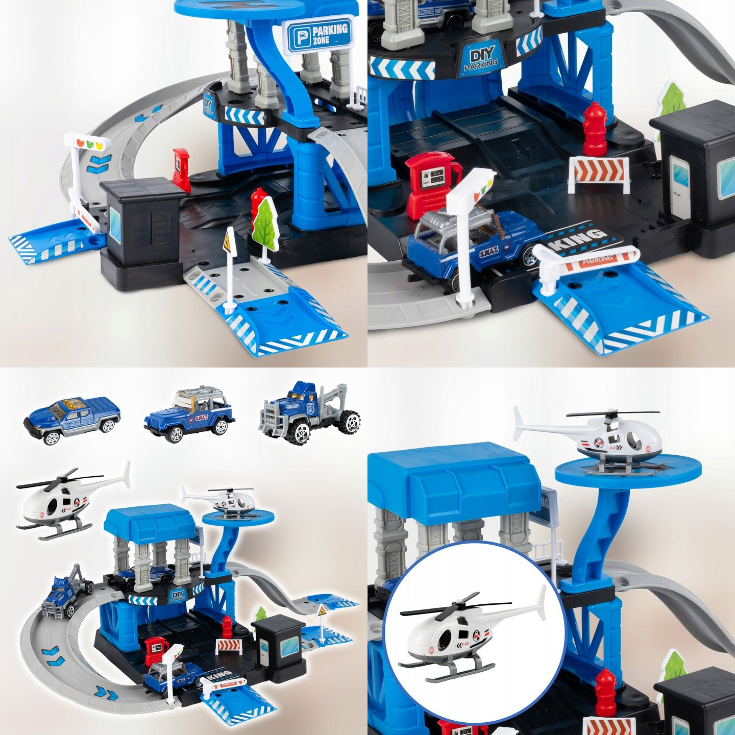 Parking policyjny od marki Woopie z akcesoriami i pojazdami to fantastyczny zestaw tematyczny dla każdego małego miłośnika motoryzacji i służb mundurowych! Zabawka zachwyca bogactwem detali, ilością elementów, żywą kolorystyką i wieloma możliwościami zabawy. Dwupoziomowy parking z rampami, lądowiskiem dla helikoptera i licznymi akcesoriami pozwala dziecku na tworzenie własnych scenariuszy zabawy, ograniczonymi tylko wyobraźnią. Trzy metalowe samochodziki i helikopter pozwolą wykorzystać każdą z funkcji garażu i pozwolą na zabawę w gronie rodzeństwa lub przyjaciół oraz wcielenie się w postać małego policjanta.