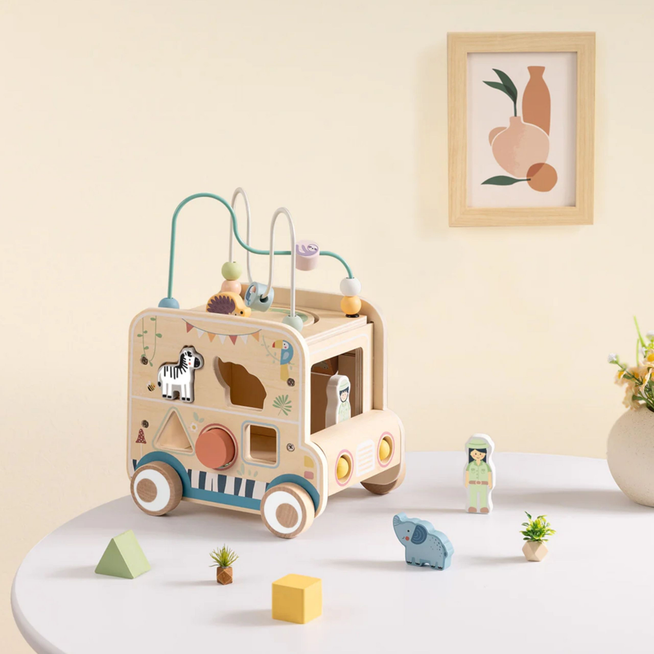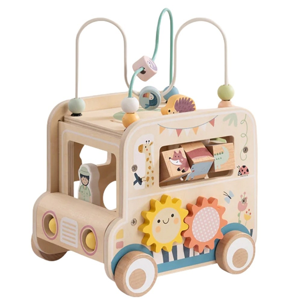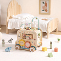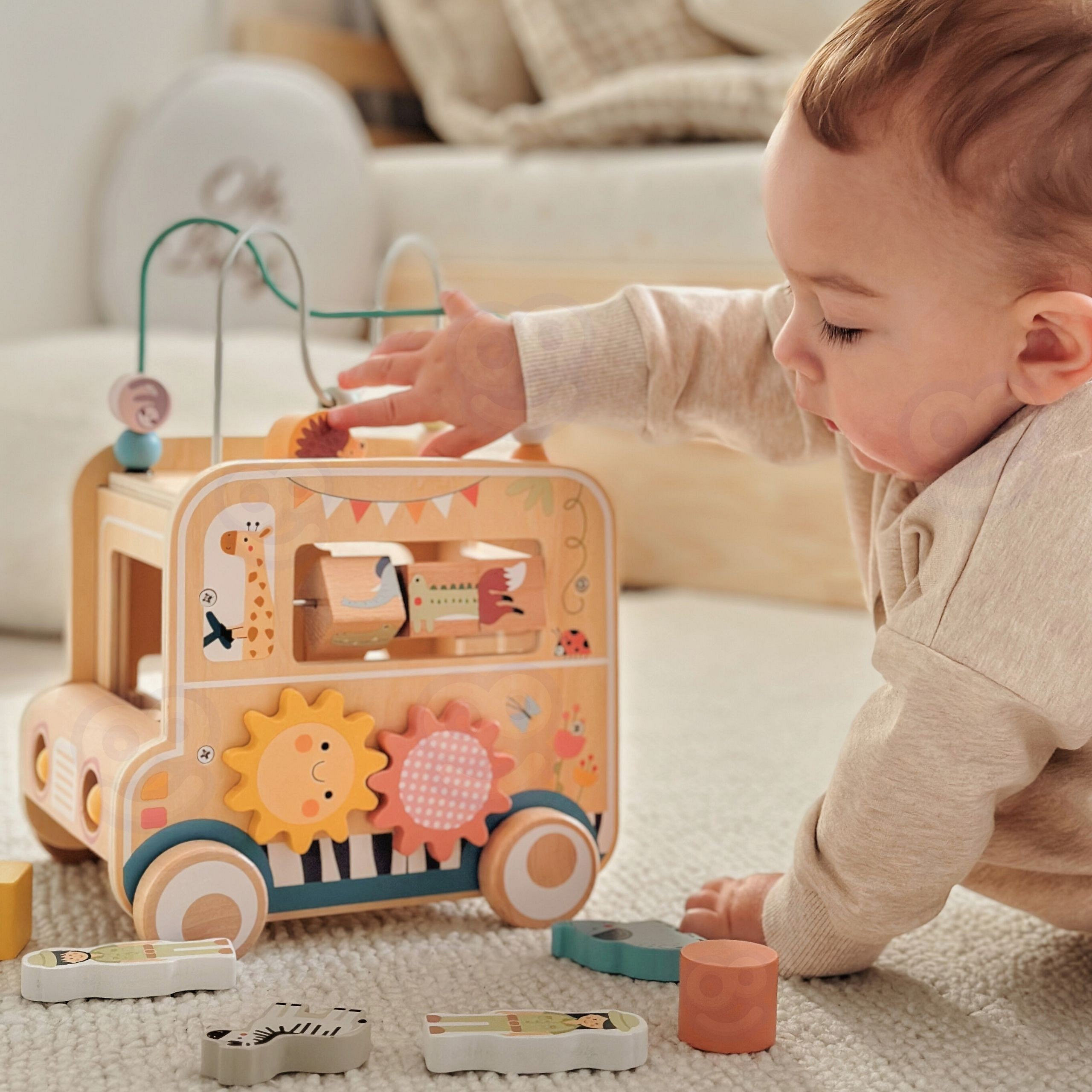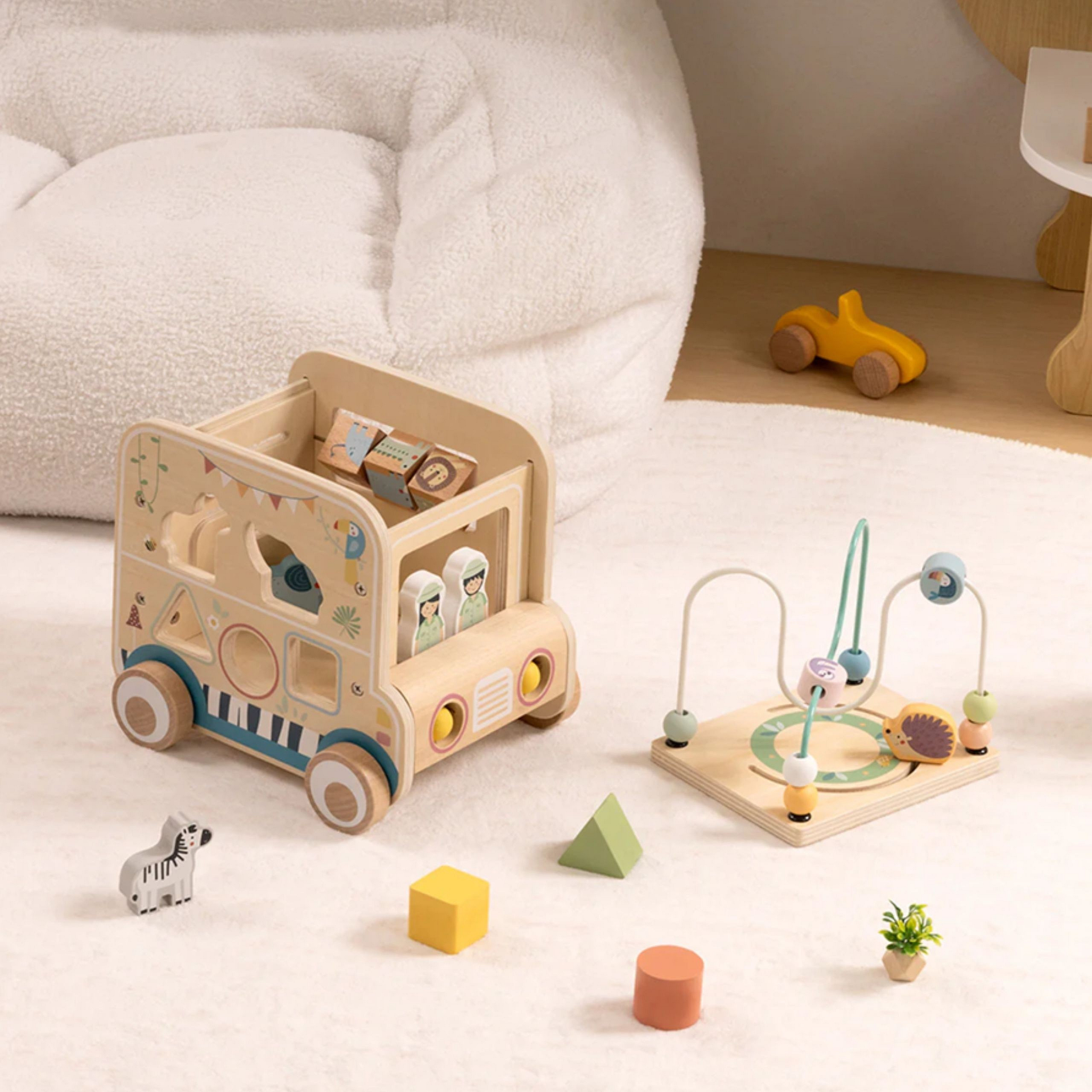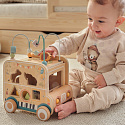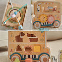 - Ruchome elementy: koraliki na pętli motorycznej, koła zębate, sorter kształtów, obracane klocki z obrazkami