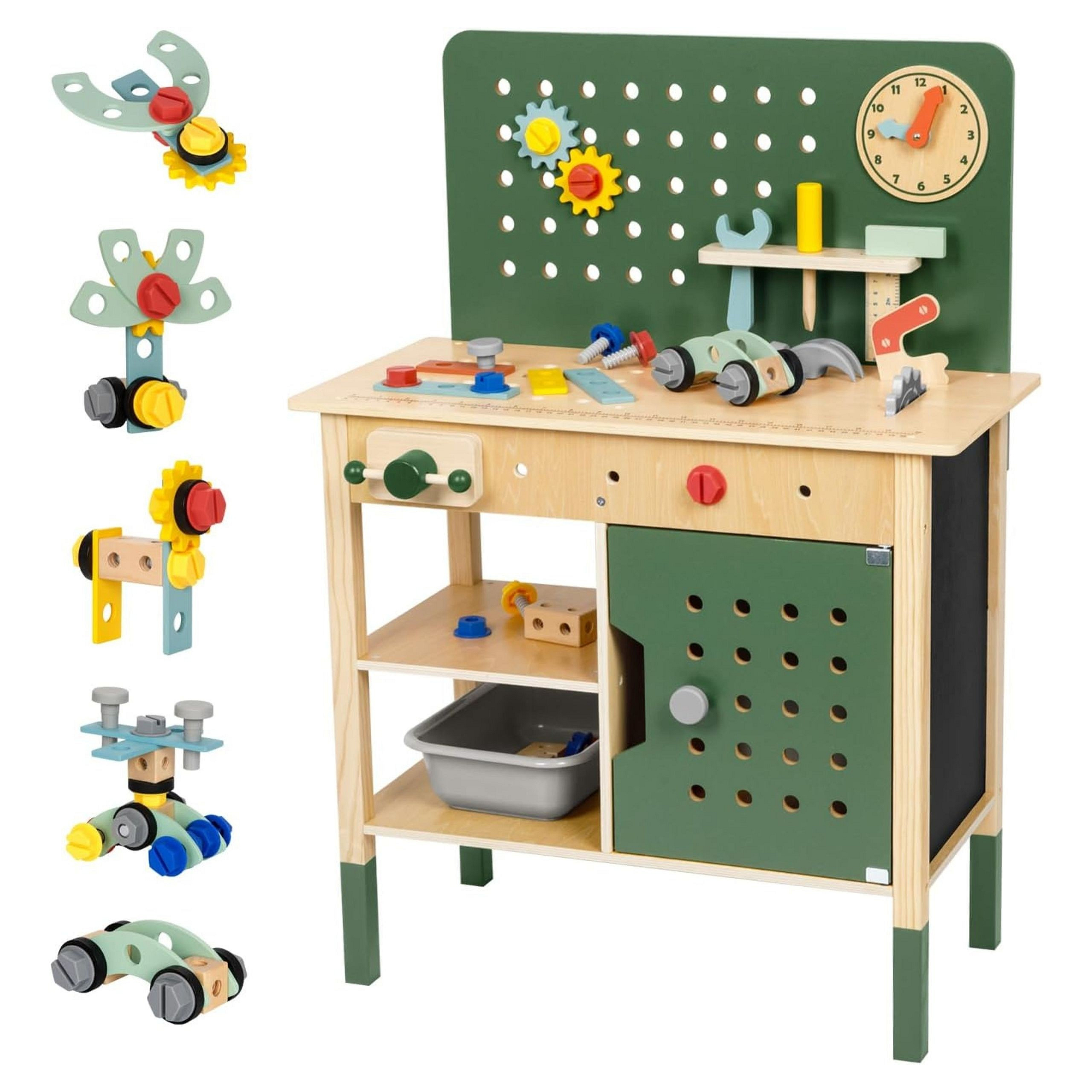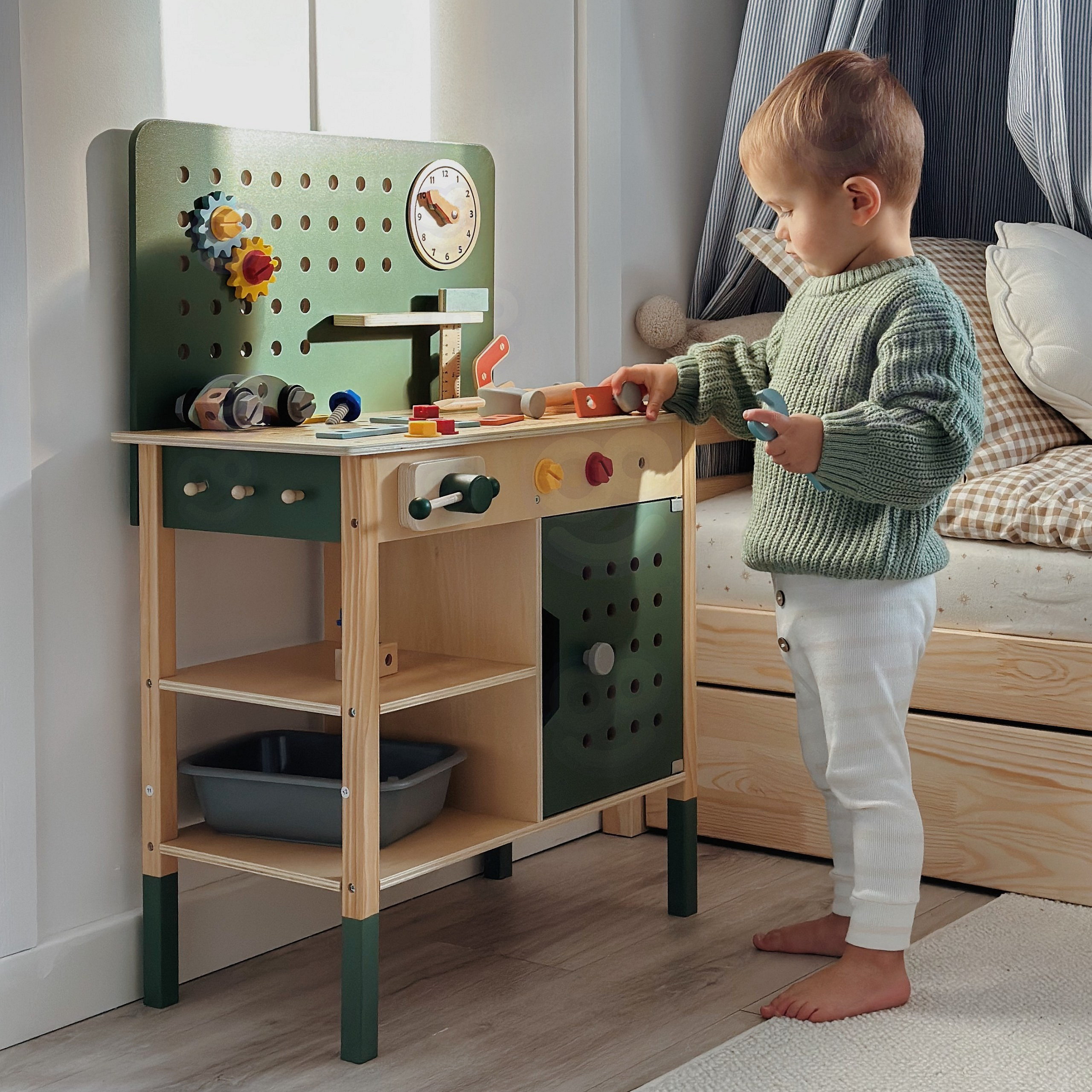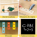 Drewniany warsztat majsterkowicza dla dzieci od Woopie Green to doskonała zabawka edukacyjna, która wprowadza najmłodszych w fascynujący świat konstruowania, napraw i odkrywania zasad działania narzędzi. Zestaw wykonany jest z wysokiej jakości drewna i bezpiecznych materiałów, gwarantując długą i bezpieczną zabawę. Dzięki licznym elementom i realistycznym detalom maluch może poczuć się jak prawdziwy mały inżynier lub konstruktor!Warsztat został wykonany z wysokiej jakości drewna, które jest przyjemne w dotyku, ekologiczne i w pełni bezpieczne dla dzieci. Starannie oszlifowane krawędzie i trwała konstrukcja gwarantują bezpieczeństwo i komfort podczas zabawy. Zabawka zachwyca dbałością o detale – znajdziesz tu prawdziwie wyglądające narzędzia, ruchome elementy, półki na akcesoria, a nawet zegar z obrotowymi wskazówkami i tablicę kredową do notowania pomysłów czy rysowania projektów. Każdy element został zaprojektowany z myślą o wszechstronnym rozwoju dziecka. Dzięki warsztatowi maluch poznaje zasady działania podstawowych narzędzi, rozwija zdolności manualne, uczy się logicznego myślenia i ćwiczy cierpliwość. To doskonały sposób, aby zachęcić dziecko do samodzielności i twórczego myślenia w codziennej zabawie.