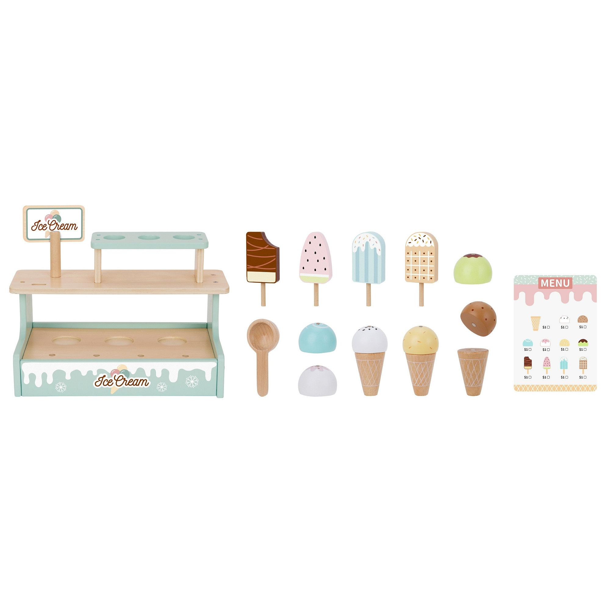 - - Realistyczne akcesoria: lody na patyku, gałki, wafelki, menu i łyżka