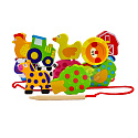 - - 12 drewnianych klocków z dziurkami, przedstawiających m.in.: