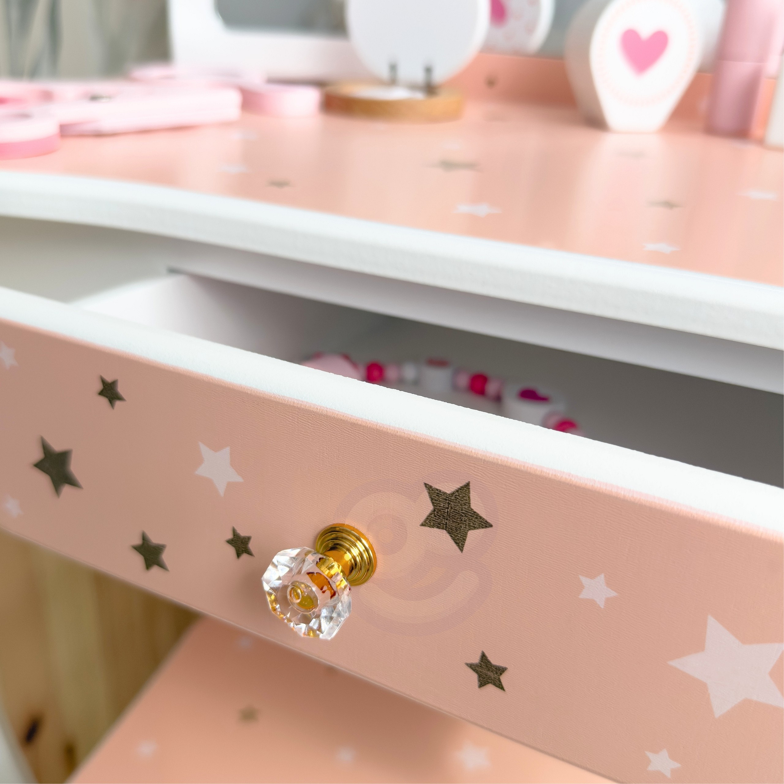 - - Bezpieczne wykończenie – wszystkie krawędzie są zaokrąglone, a farby użyte do malowania toaletki są nietoksyczne i przyjazne dzieciom