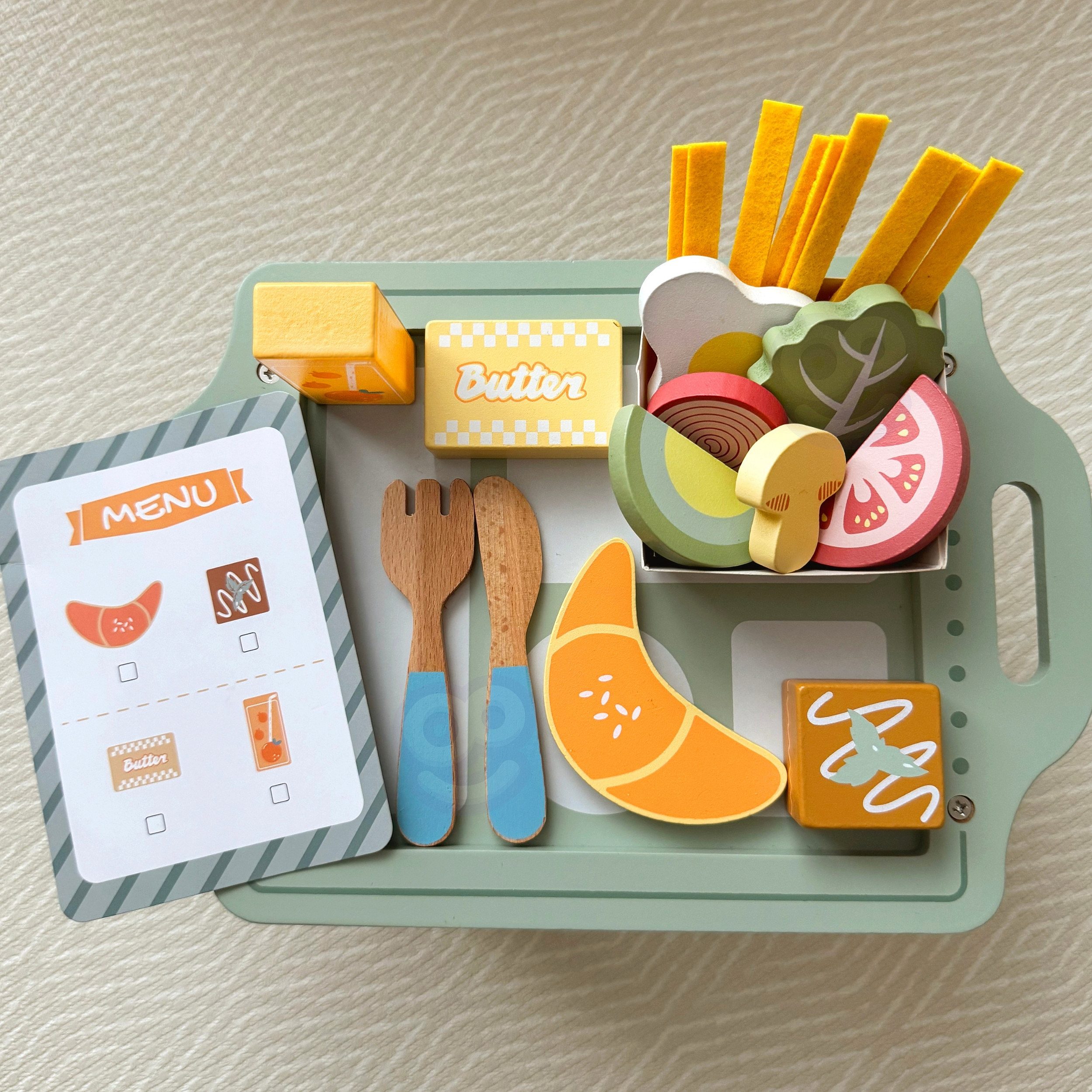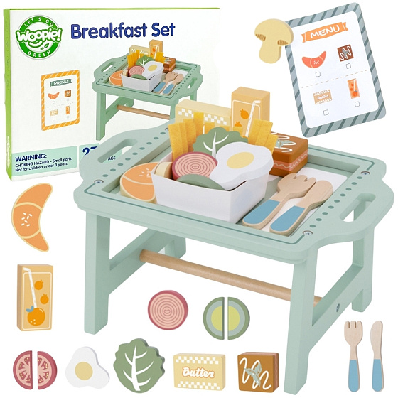Popis WOOPIE GREEN Snídaňová sada a restaurace – Hra na objednávání s podnosem a doplňky
