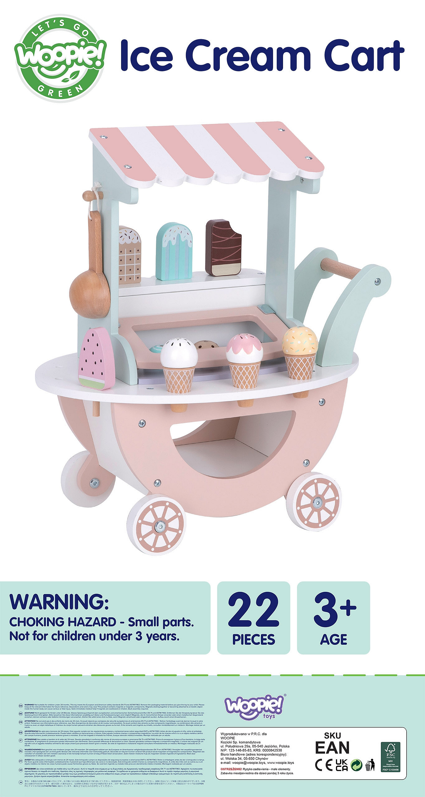 Czy są dzieci, które nie kochają lodów? A teraz wyobraź sobie, że Twoje dziecko może otworzyć własną lodziarnię!Drewniana Lodziarnia odWoopie Green to nie tylko uroczy wózek na kółkach, ale prawdziwe centrum kreatywnej zabawy, która uczy, bawi i rozwija. Zestaw zawiera aż 27 elementów, w tym kolorowe gałki lodów z magnetycznym mocowaniem, patyczki, rożki, łyżkę do lodów i zabawkowe monety. Dzięki różnorodnym akcesoriom dziecko może wcielić się w rolę sprzedawcy, klienta lub lodowego mistrza – tworząc smaki i kombinacje według własnego pomysłu!