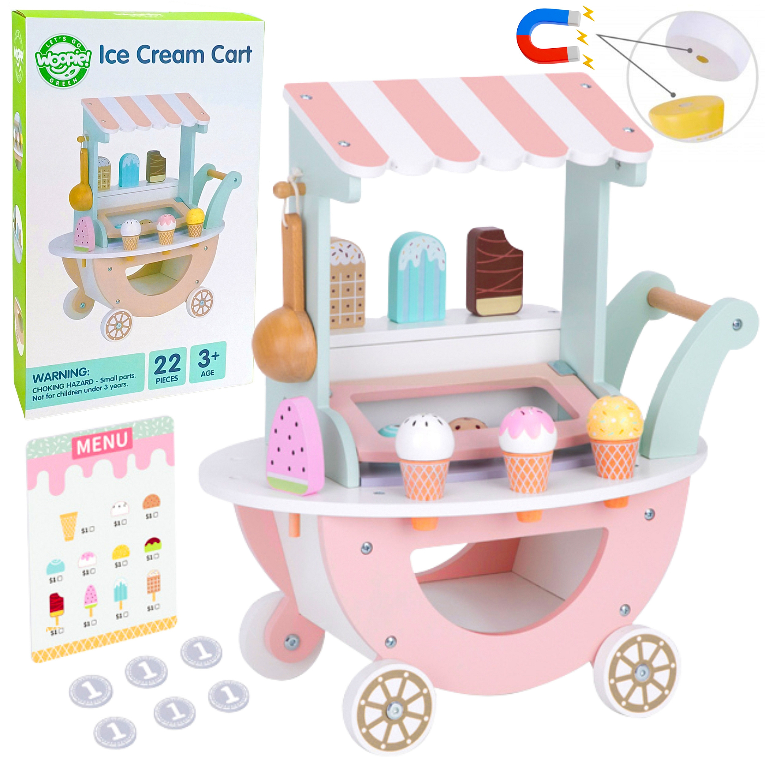 - Bogaty zestaw akcesoriów: Zawiera lody na patyku, wafelki, kolorowe gałki, łyżkę do lodów, menu oraz drewniane monety – łącznie 27 elementów