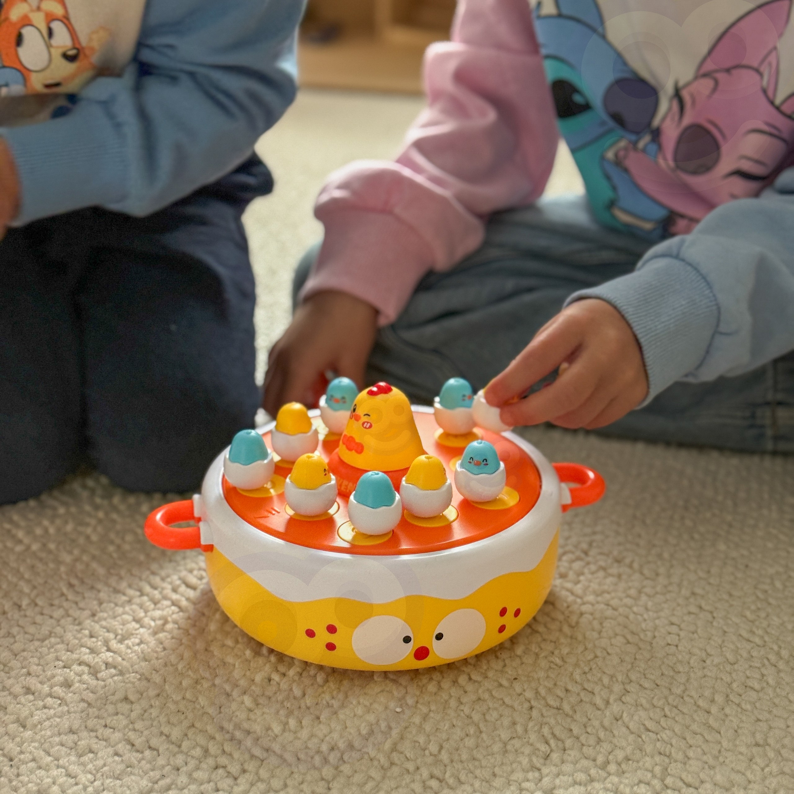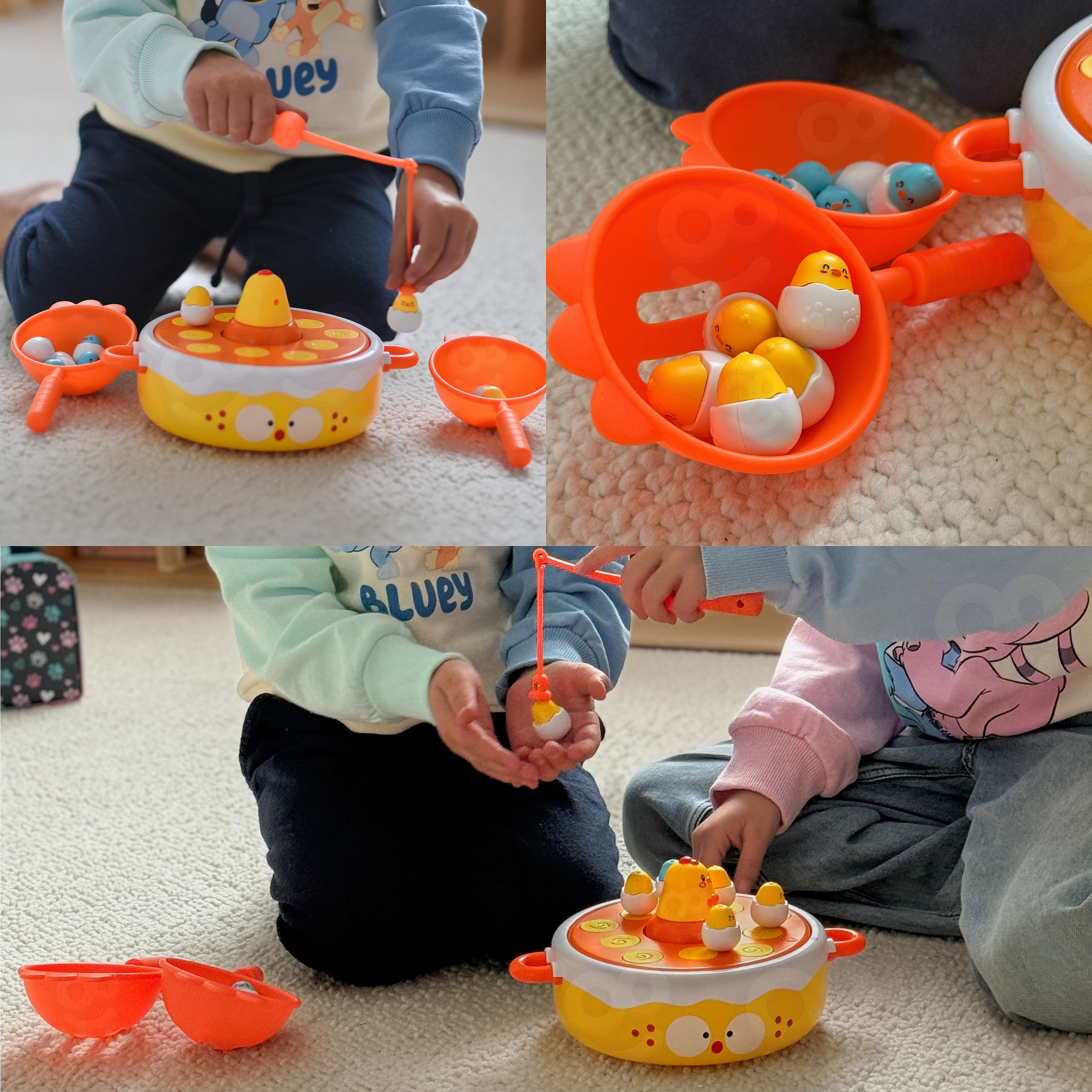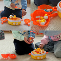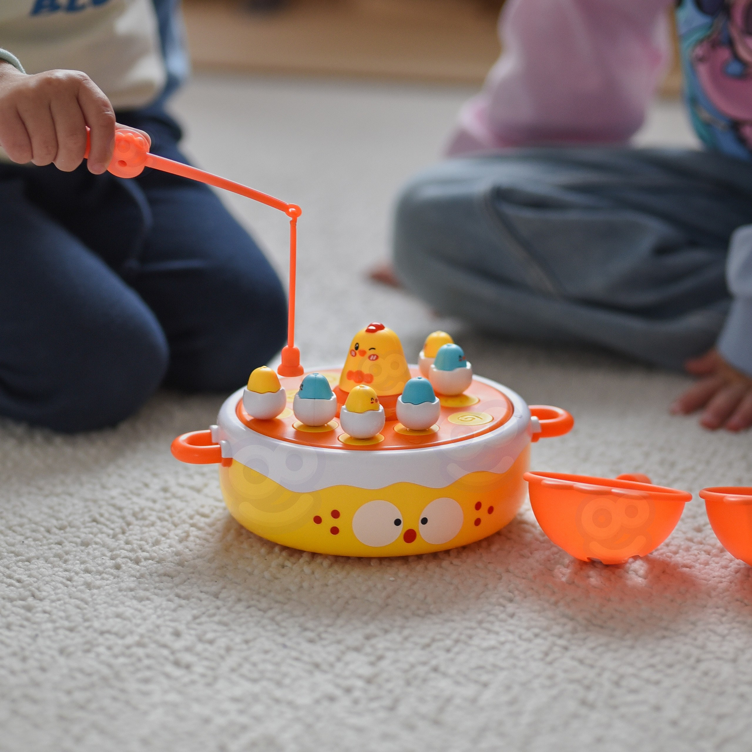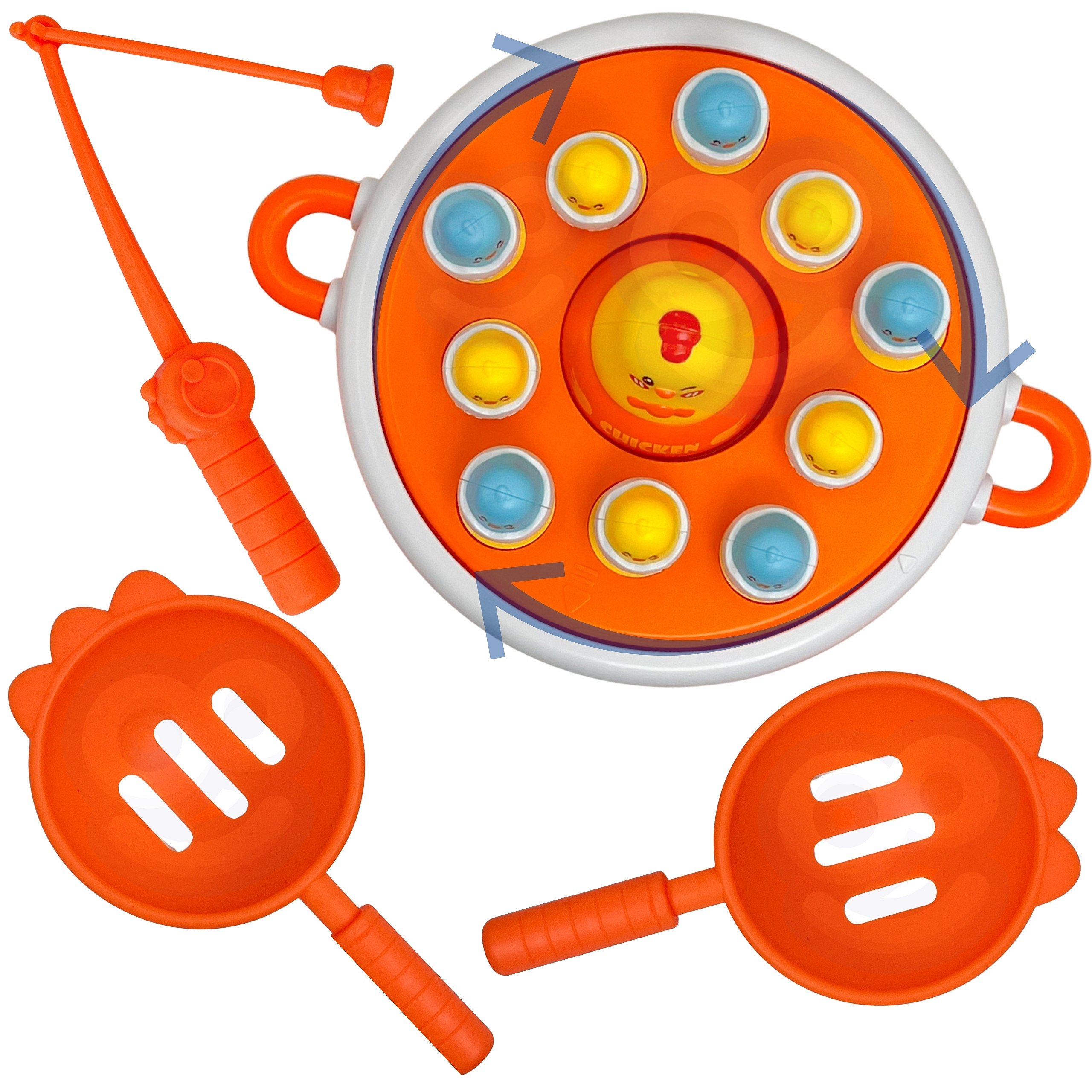 - - Łowienie piskląt wędką, katapulta do strzelania jajkami, obrotowy dysk muzyczny, i kurczak-samochodzik