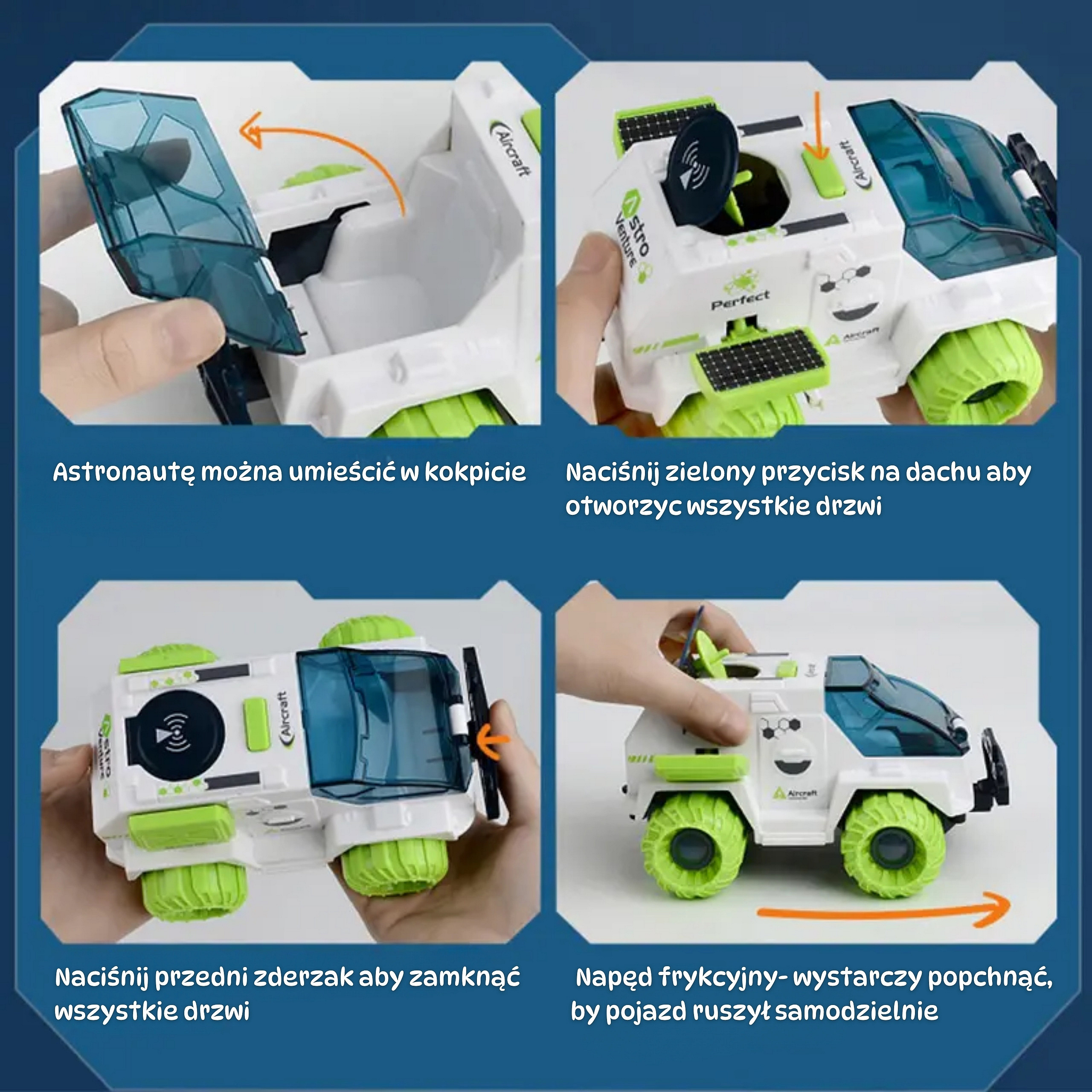 Wejdź do świata fascynującej eksploracji kosmosu z wyjątkowym Łazikiem kosmicznym od Woopie! Ten innowacyjny pojazd z figurką astronauty to idealna propozycja dla małych odkrywców, którzy marzą o podboju obcych planet . Dzięki przemyślanej konstrukcji i interaktywnym funkcjom, dziecko nie tylko świetnie się bawi, ale również rozwija swoje zdolności poznawcze, motoryczne i wyobraźnię. Kosmiczny pojazd zachwyca futurystycznym designem – białe nadwozie w połączeniu z jaskrawymi, zielonymi kołami i detalami sprawiają, że wygląda jak prawdziwa maszyna badawcza z NASA . Dzięki otwieranej kabinie maluch może bez problemu umieścić w środku astronautę, który zasiada za sterami, gotowy do nowych wyzwań. Na dachu pojazdu znajduje się interaktywny radar – po naciśnięciu przycisku, antena automatycznie się podnosi, co daje dodatkowy element zabawy i zaskoczenia. To nie wszystko! Po zakończeniu misji wystarczy nacisnąć przedni zderzak, a radar samoczynnie się chowa – to jak prawdziwa technologia kosmiczna w miniaturowym wydaniu! Antypoślizgowe, gumowe opony zapewniają stabilność jazdy na różnych powierzchniach, a napęd frykcyjny pozwala na dynamiczne poruszanie się pojazdu bez użycia baterii – wystarczy popchnąć, by autko ruszyło przed siebie z impetem! To znakomity sposób na pobudzenie aktywności fizycznej i koordynacji dziecka. Zestaw idealnie sprawdzi się jako prezent dla każdego dziecka zainteresowanego nauką, kosmosem, techniką i przygodą. Doskonale wpisuje się w potrzeby zarówno chłopców, jak i dziewczynek, rozwijając szereg ważnych umiejętności. To nie tylko zabawka – to początek prawdziwej przygody międzygwiezdnej, która rozpoczyna się w Twoim domu!