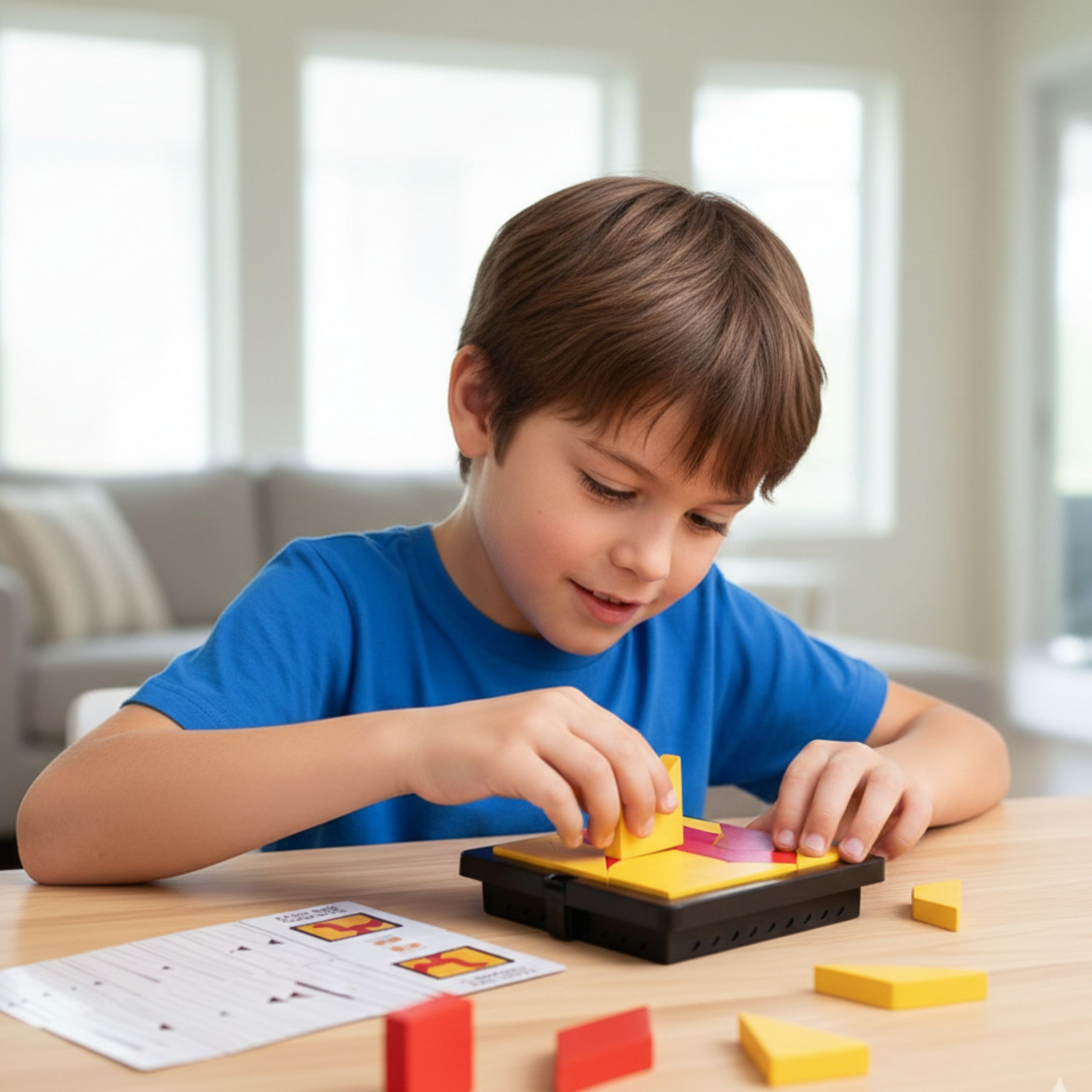 - Twoim zadaniem jest ułożyć wzór przedstawiony na karcie, używając dostępnych klocków. Klocki możesz obracać, przekładać i zmieniać ich pozycję