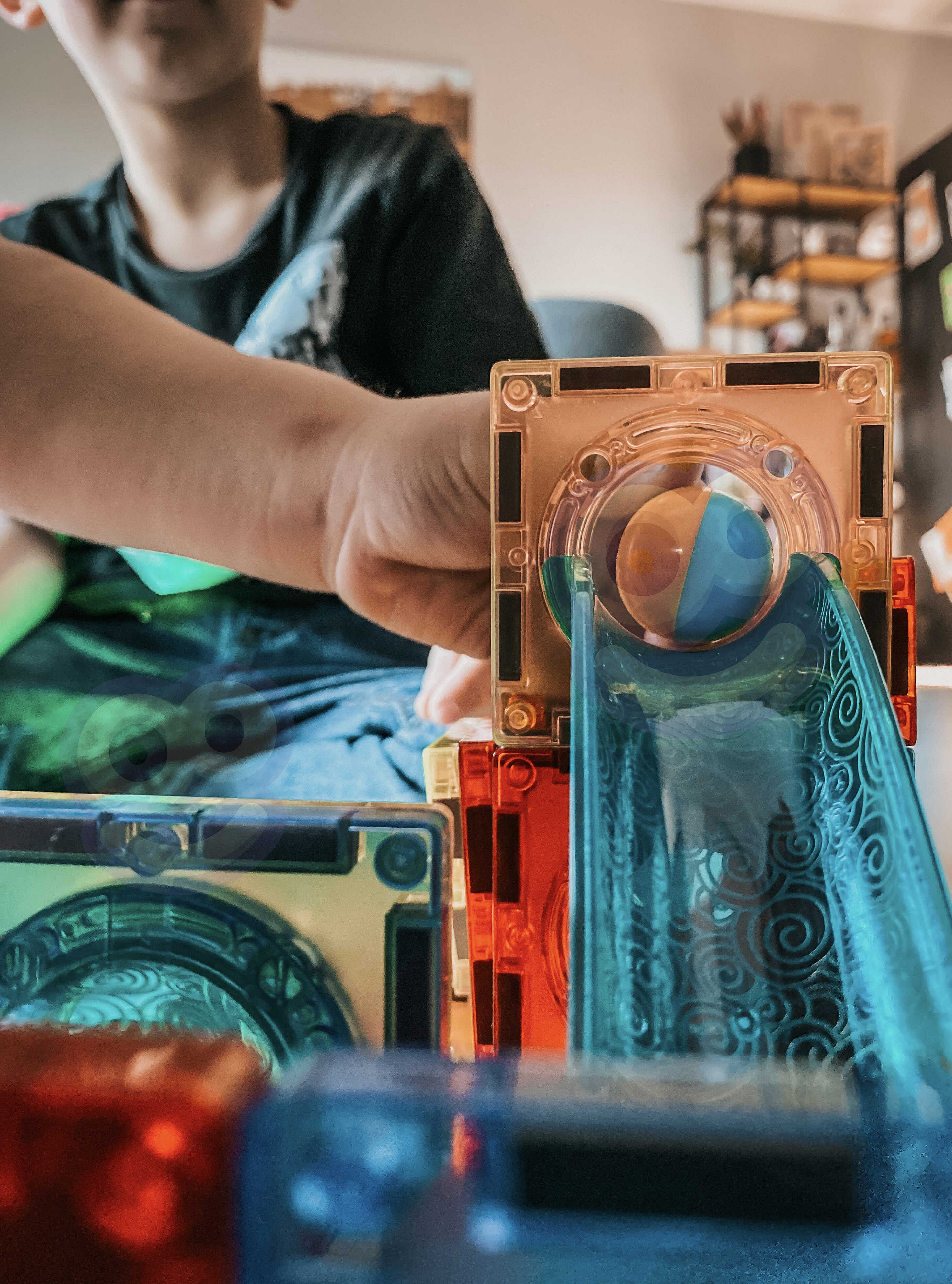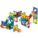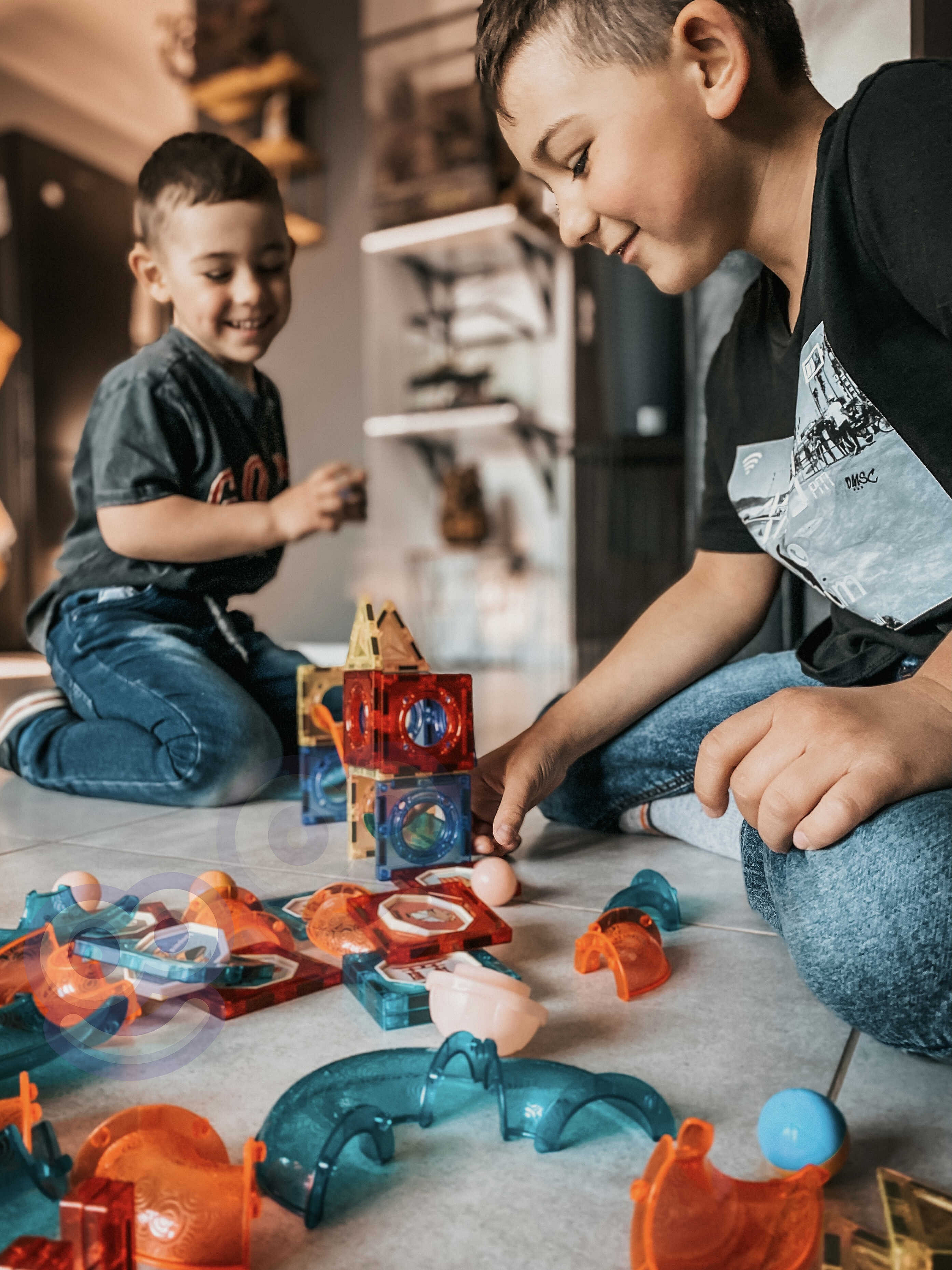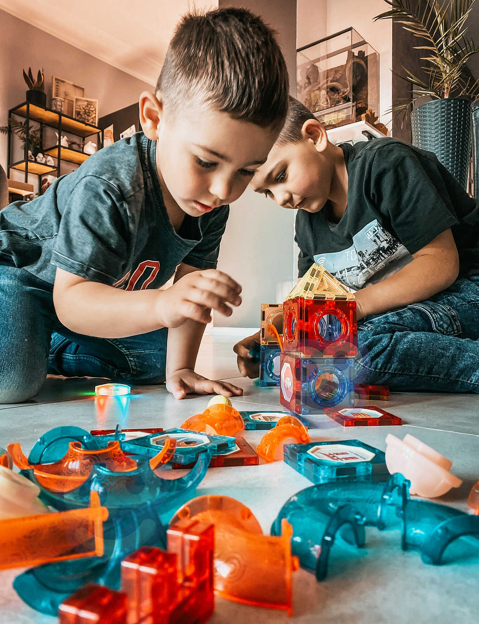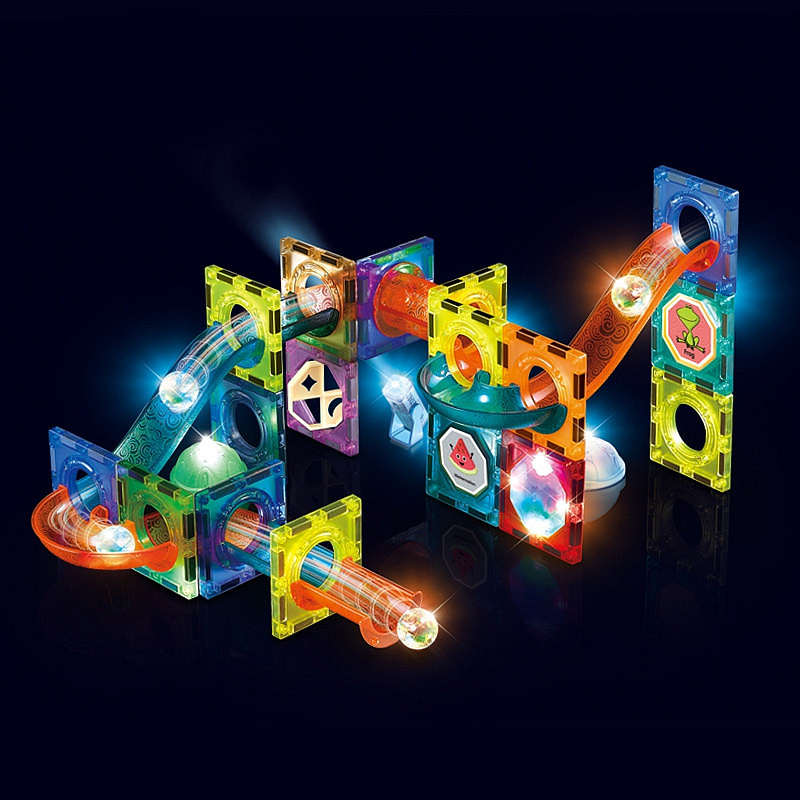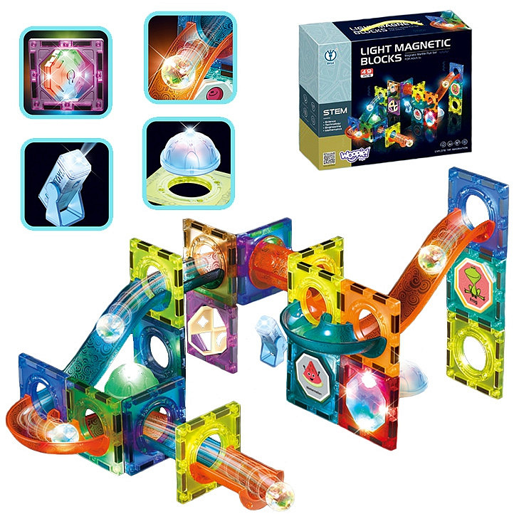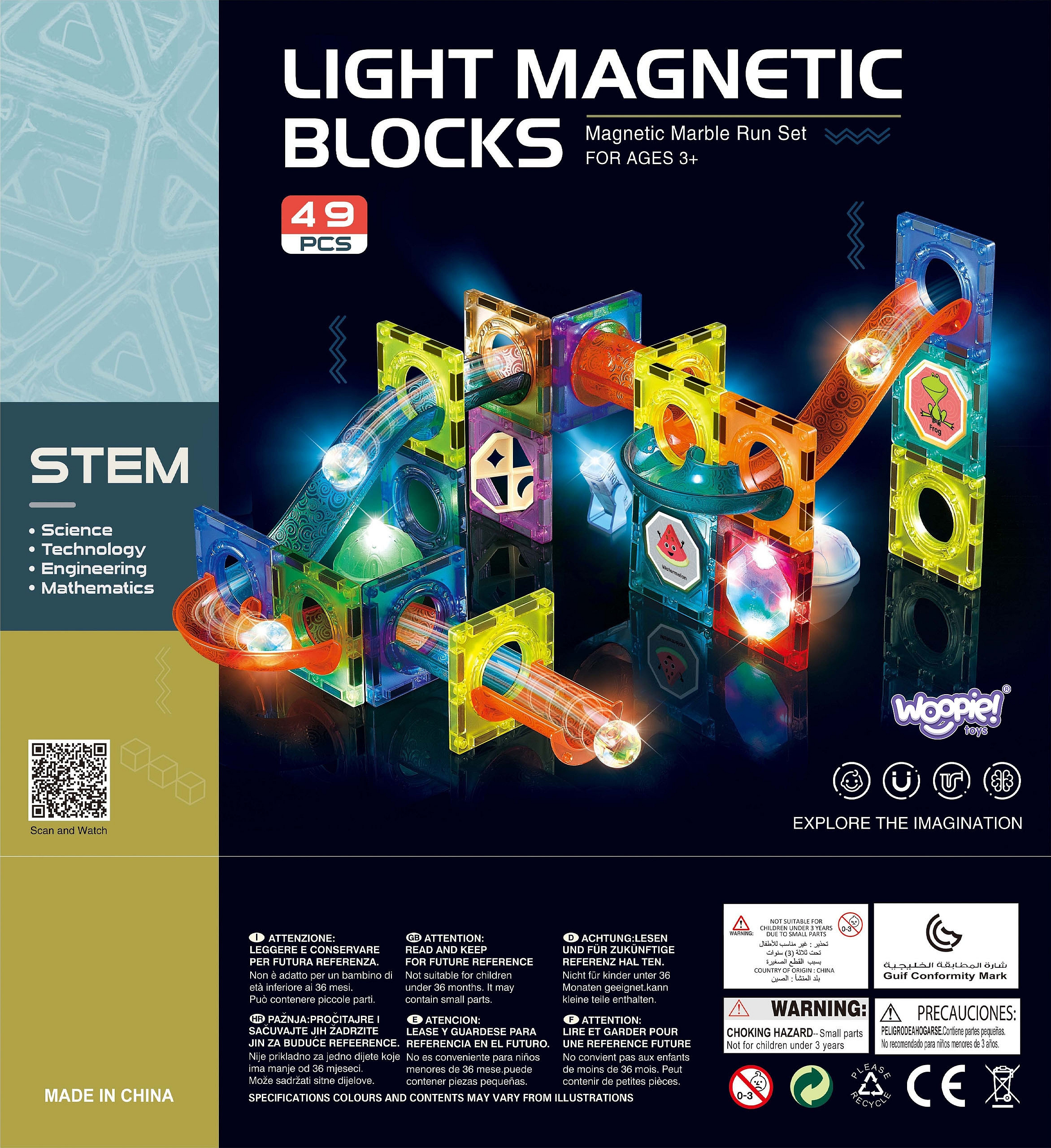 Klocki Magnetyczne od marki WOOPIE zwrócą uwagę i zafascynują Twoje dziecko. Klocki w bardzo łatwy sposób łączą się ze sobą, można z nich stworzyć wspaniałe konstrukcje ze zjeżdżalniami np. tor po którym przemieszcza się kulka. Tor można podświetlić dołączoną latarką, aby robił jeszcze większe wrażenie, a samo dziecko może wtedy zaobserwować jak przemieszcza się światło, co rozwinie u niego percepcję. Samo ułożenie toru tak, aby kulki bez problemu dochodziły do końca rozwinie u dziecka logiczne myślenie, wyobraźnie, kreatywność oraz pozwoli skoncentrować się podczas tworzenia konstrukcji. Przez układanie klocków dziecko poznaje kształty i kolory oraz ćwiczy zdolności manualne tzw. motorykę małą.