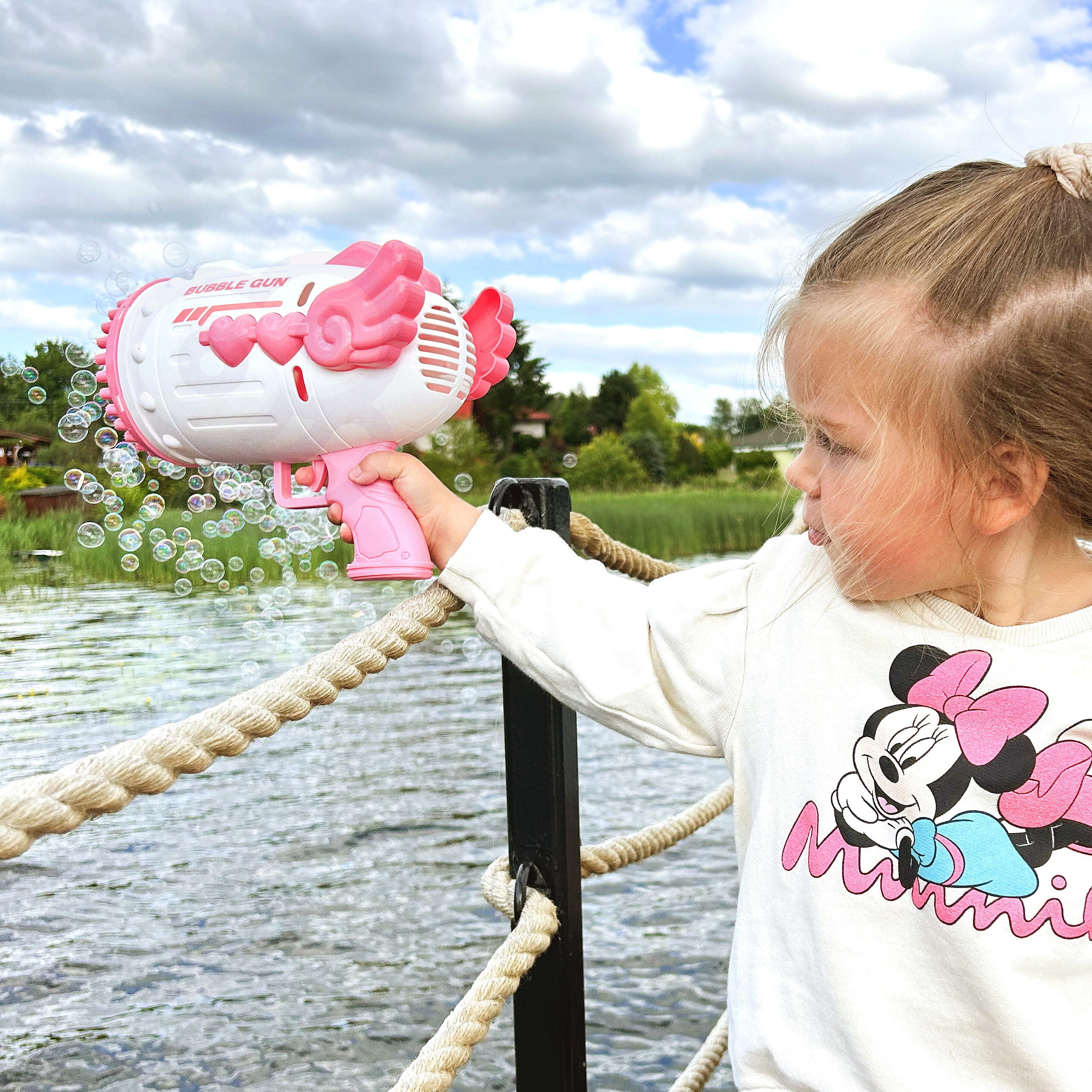 Maszyna do robienia baniek w kształcie pistoletu marki WOOPIE to świetna zabawka dla dzieci. Wypuszczone bąbelki wystrzeliwane są z dużą częstotliwością dzięki 91 otworom. Bańki mydlane to ulubiona zabawa małych i dużych dzieci. Pistolet do baniek mydlanych jest idealnym prezentem ponieważ jest łatwy w użyciu i zapewnia dużo radości- za jednym naciśnięciem spustu z pistoletu wylatuje mnóstwo baniek. Dodatkowo w zestawie znajdziemy 2 pojemniczki z płynem na bańki. Zabawka idealnie sprawdzi się podczas zabawy na dworze oraz w domu. Aby puszczać bańki mydlane wystarczy po zamontowaniu akumulatora zamoczyć pistolet w płynie znajdującym się na podstawce, nacisnąć na spust pistoletu i już! W jednej chwili mamy piękny, bajkowy świat, którym zachwycą się zarówno dzieci jak i dorośli.