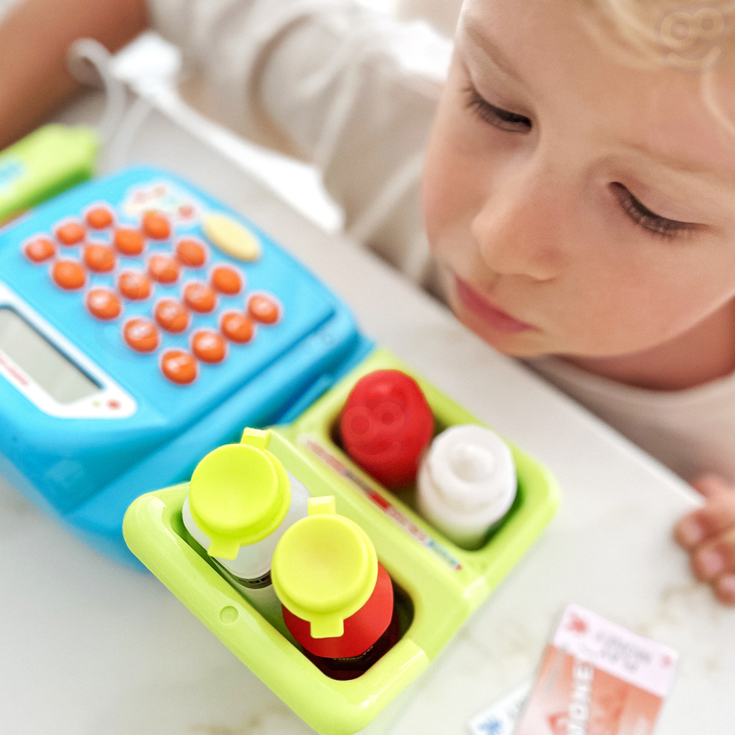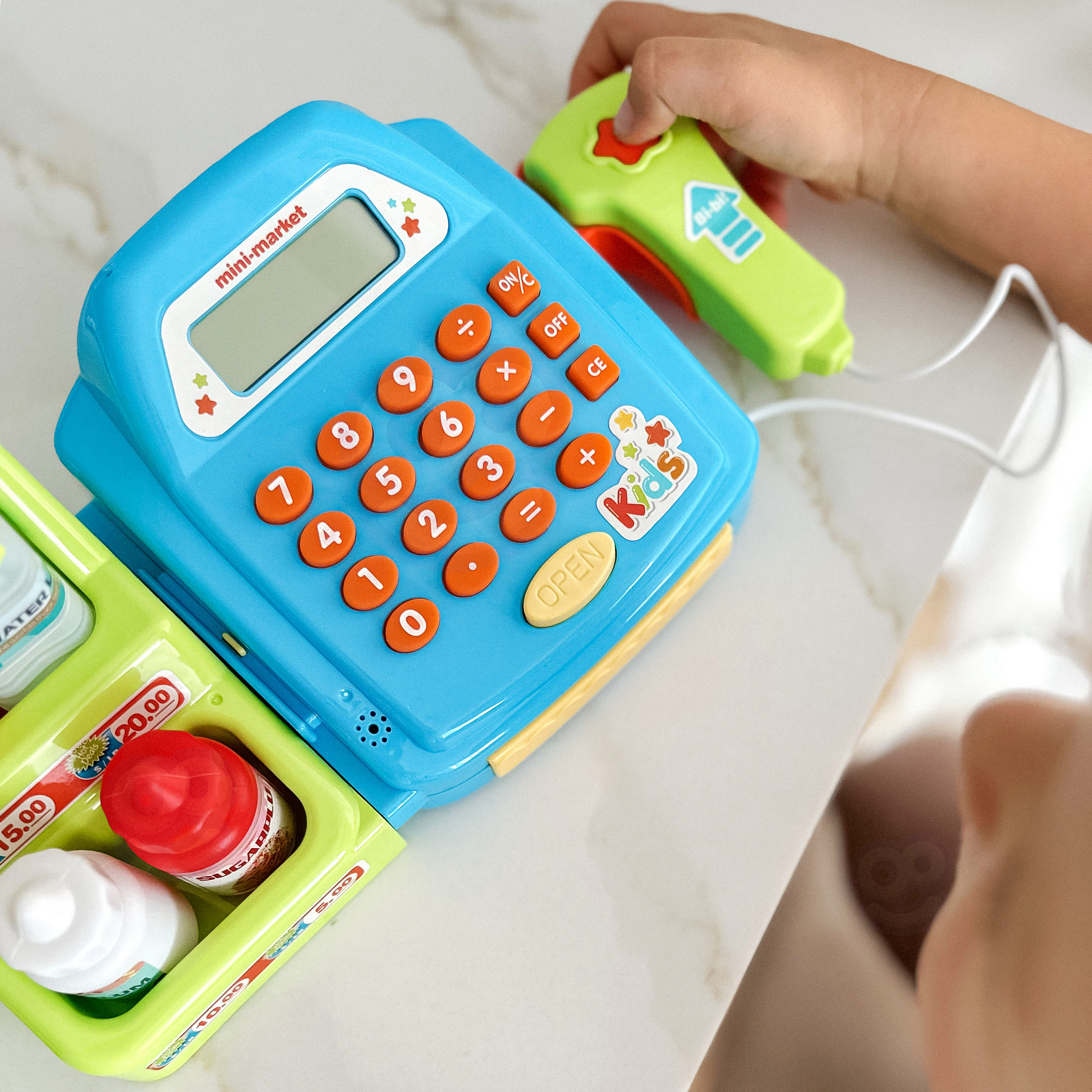 - kasę sklepową z kalkulatorem i otwieraną kasetka na przechowywanie pieniążków,
