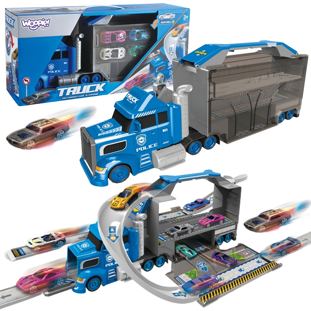 Zestaw ciężarówka policyjna to wielofunkcyjna zabawka od marki Woopie, która w jednej chwili może pełnić rolę klasycznej ciężarówki transportowej, a po rozłożeniu zamienia się w rozbudowany tor wyścigowy z wyrzutnią. Główna część zestawu to duża, efektowna ciężarówka stylizowana na pojazd policyjny, która pełni funkcję zarówno pojazdu transportowego, jak i przenośnej walizki na samochodziki i akcesoria. Po otwarciu naczepy i rozłożeniu elementów, użytkownik zyskuje dostęp do garażu oraz toru wyścigowego, na którym można organizować emocjonujące wyścigi i pojedynki samochodowe.