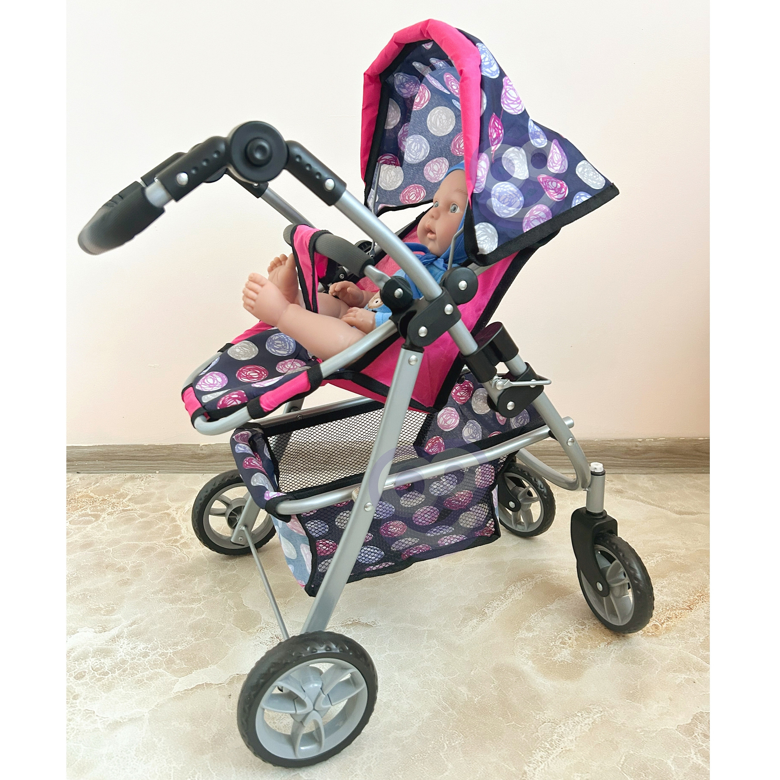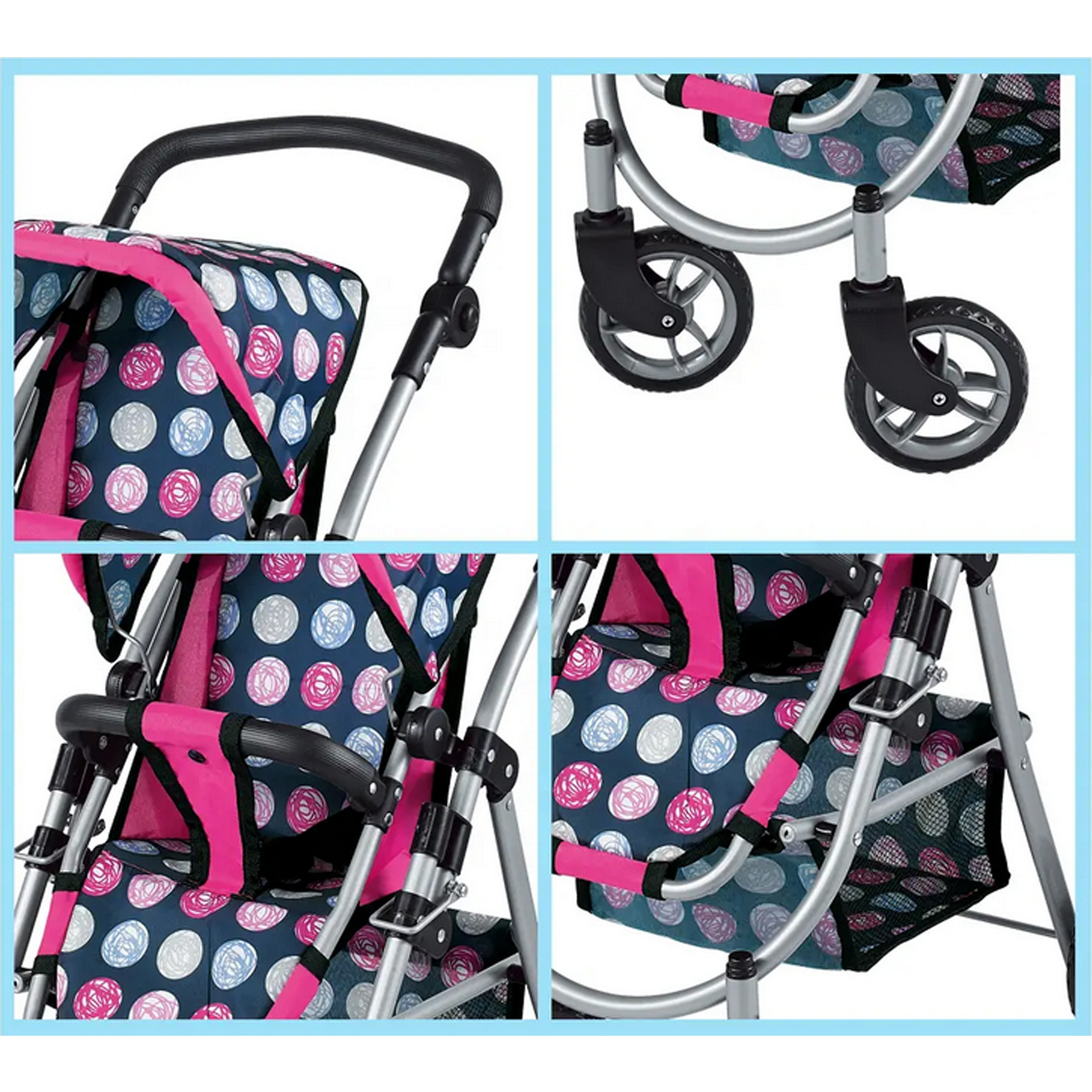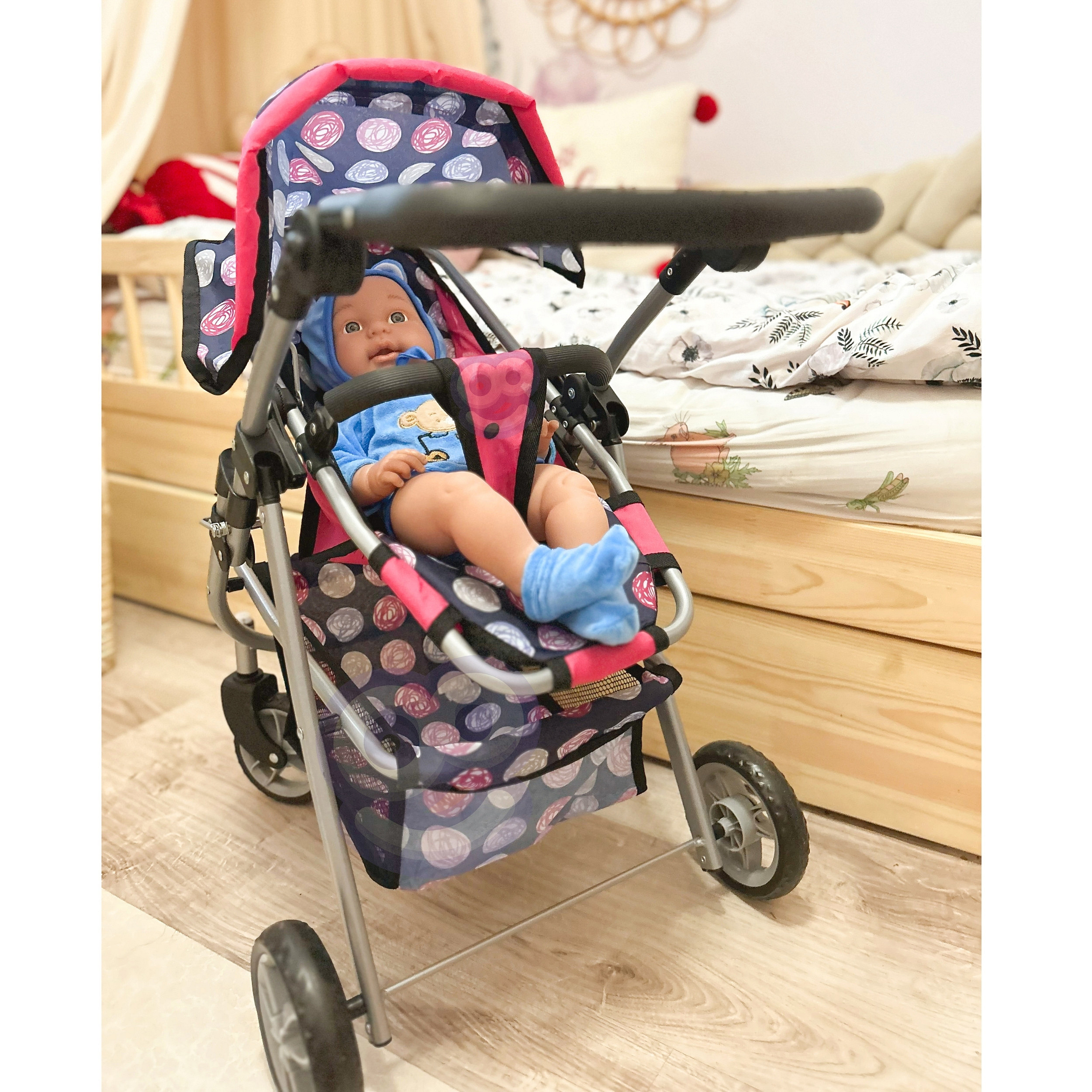 Stylový a funkční kočárek pro panenky od značky WOOPIE je vysněným dárkem každé malé milovnice hry s panenkami. Díky nastavitelnému sedadlu jej lze snadno přizpůsobit různým potřebám hry, což umožňuje přepravu oblíbených panenek. Otočná přední kola zaručují plynulost řízení a pevná konstrukce zajišťuje stabilitu během procházek. Kočárek je vybaven měkkou, pohodlnou rukojetí a prostorným košíkem na doplňky, který pojme všechny drobnosti nezbytné během hry. Skládací stříška chrání panenky před "sluncem" a kompaktní konstrukce zajišťuje, že kočárek lze snadno uložit, když hra skončí.