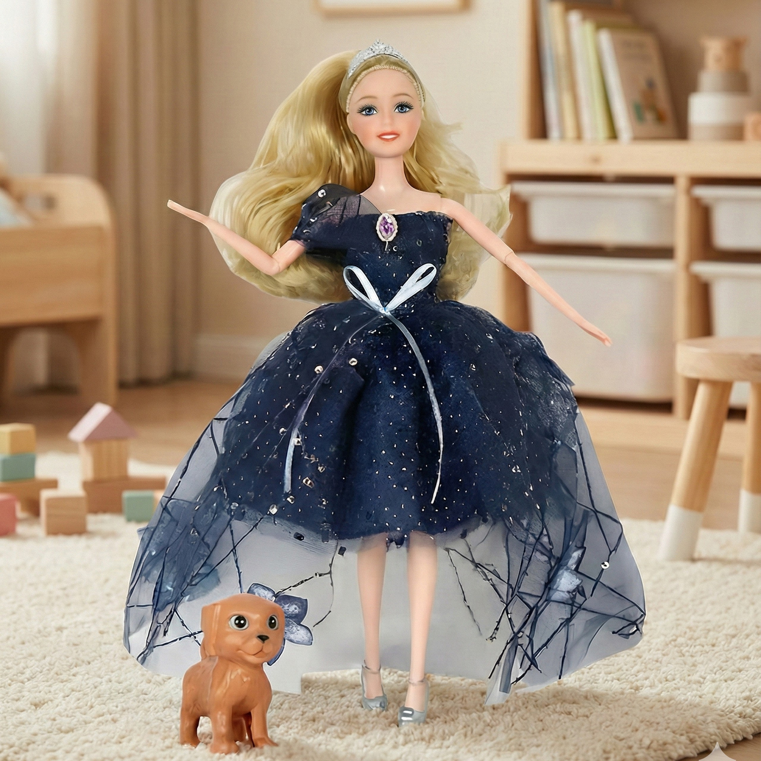 Lalka Emi z pieskiem i elegancką suknią od marki Woopie to wyjątkowa zabawka, która przeniesie każde dziecko w magiczny świat mody i marzeń. Piękna lalka o długich, blond włosach z koroną na głowie, ubrana w błyszczącą granatową suknię z kokardą i tiulowym wykończeniem, zachwyci każdą małą miłośniczkę stylu. W zestawie znajduje się również uroczy piesek – wierny towarzysz zabawy. Zabawka wyróżnia się wysoką jakością wykonania, nowoczesnym designem oraz licznymi detalami, które sprawiają, że zabawa staje się jeszcze bardziej realistyczna i angażująca. Zestaw z lalką Emilka to nie tylko piękna ozdoba pokoju, ale przede wszystkim źródło radości, kreatywności i rozwoju dla Twojego dziecka. Dzięki niej maluch może tworzyć własne historie, bawić się w pokaz mody czy przyjęcie z pupilem. To gwarancja długich godzin beztroskiej zabawy pełnej uśmiechu i fantazji!
