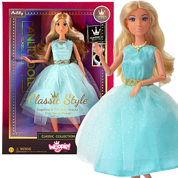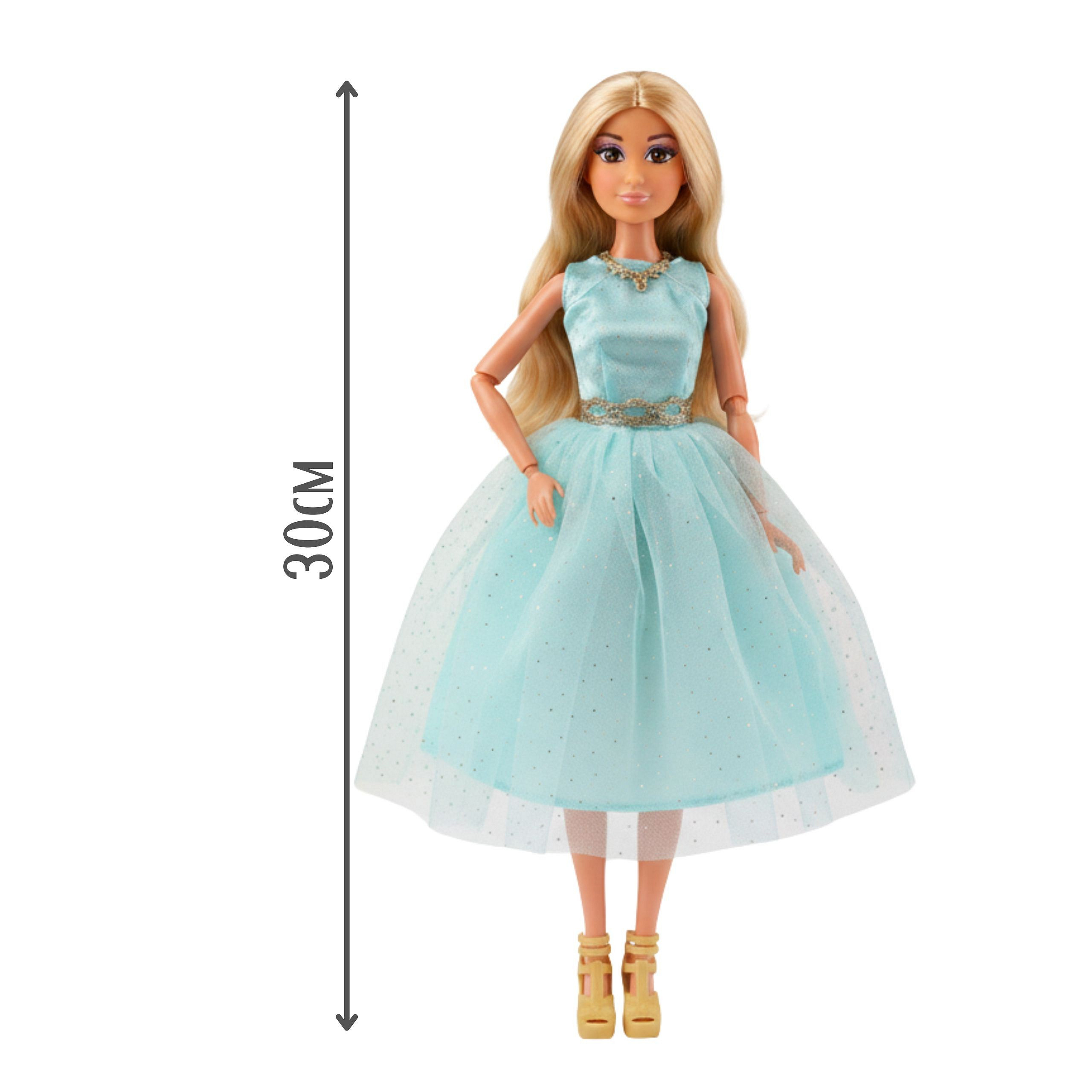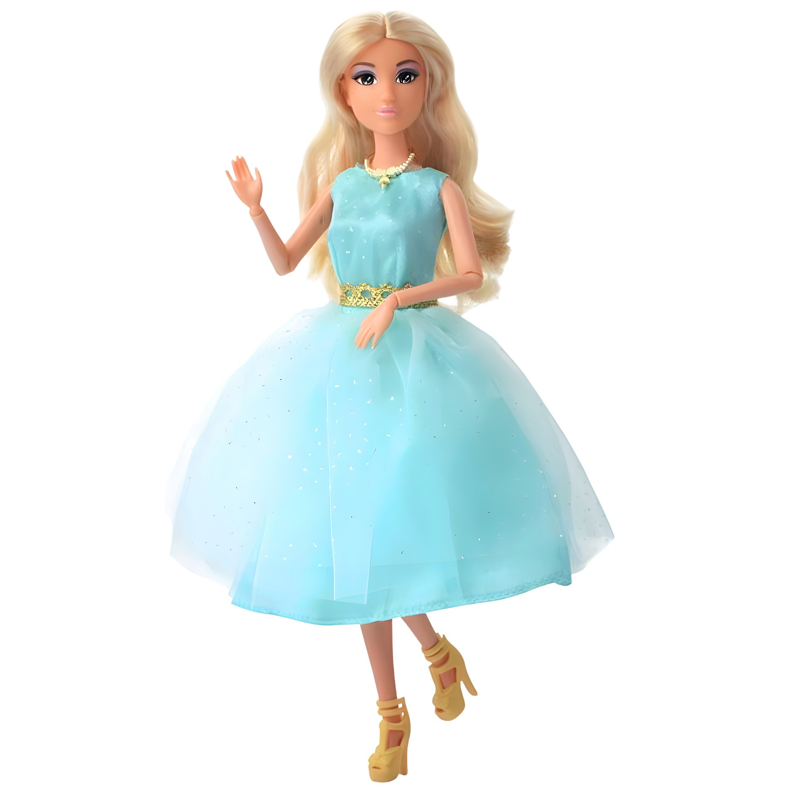 Poznaj przepiękną lalkę Lily marki Woopie Royal, która zachwyca ponadczasowym stylem i wyjątkową elegancją. Ta urocza blondynka o długich, lśniących włosach ubrana jest w bajkową sukienkę balową w odcieniu turkusu, która mieni się delikatnymi błyskami. Tiulowa spódnica nadaje kreacji lekkości i uroku, a złote dodatki – naszyjnik i pasek – podkreślają jej charakter. Dopełnieniem stylizacji są eleganckie złote szpilki, które sprawiają, że lalka wygląda jak prawdziwa gwiazda balu. To idealna towarzyszka zabawy dla każdej małej marzycielki, która uwielbia świat mody, elegancji i bajkowych