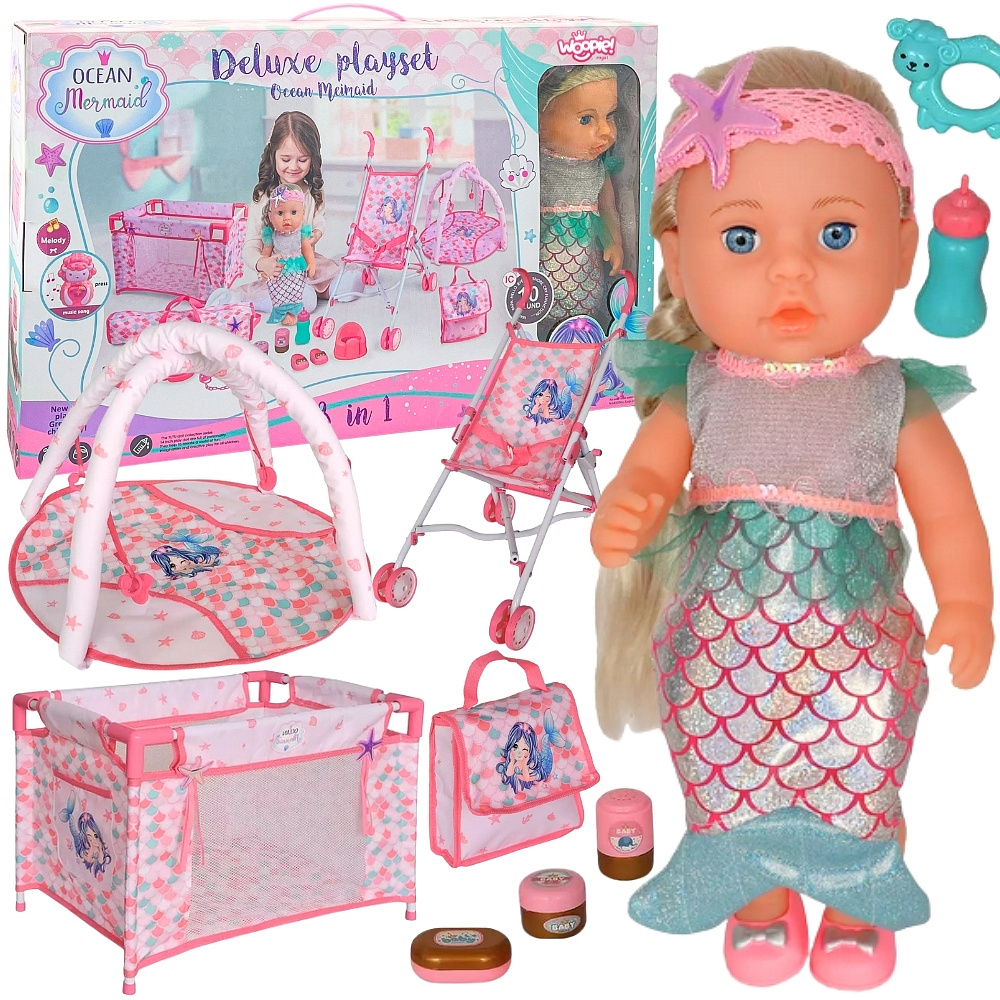 Odkryj bajkowy świat morskich przygód z wyjątkowym zestawem Deluxe Playset Ocean Mermaid 18 w 1! Ten bogaty komplet to gwarancja wielu godzin kreatywnej i radosnej zabawy. Największą atrakcją jest urocza Lalka Syrenka, która wydaje aż 10 różnych dźwięków, zachwycając każdą małą fankę oceanu. W komplecie znajdziesz wózek, łóżeczko, torby oraz liczne akcesoria, które pozwolą bawić się w opiekę i odgrywanie ról. To doskonały prezent, który wspiera rozwój wyobraźni, empatii i umiejętności społecznych dziecka!