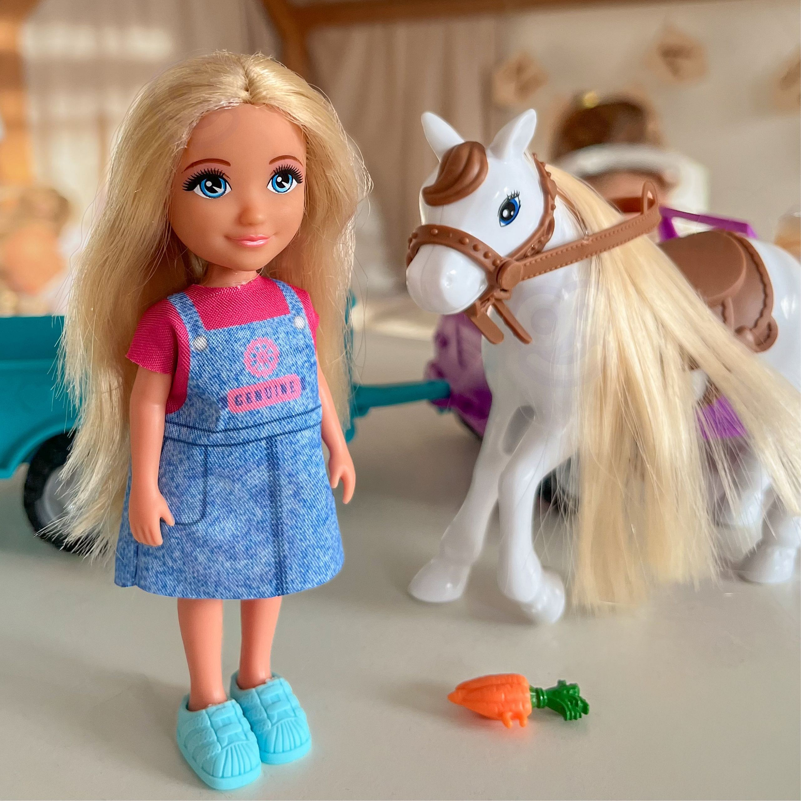 Wyrusz na wiejskie przygody z zestawem Kiki Lalka z Koniem, Samochodem i Przyczepą od marki Woopie! Ten obszerny zestaw do odgrywania ról z motywem ranczo/farmy zawiera mini lalkę, która potrafi usiąść za kierownicą fioletowego pojazdu terenowego. Doczep do niego turkusową przyczepę, aby przewieźć swojego konia! Lalka ma długie, blond włosy, które można czesać, a koń posiada siodło i uzdę. To idealna zabawka, która rozwija wyobraźnię i kreatywność oraz pozwala na tworzenie nieskończonej ilości scenariuszy związanych z życiem na farmie. Zestaw przeznaczony jest dla dzieci od 3 roku życia.