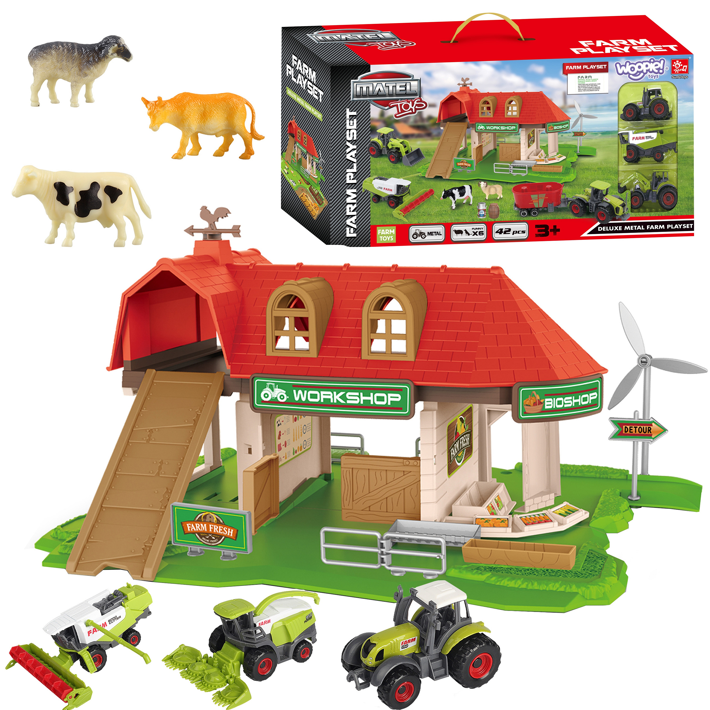 Zestaw Farma Sklepik z Traktorami od marki WOOPIE to idealna zabawka dla miłośnika wiejskiego życia. W zestawie oprócz super farmy znajdują się 3 figurki zwierząt, 3 różnego rodzaju traktory/kombajny - łącznie aż 42 elementy. Farma jest dość nowoczesna, ma 2 poziomy i również znajduje się na niej m.in sklepik z bio żywnością, co dodatkowo rozwinie świadomość ekologii u dziecka. Figurki zostały bardzo dokładnie odwzorowane i są bardzo wytrzymałe. Dzięki zabawie w farmę maluch poszerzy zakres swojej wyobraźni i kreatywności.