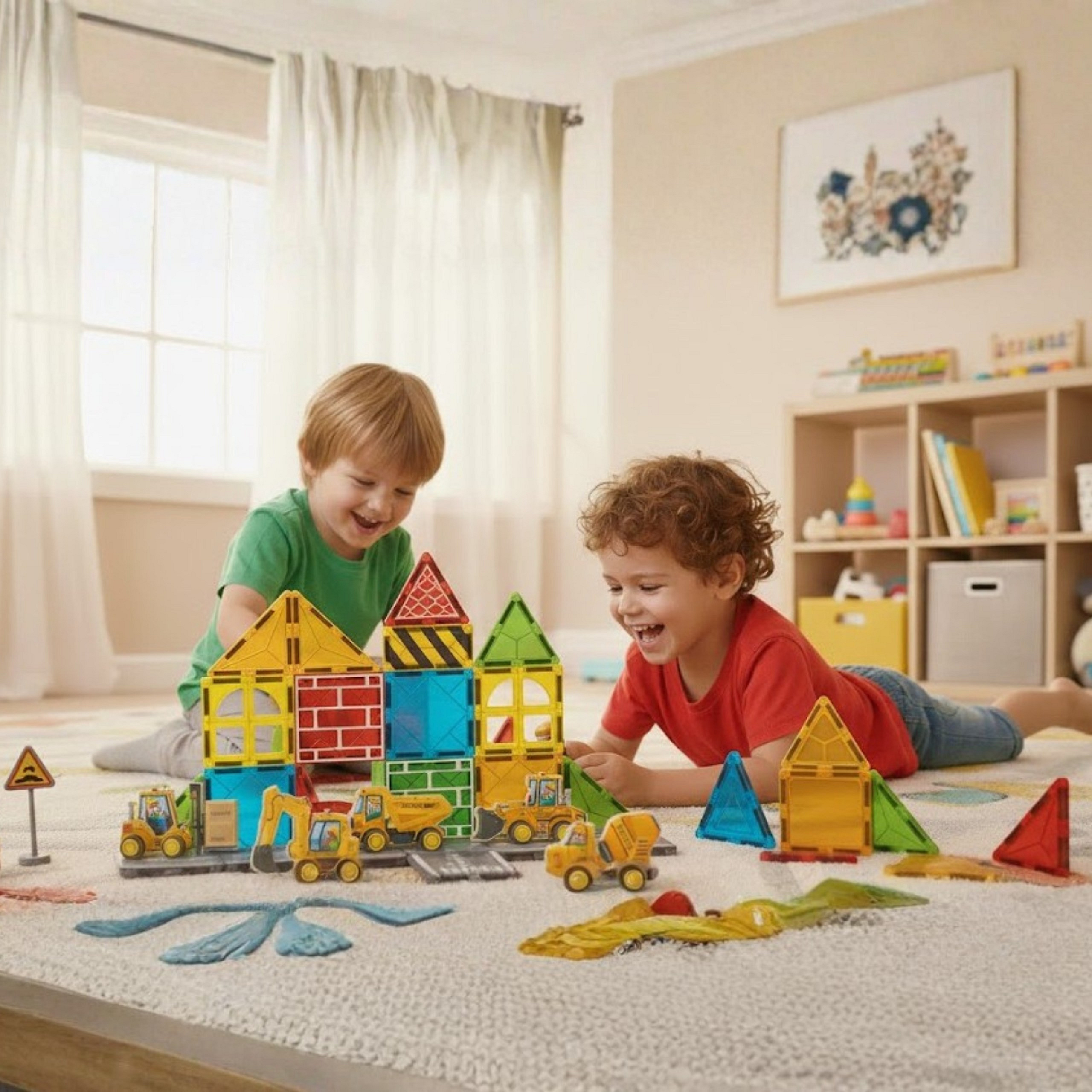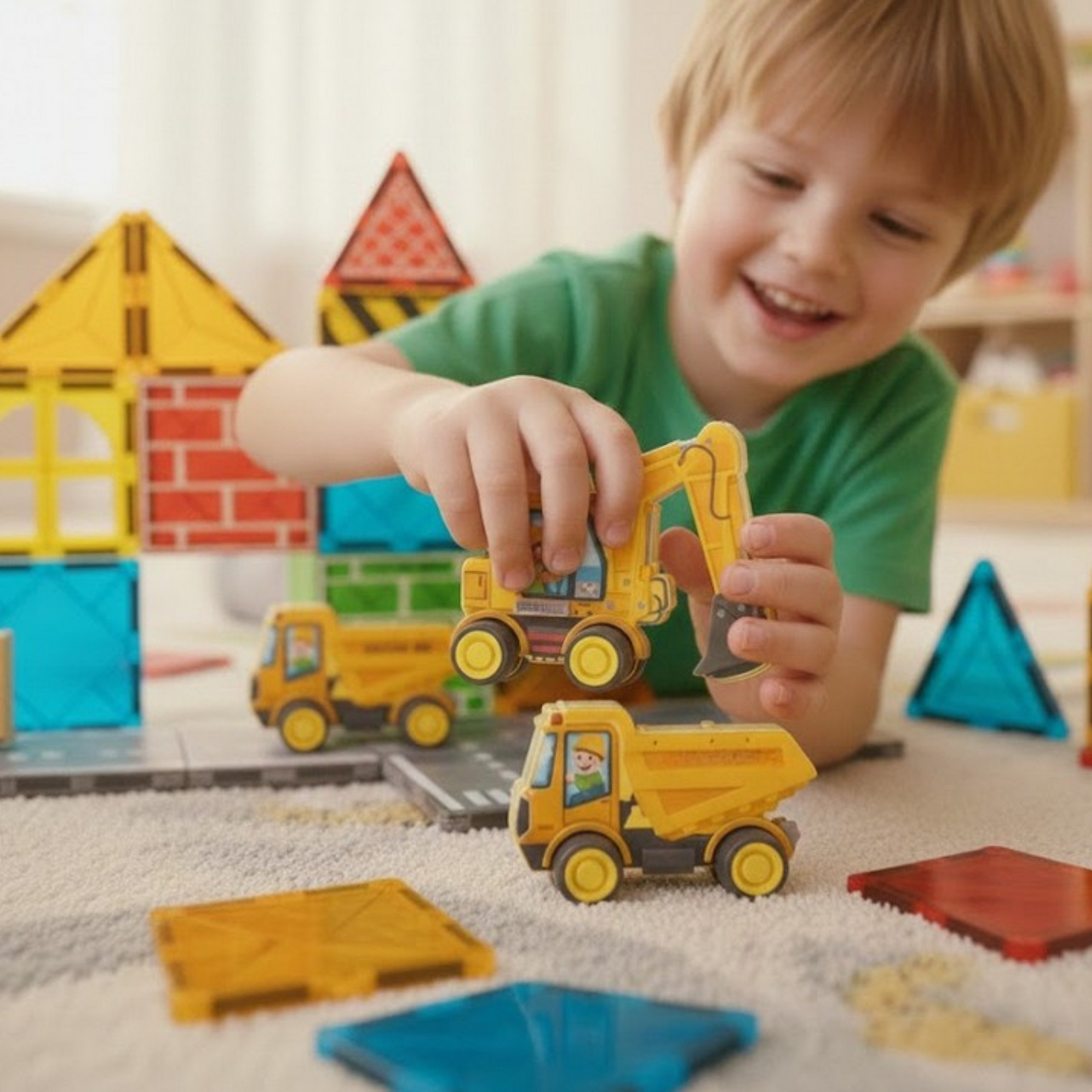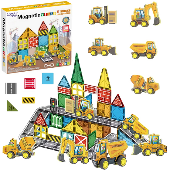 - - Zestaw konstrukcyjny z magnetycznymi klockami i pojazdami budowlanymi