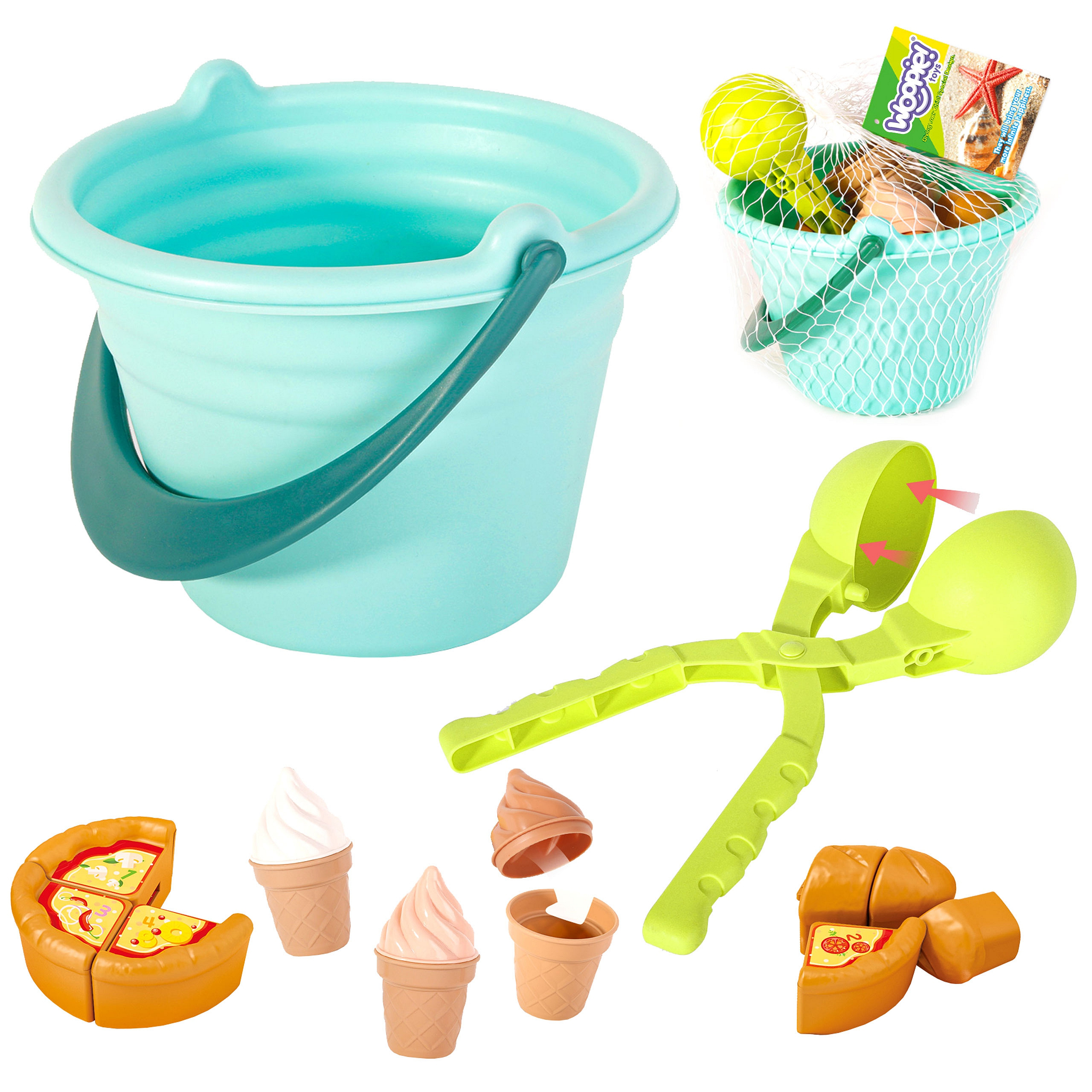 Wiaderko z lodami do piasku marki Woopie jest kompletnym zestawem do zabawy, który dodatkowo rozwinie wyobraźnie i kreatywność podczas zabawy z piaskiem! Smacznie wyglądające lody pobudzą wyobraźnie twojego dziecka i zachęcą do zabawy w upalne dni. W zestawie znajdziemy również pizzę oraz chleb, które mogą być podzielone na mniejsze kawałki. Łyżka może być wykorzystana do zabawy ze śniegiem.