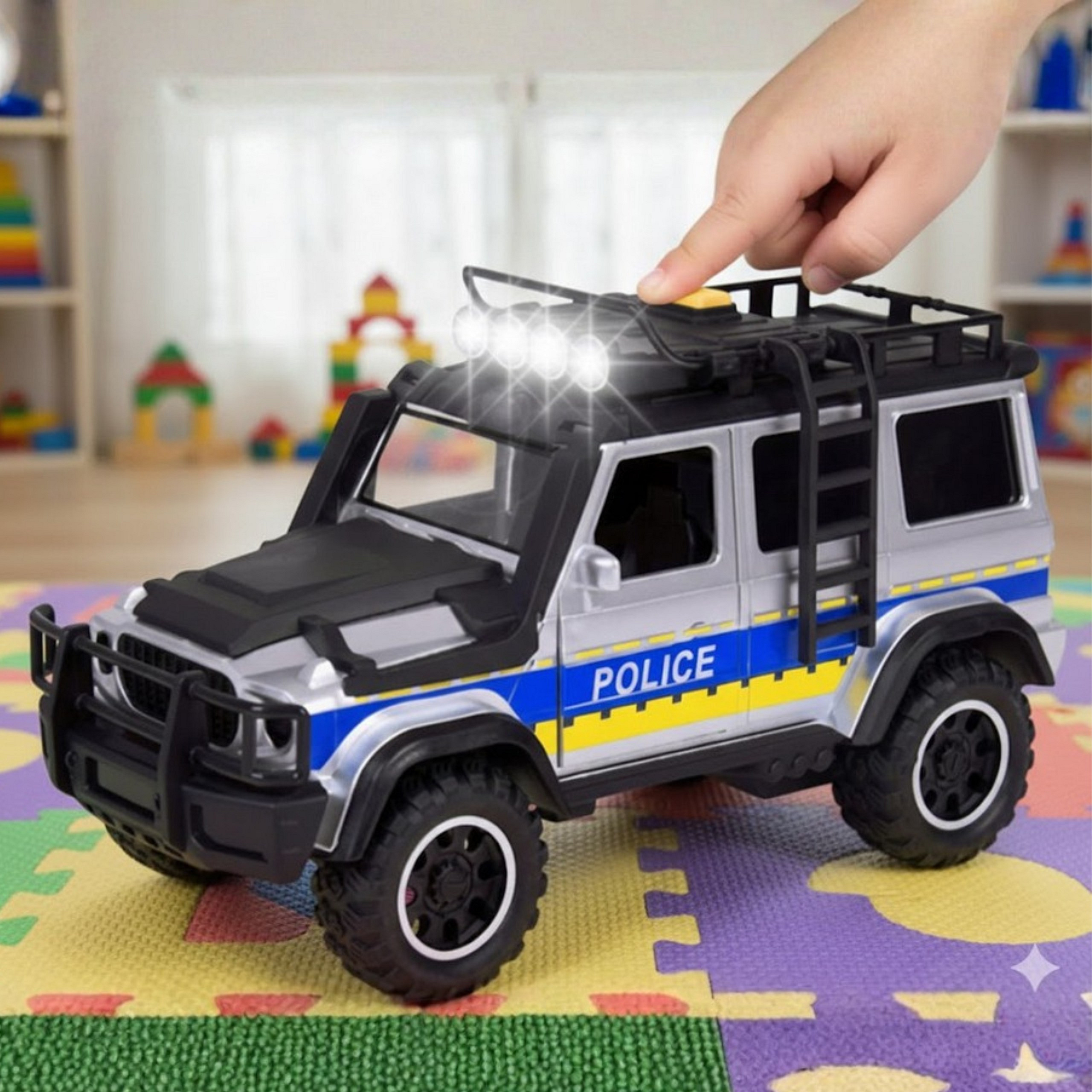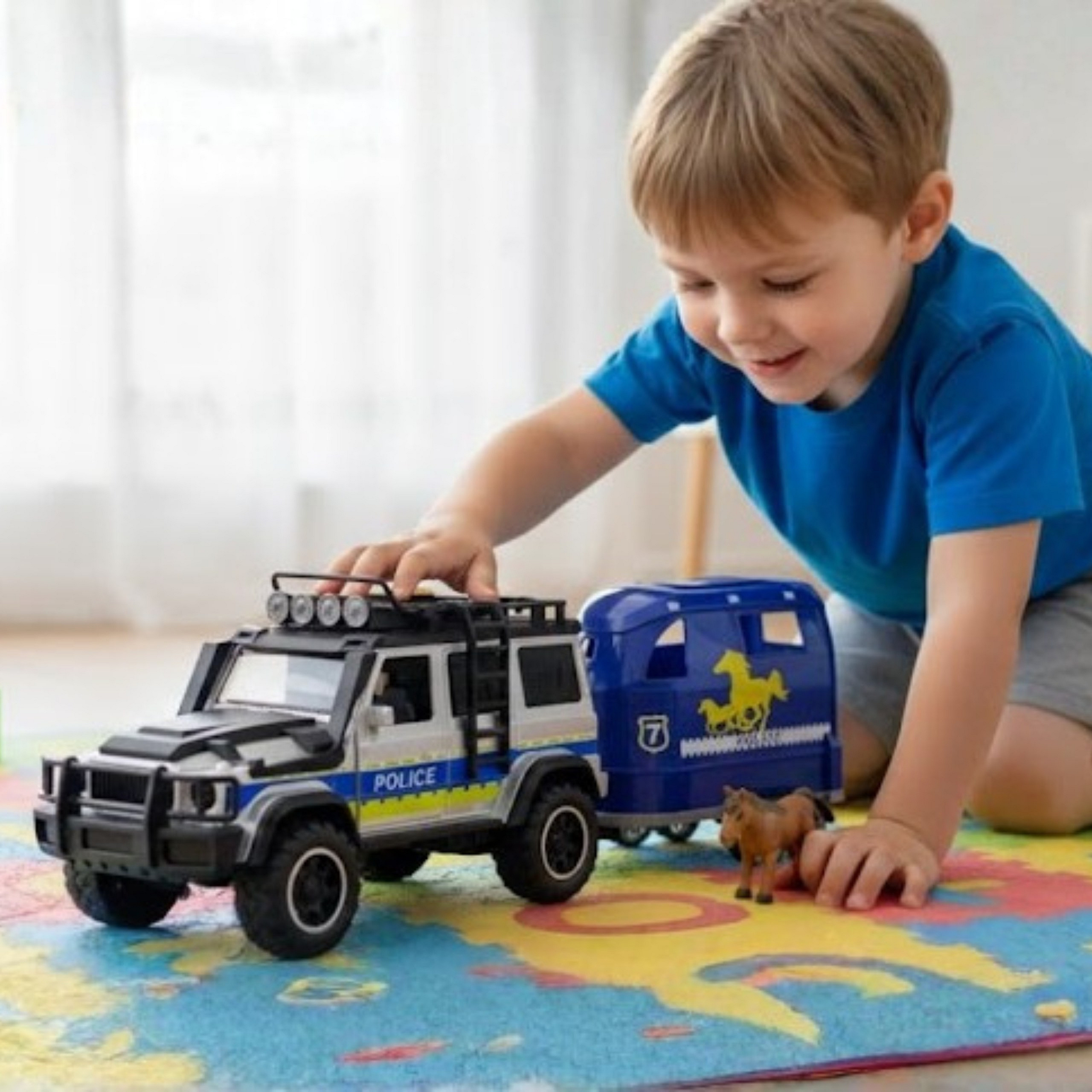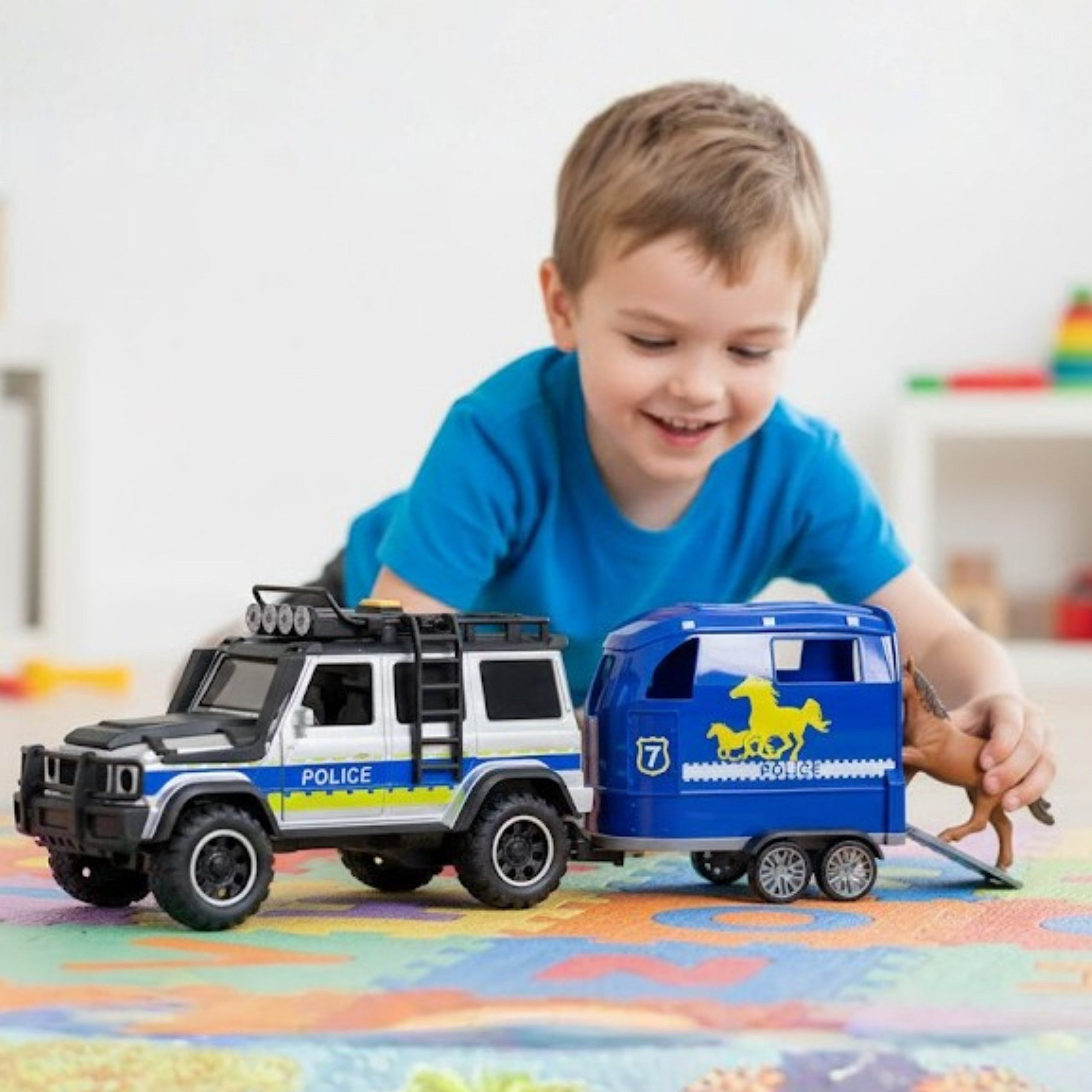 Wyrusz na emocjonującą akcję policyjną z realistycznym zestawem samochodu terenowego i przyczepy do przewozu koni od marki WOOPIE! Czarno-niebieski pojazd wykonany z wysokiej jakości tworzywa zachwyca szczegółami i dbałością o detale. Efekty świetlne i dźwiękowe sprawiają, że zabawa nabiera prawdziwego charakteru służb specjalnych. Otwierane drzwi oraz odpinana przyczepa pozwalają na tworzenie niezliczonych scenariuszy zabawy. To idealny zestaw dla małych fanów policji, motoryzacji i kreatywnej zabawy w akcje ratunkowe!