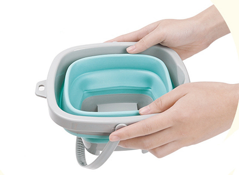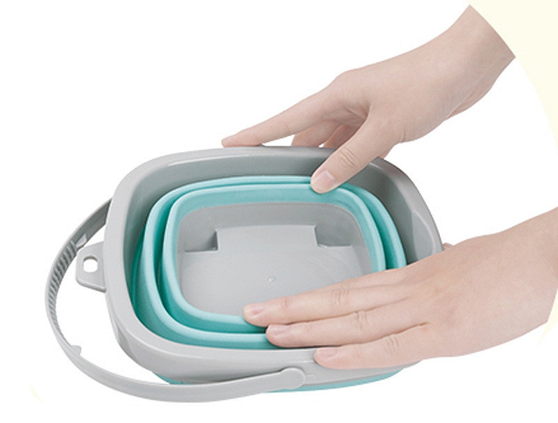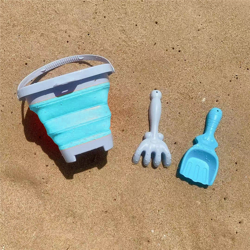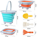 Góra, spód i rączka wiaderka są plastikowe, a ścianki wykonane są z grubego silikonu składanego harmonijkowo. Plastikowe są również grabki i łopatka.