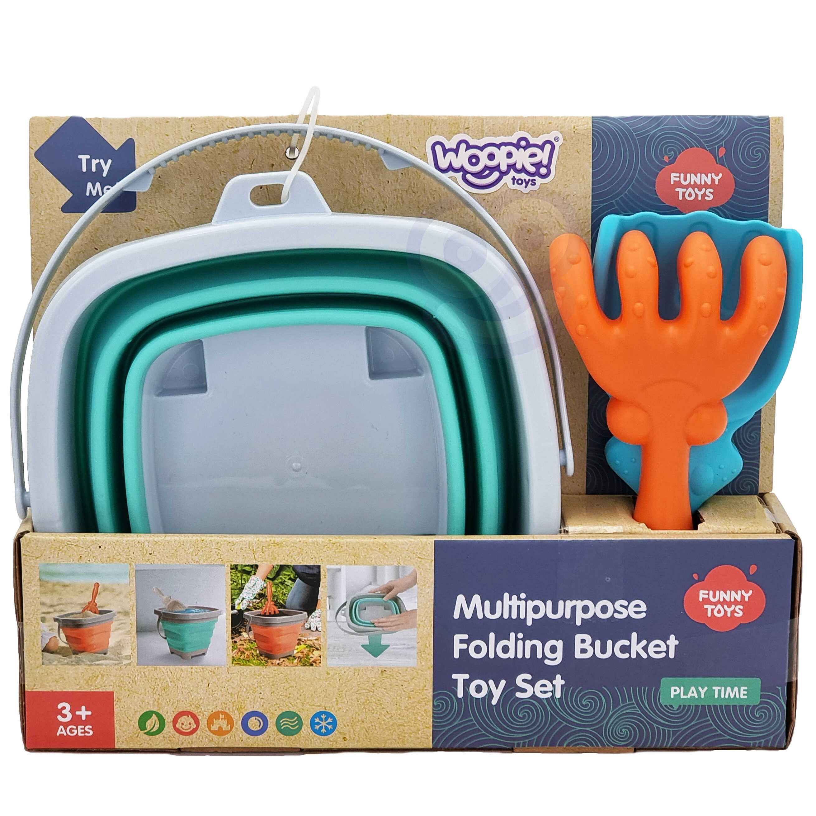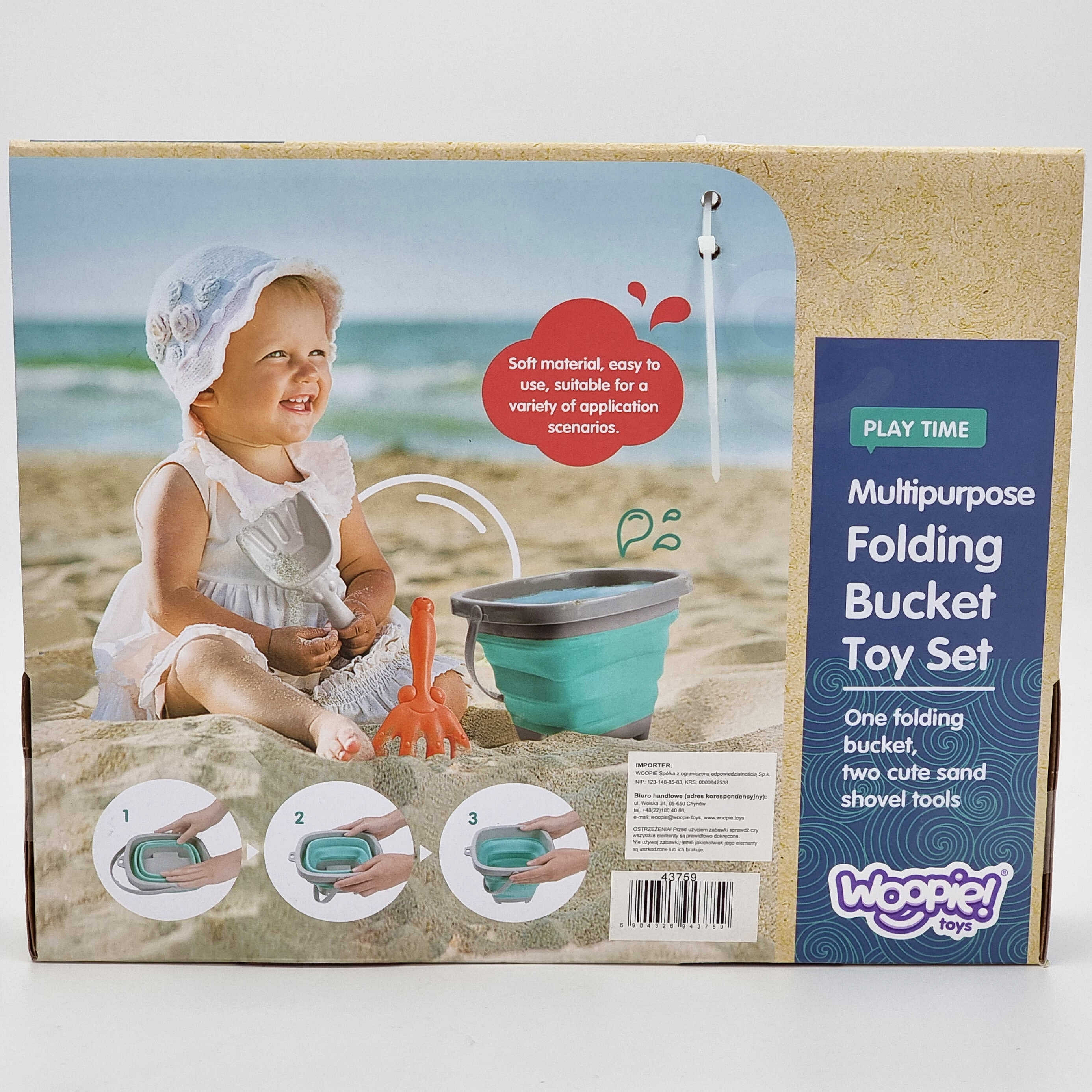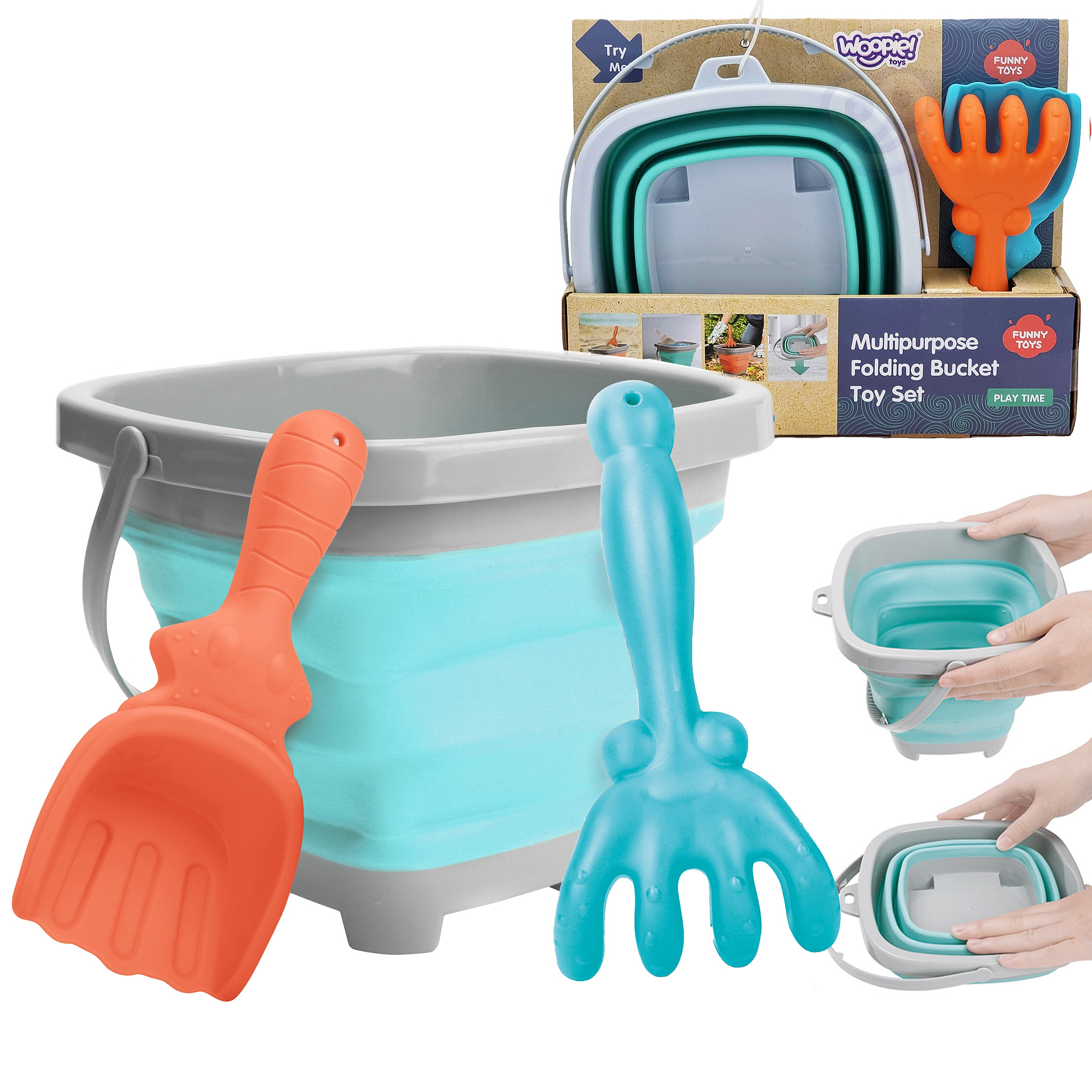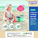 Silikonowe wiaderko z grabkami i łopatką od marki WOOPIE. Fantastyczne wiaderko do piaskownicy, na plażę lub do ogrodu, dzięki któremu dzieci miło spędzą czas na świeżym powietrzu. Wiaderko, dzięki składanej konstrukcji, zajmuje niewiele miejsca, jest łatwe w transporcie i wygodne do przechowywania. Zestaw zmieści się do dziecięcego plecaczka, do wózka czy plażowej torby.