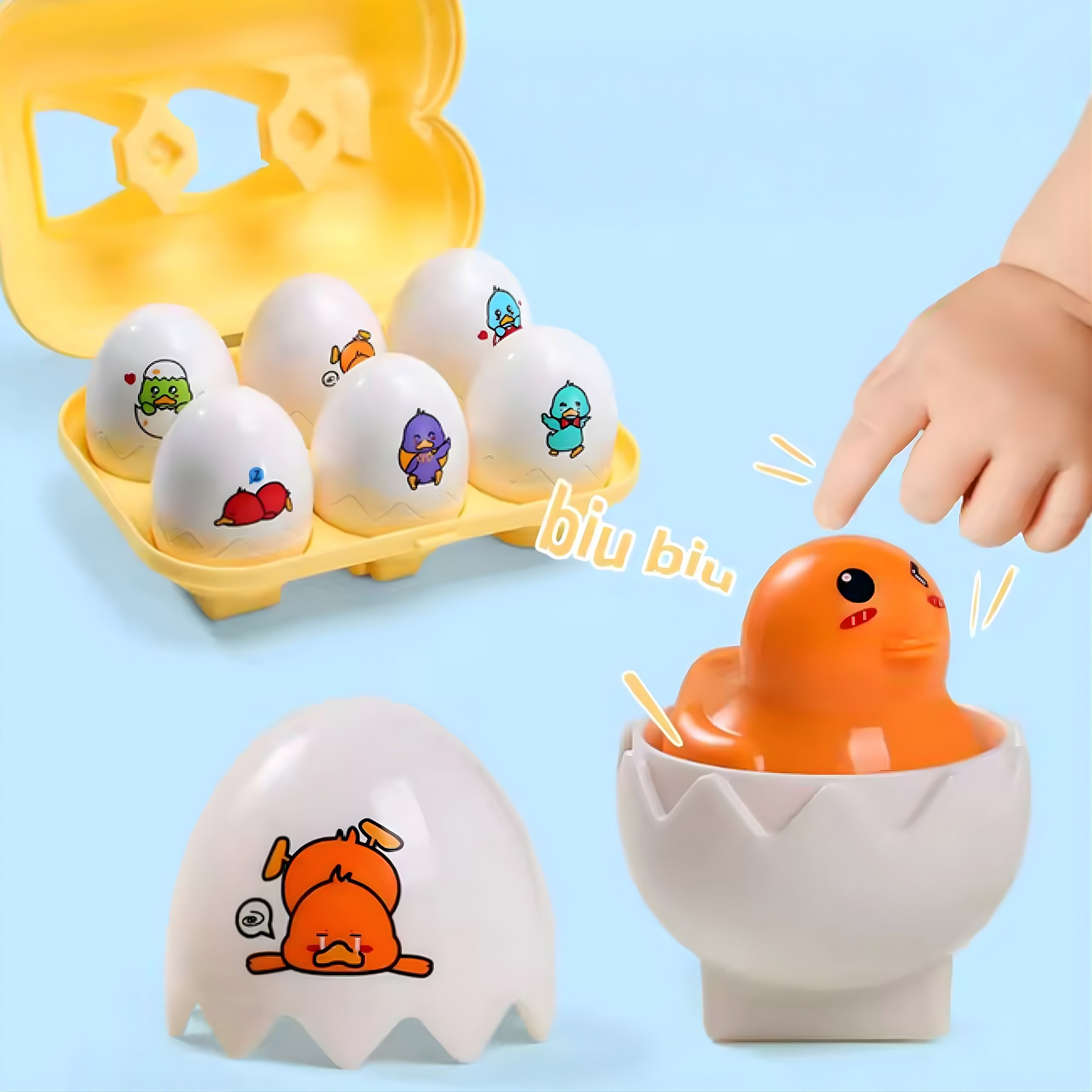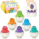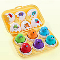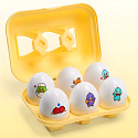 Białe jajka edukacyjne z kolorowymi naklejkami od marki Woopie wprowadzą Twoje dziecko w świat pełen kolorów, kształtów i zabawnych minek. Każde z sześciu uroczych jajeczek skrywa w środku kolorowego pisklaka z inną, śmieszną minką , po naciśnięciu na którego usłyszymy efekt dźwiękowy. Zadaniem malucha jest nie tylko dopasowanie odpowiedniej skorupki do jajka, ale przede wszystkim dopasowanie go do odpowiedniego miejsca w wytłaczance. Każde jajko ma na spodzie unikalny kształt geometryczny, który odpowiada jednemu otworowi w pudełku. Zabawne minki to świetny sposób, aby nauczyć dzieci rozpoznawania i nazywania emocji. Dzięki nim maluchy w łatwy i przyjemny sposób przyswajają, jak wyglądają i co oznaczają różne uczucia.To fantastyczny trening logicznego myślenia i koordynacji!