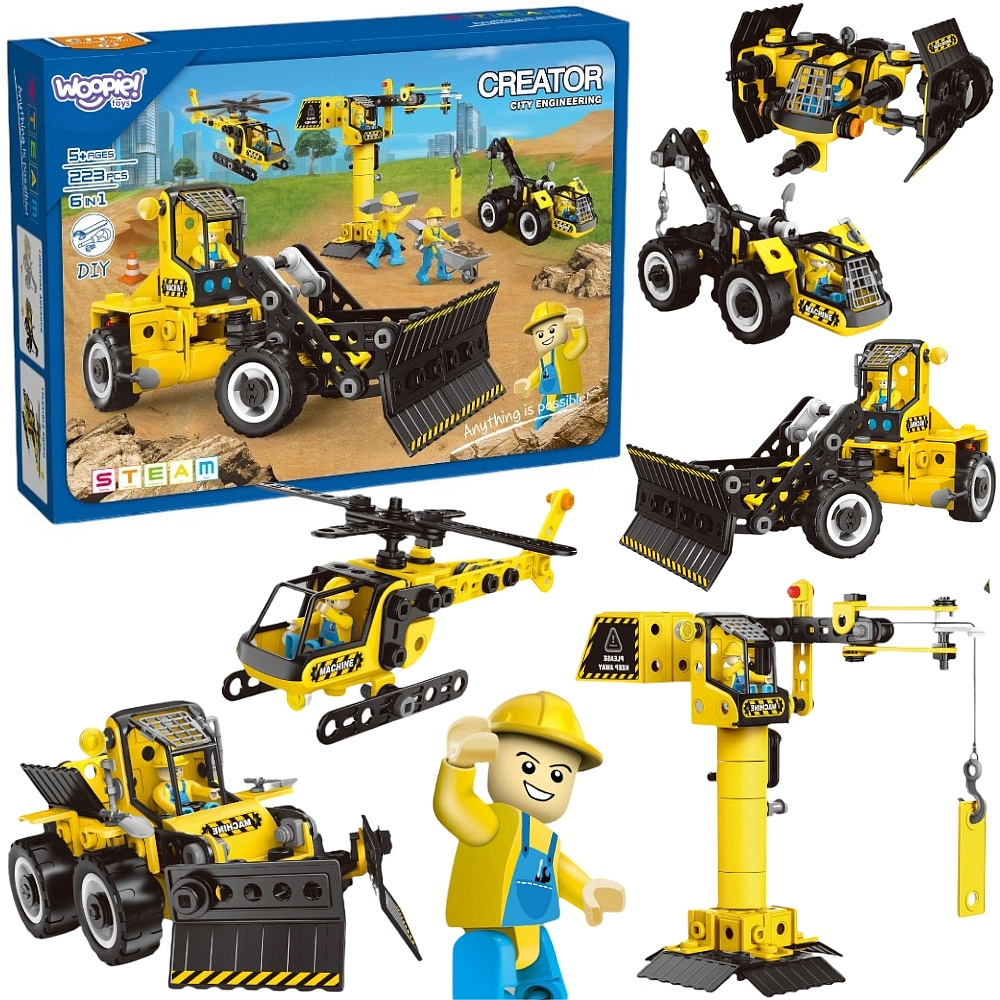 Zbuduj własne pojazdy i maszyny policyjne z serii CREATOR City Police Force! od marki Woopie Ten zestaw konstrukcyjny typu DIY to idealna propozycja dla małych inżynierów i pasjonatów budowania. Dzięki elementom STEAM dziecko rozwija kreatywność, logiczne myślenie oraz zdolności manualne. Z jednego kompletu można stworzyć aż 6 różnych modeli – od helikoptera po pojazdy terenowe z chwytakiem. To nie tylko zabawa, ale także świetna nauka i wprowadzenie w świat techniki.