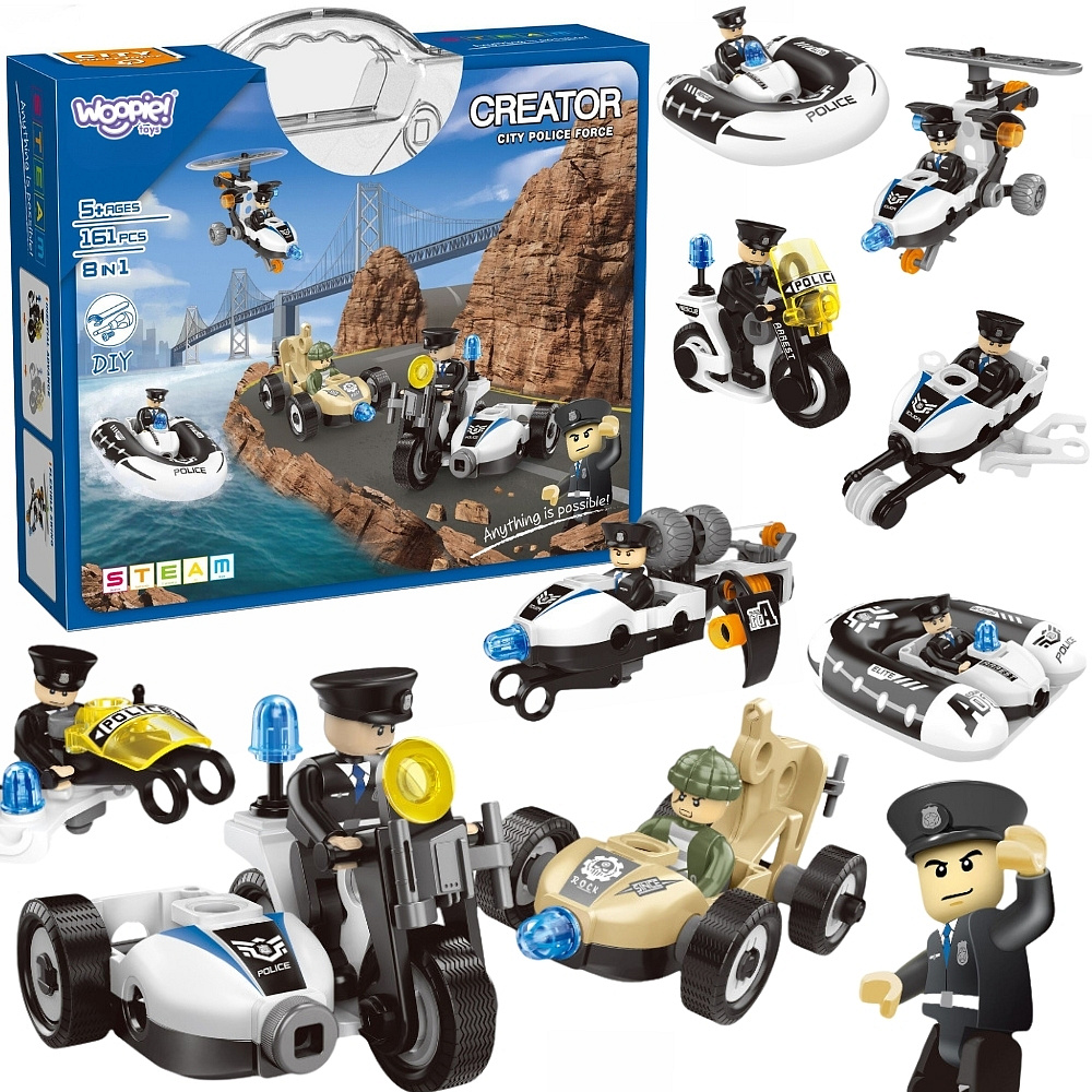 Zestaw klocków Creator City Police Force od marki Woopie pozwoli mu wcielić się w rolę odważnego policjanta i samodzielnie budować różne pojazdy – motocykle, auta terenowe, łodzie i quady. To świetna zabawa, która rozwija kreatywność, uczy logicznego myślenia i daje wiele godzin frajdy. Zestaw jest idealny dla fanów konstrukcji i policji, a przy tym świetnie sprawdzi się jako prezent. Wygodne pudełko z rączką pozwala zabrać zestaw wszędzie ze sobą!