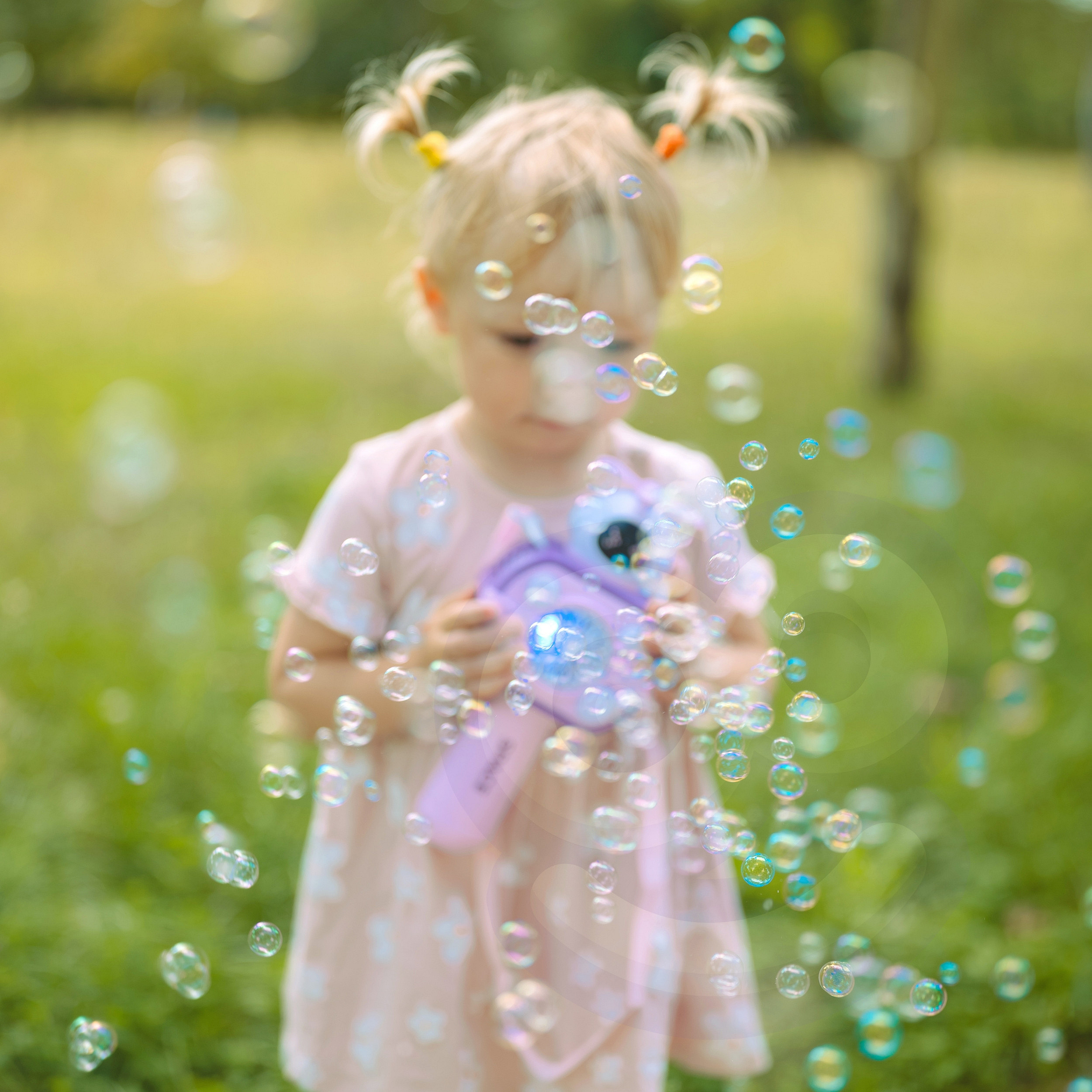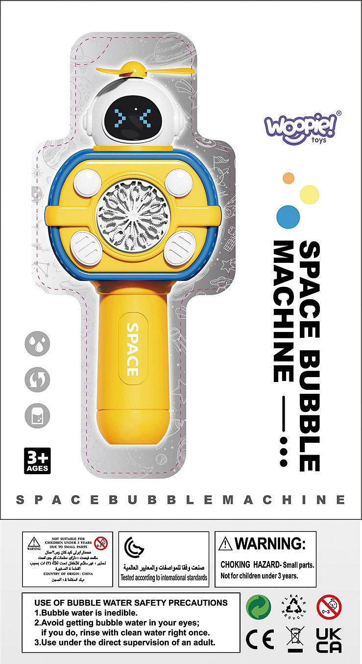 Maszyna do robienia baniek w kształcie astronauty marki WOOPIE to świetna zabawka dla dzieci. Wypuszczone bąbelki wystrzeliwane są nie tylko z dużą częstotliwością, ale dodatkowo zainstalowany wiatraczek wydmuchuje je jeszcze dalej. Zabawkę możemy włączyć wciskając przycisk i automatycznie maszyna będzie wypuszczać bańki. Zabawka posiada smycz którą dziecko może sobie zawiesić na szyje, spacerować i wypuszczać bańki bez wymogu wciskania jakiegokolwiek przycisku. Astronauta posiada efekty świetlne a dodatkowo w zestawie znajdziemy pojemniczek na płyn na bańki który przykręcamy w miejsce uchwytu a później zakładamy na to uchwyt. Zabawka idealnie sprawdzi się podczas zabawy na dworze oraz w domu.