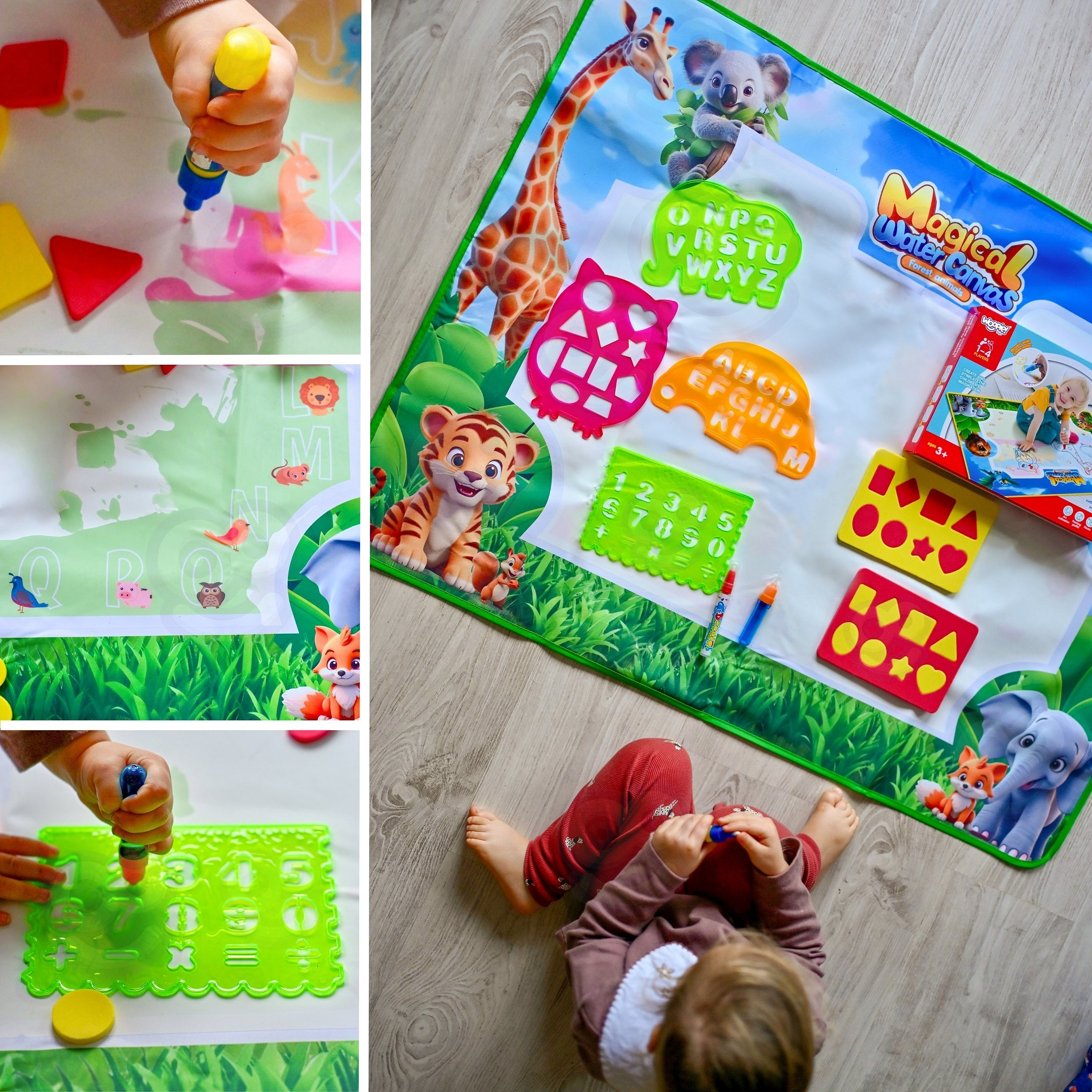 Mata do Malowania Wodą marki WOOPIE to edukacyjny zestaw artystyczny dla dzieci od 3 roku życia. Wystarczy napełnić dołączone pisaki czystą wodą, by odkrywać kolory, litery, liczby i kształty bez użycia tuszu i farb. Rysunki pojawiają się na chwilę, a po wyschnięciu znikają, zapraszając do kolejnej zabawy. Duży format 100×75 (cm) daje miejsce do wspólnego tworzenia, a wesoła grafika zwierząt z dżungli zachęca do nauki przez zabawę.
