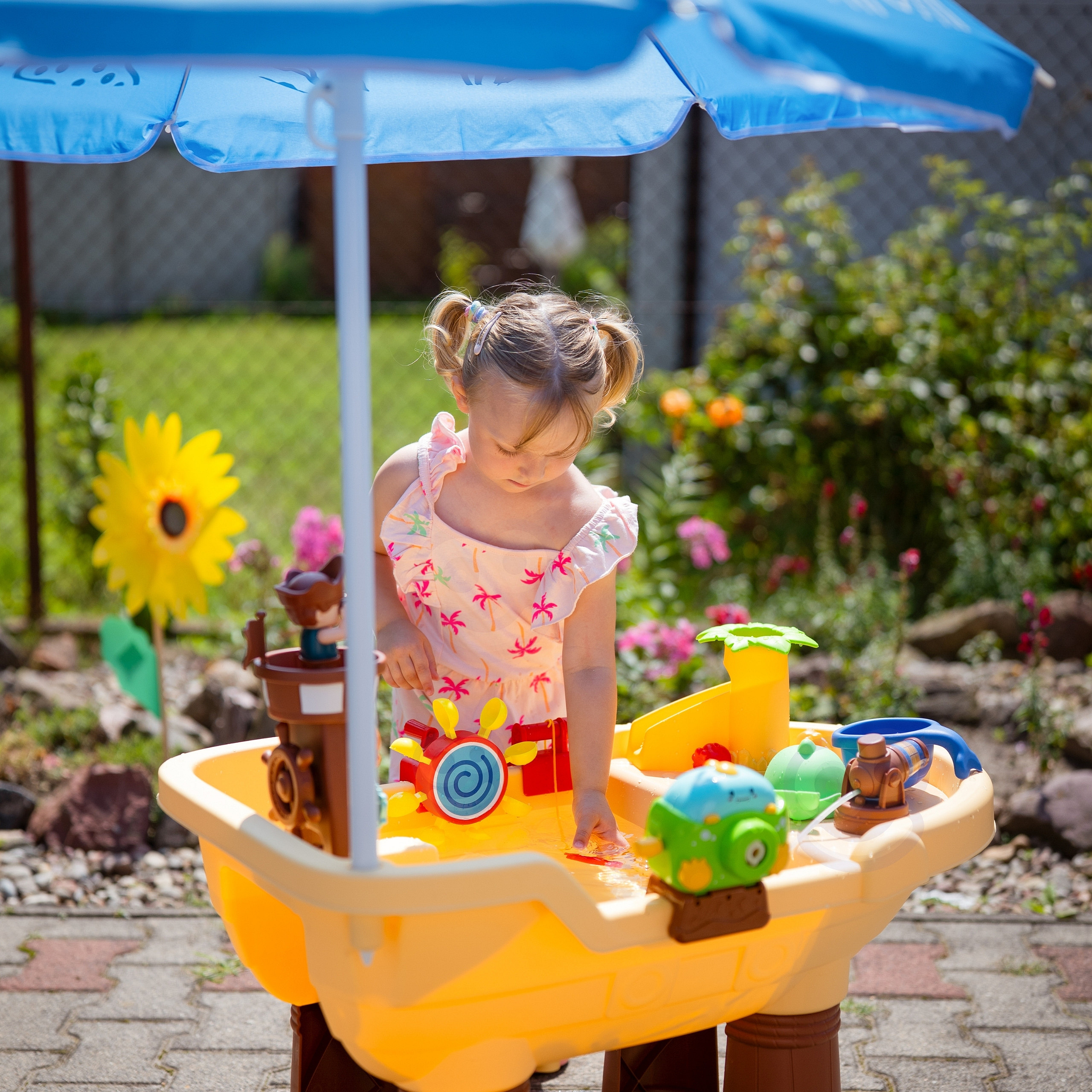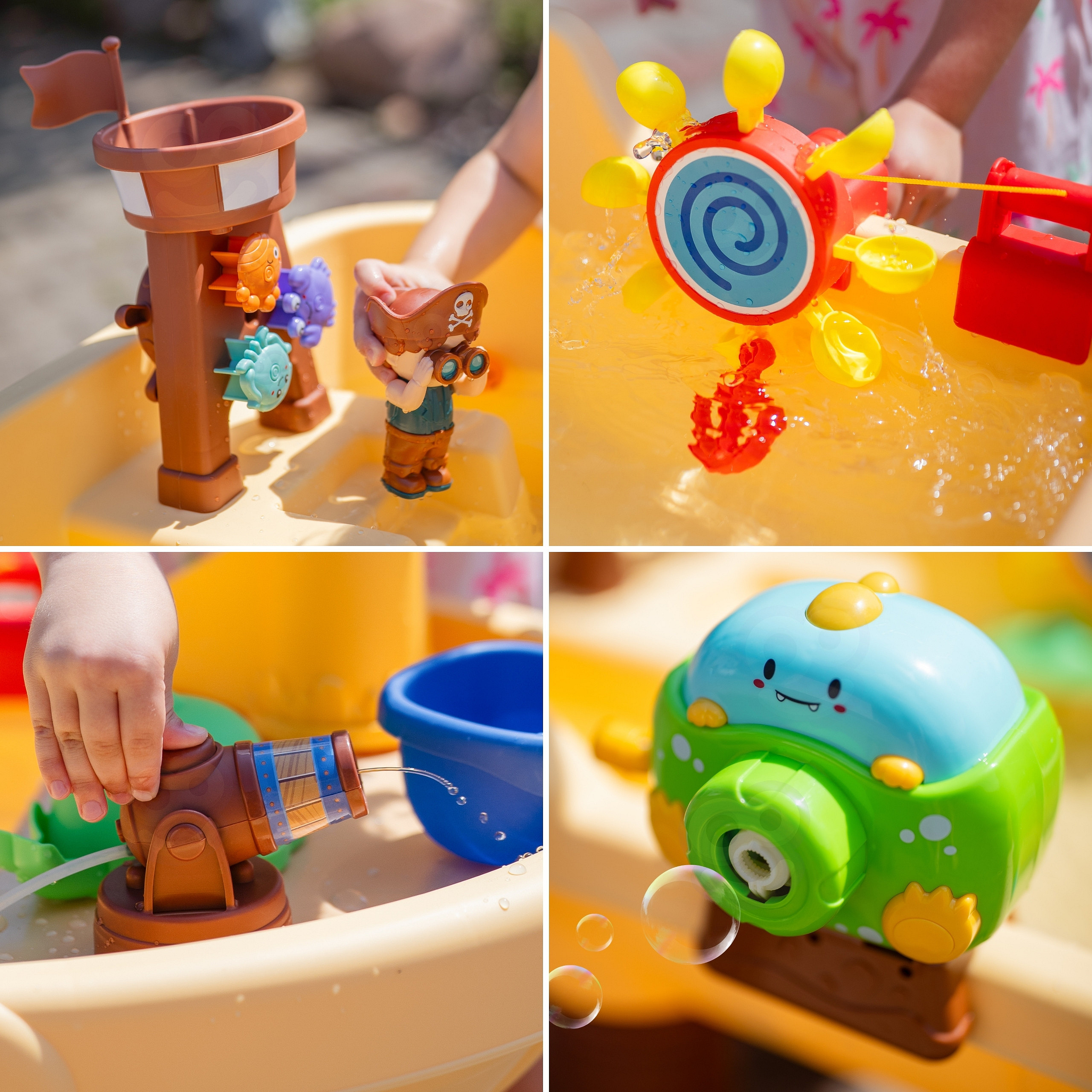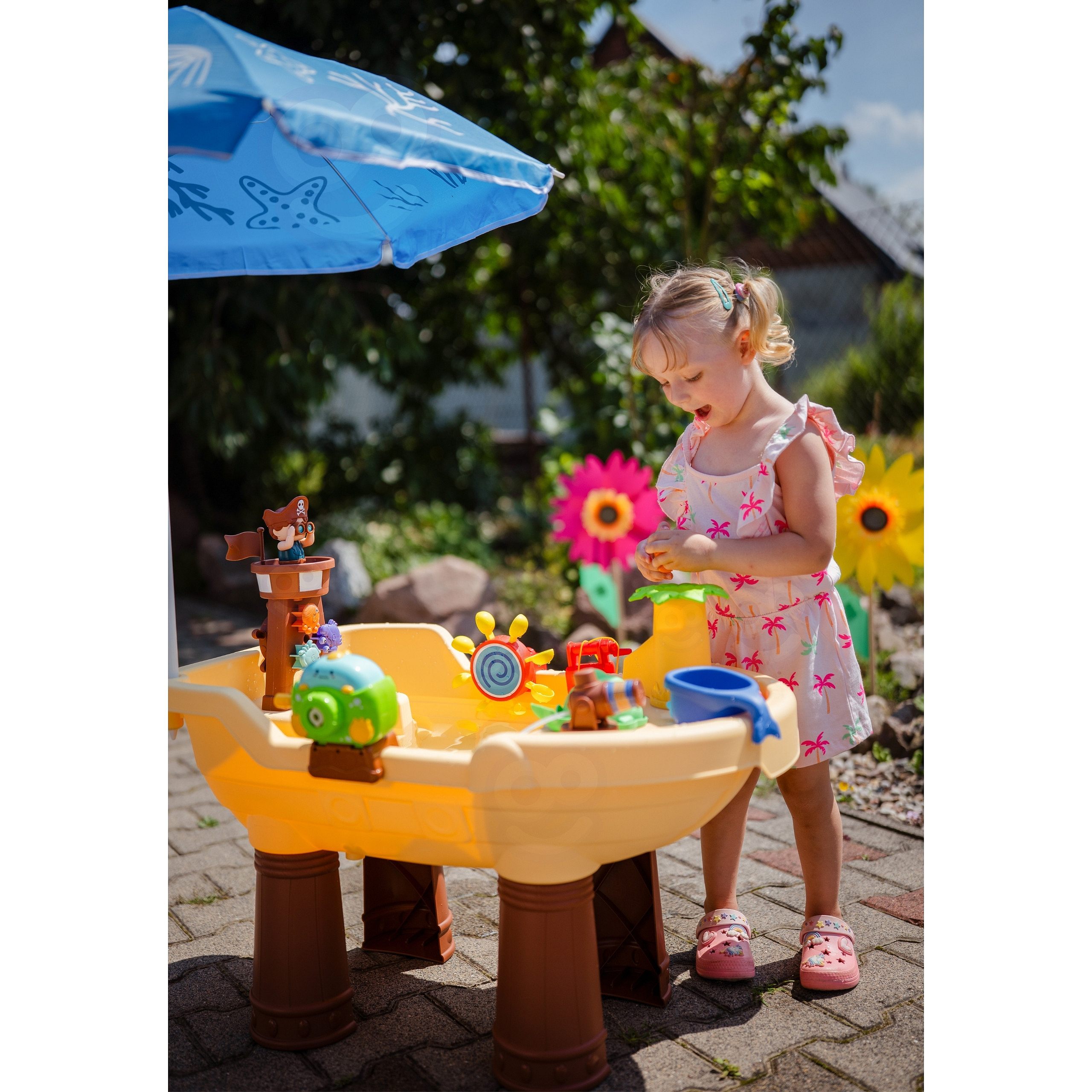 Vodní stolek Pirátská loď značky Woopie je úžasná hračka, která přenáší děti do světa pirátských dobrodružství a poskytuje hodiny kreativní zábavy na čerstvém vzduchu. Díky bohaté sadě barevných doplňků, pohyblivým prvkům a pirátské věži mohou děti experimentovat s vodou, hrát si s bublinkami, točit vodním kolem a objevovat spoustu možností zábavy. Přiložený slunečník umožní pohodlnou zábavu i v těch nejteplejších dnech. Jednoduchá, solidní konstrukce a velké rozměry zajišťují, že stolek je pohodlný a atraktivní i pro několik dětí současně.