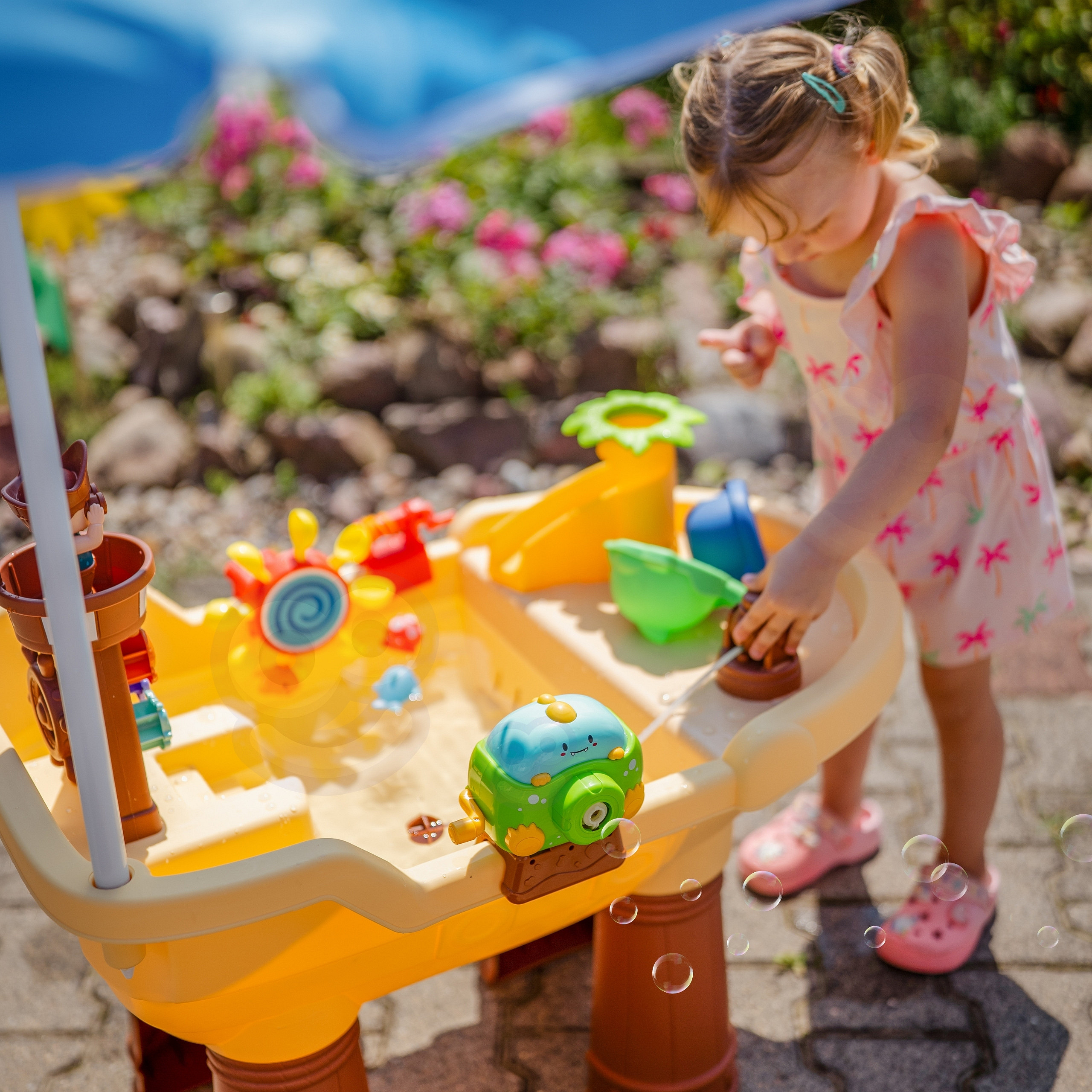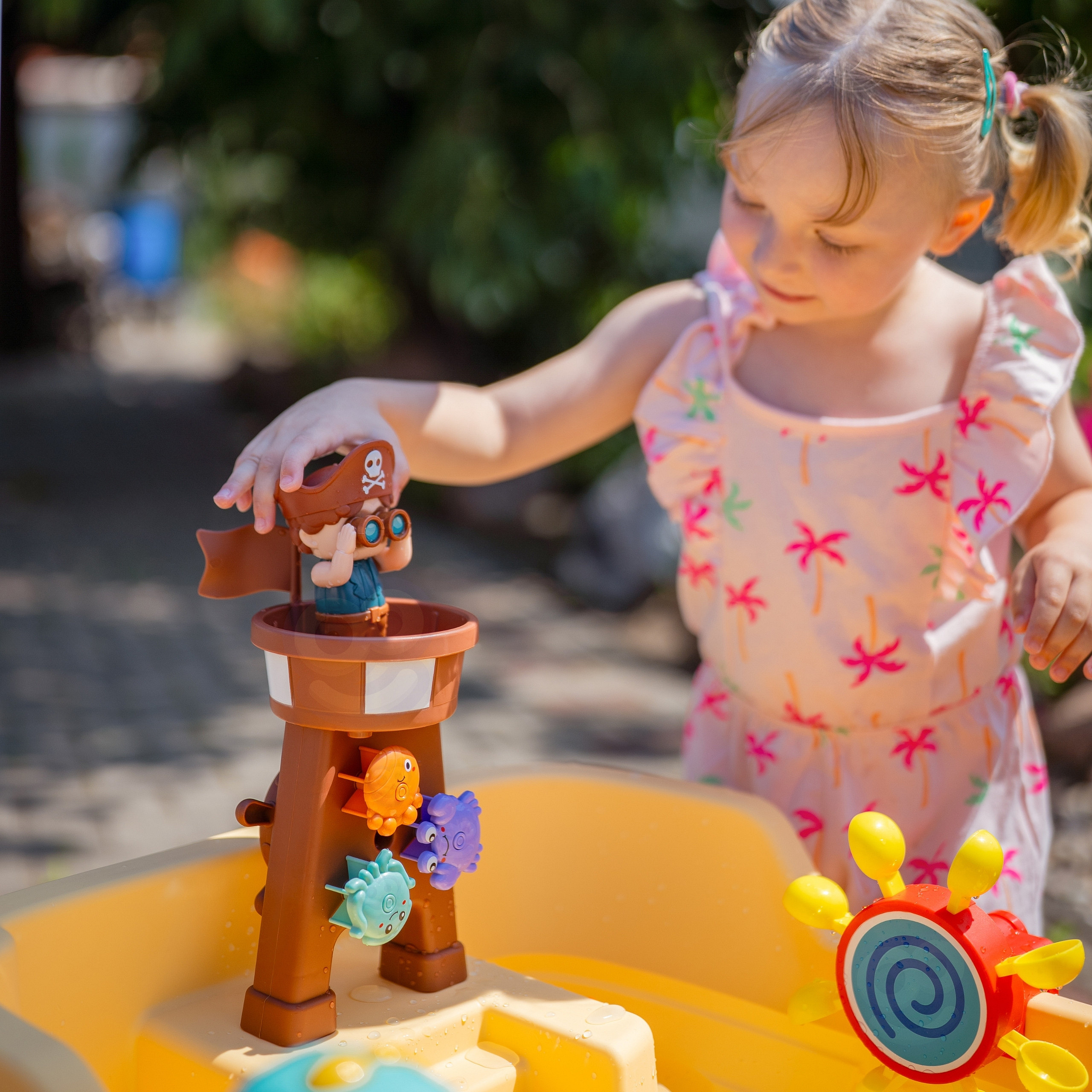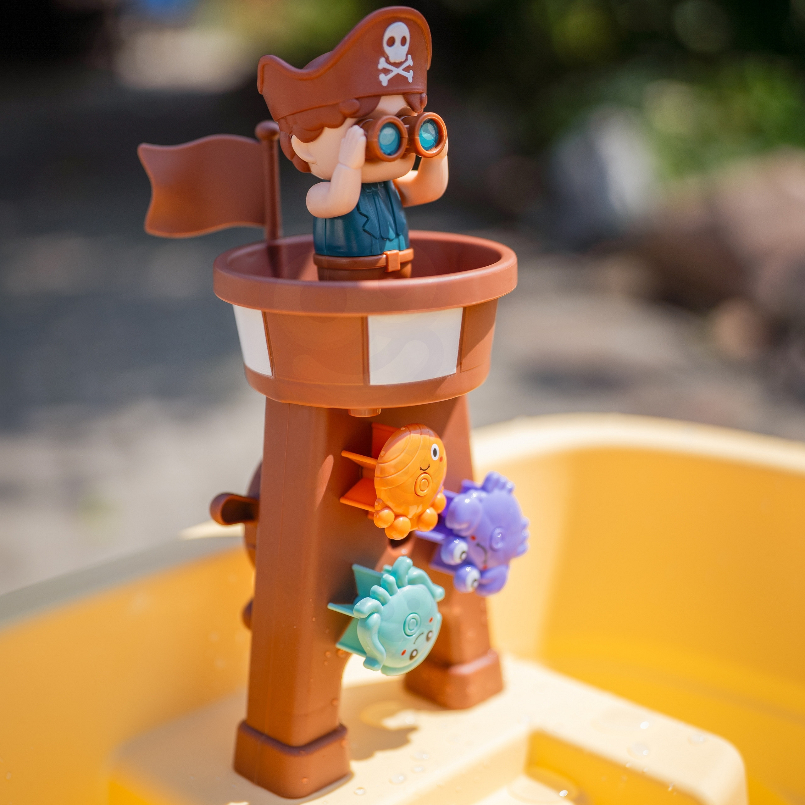 Vodní stolek Pirátská loď značky Woopie je úžasná hračka, která přenáší děti do světa pirátských dobrodružství a poskytuje hodiny kreativní zábavy na čerstvém vzduchu. Díky bohaté sadě barevných doplňků, pohyblivým prvkům a pirátské věži mohou děti experimentovat s vodou, hrát si s bublinkami, točit vodním kolem a objevovat spoustu možností zábavy. Přiložený slunečník umožní pohodlnou zábavu i v těch nejteplejších dnech. Jednoduchá, solidní konstrukce a velké rozměry zajišťují, že stolek je pohodlný a atraktivní i pro několik dětí současně.